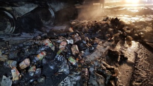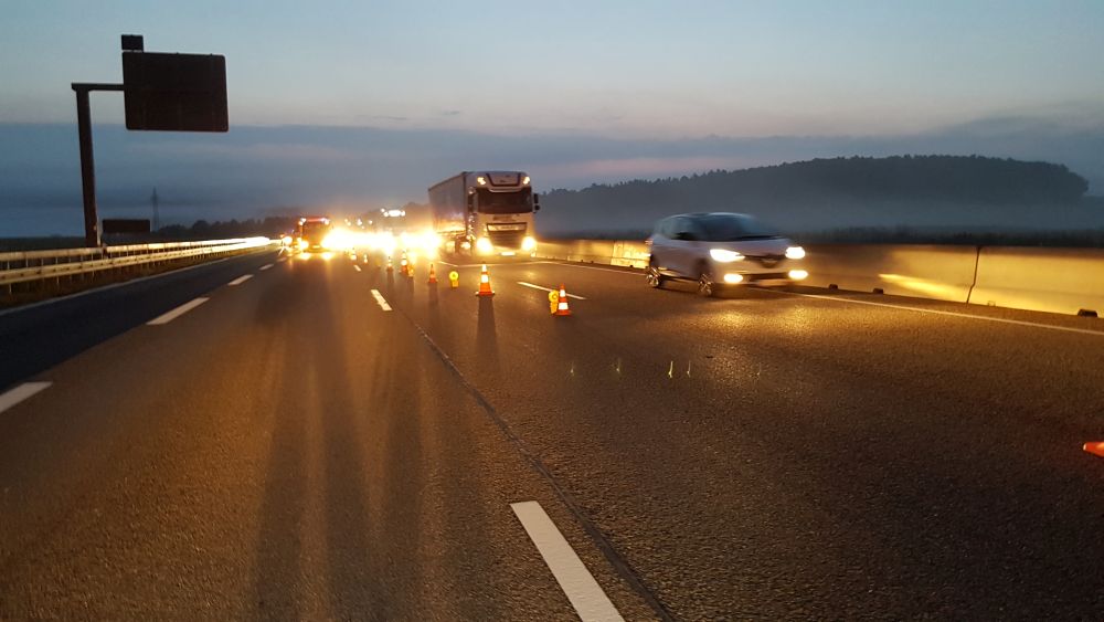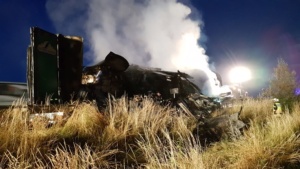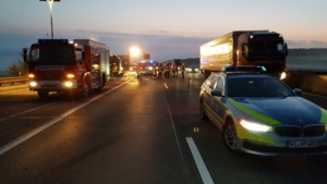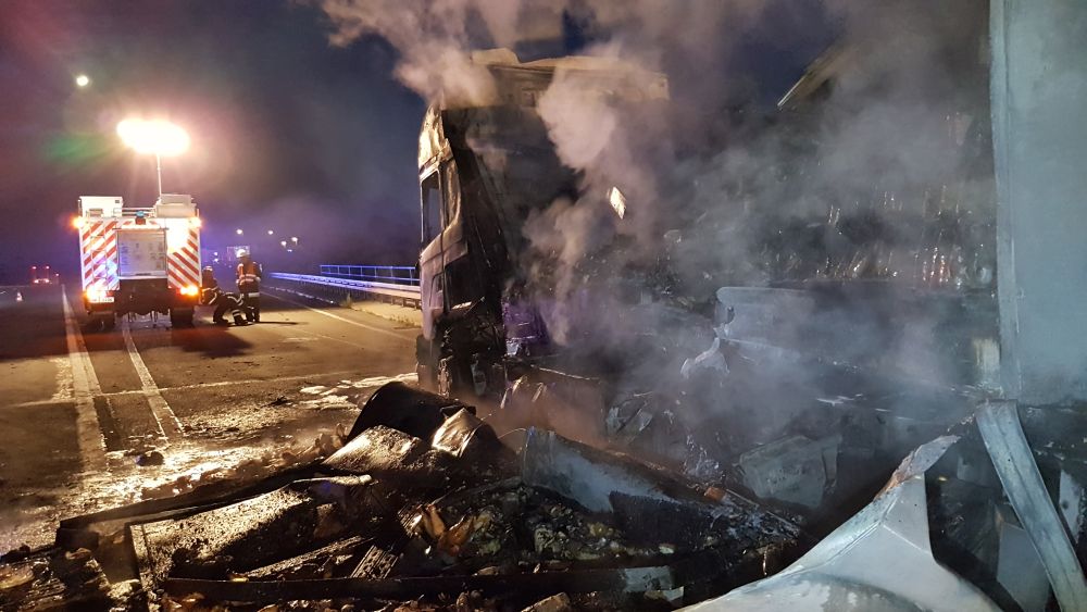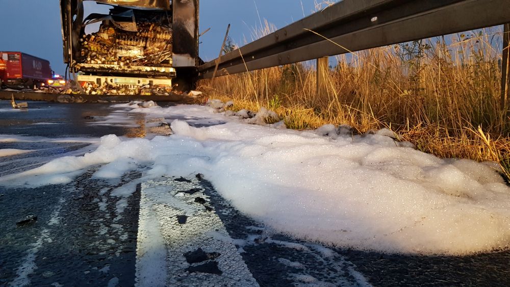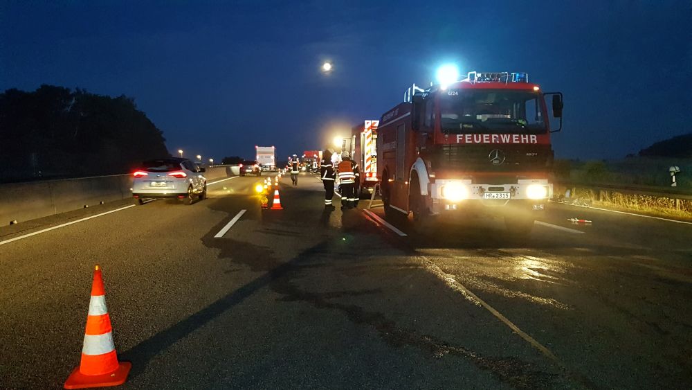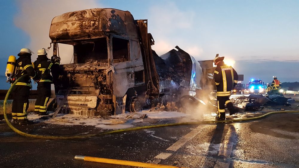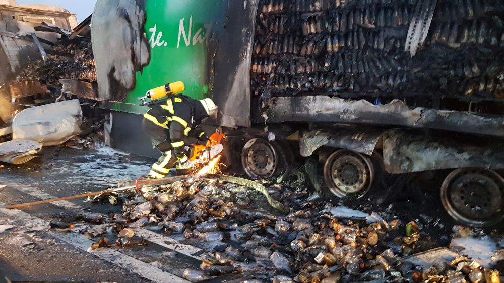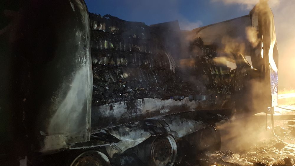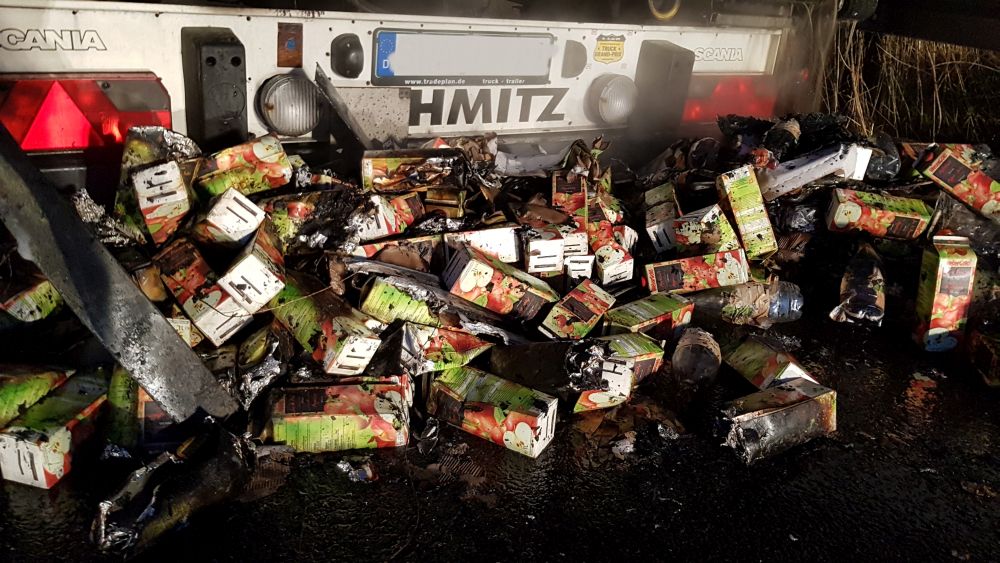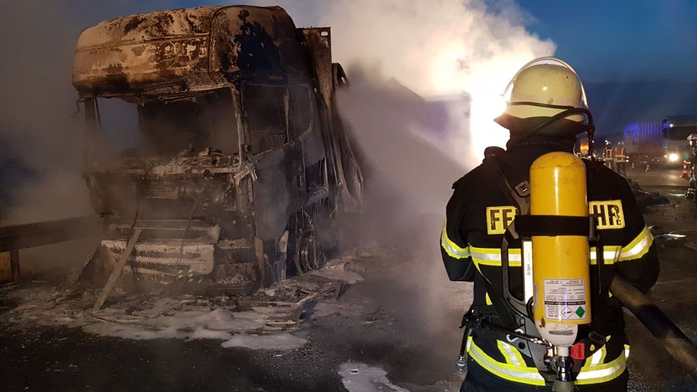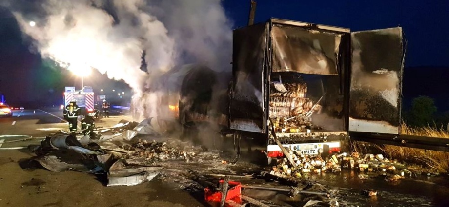 Hierzu kam er jedoch nicht mehr. Der Mann konnte den LKW gerade noch auf dem Standstreifen abstellen. Kurze Zeit später stand der Sattelauflieger bereits im Vollbrand. Während der Löscharbeiten durch die Feuerwehr Melsungen musste die Autobahn kurzzeitig komplett gesperrt werden. Wenig später konnte zumindest eine Fahrspur wieder für den Verkehr frei gegeben werden. Der Fahrer brachte sich rechtzeitig in Sicherheit und wurde glücklicherweise nicht verletzt. Trotz des reibungslosen Ablaufes bei den Löschmaßnahmen kommt es dennoch immer wieder zu Problemen mit der Wasserzufuhr auf der Autobahn. Aus diesem Grund wurde ein Tankfahrzeug der Feuerwehr Homberg nachalarmiert. Am LKW entstand ein Totalschaden der über 100.000 Euro liegen wird. Im Auflieger befanden sich PET Getränkepackungen mit verschiedenen Säften, die beim Brand ebenfalls komplett zerstört wurden. Die Löscharbeiten zogen sich bis in die frühen Morgenstunden hin. Was genau der Grund für den Brand sein könnte, steht aktuell noch nicht fest.