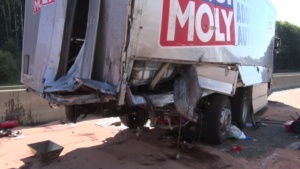 Danach hatte er noch so viel Schwung, dass er in einen weiteren LKW krachte, um dann seitlich mit total zerstörtem Fahrerhaus stehen zu bleiben. Nach Angaben der Feuerwehr war das Fahrerhaus rund 50% eingedrückt. Der Fahrer musste mit hydraulischem Gerät aus den Trümmern befreit werden. Der eingeklemmte Mann wurde dann nach einer Erstversorgung an der Unfallstelle mit dem Rettungshubschrauber Christoph 28 aus Fulda in ein Krankenhaus eingeliefert.  Mehr als Glück hatte eine vierköpfige polnische Familie, die nur knapp einer Katastrophe entgangen war. Mit ihrem PKW konnten sie sich nur mit knapper Not einen Weg durch das Trümmerfeld bahnen, ohne selbst verletzt zu werden. Der Fahrer sagte er hätte nichts mehr gesehen und blind durch eine Staubwolke gefahren. Sie kamen alle mit dem Schrecken davon.  Es wird wohl noch einige Zeit dauern, bis die KLW geborgen und die Autobahn wieder frei ist. Zu allem Übel hatte ein LKW Öl geladen, was an der Unfallstelle auslief. Zum Einsatz kam die Feuerwehr Homberg Efze. Durch den Unfall kam es zu kilometerlangen Staus auch auf den Umleitungsstrecken.