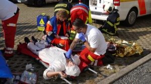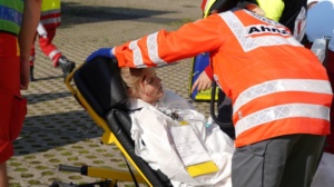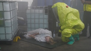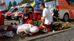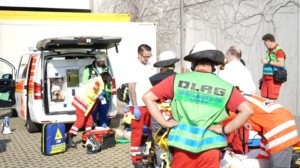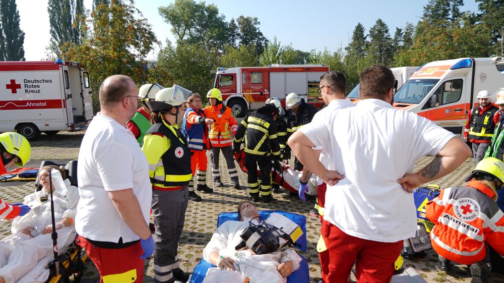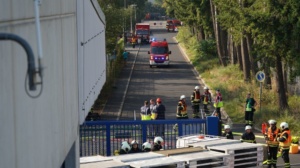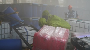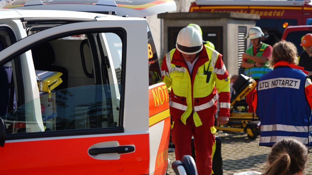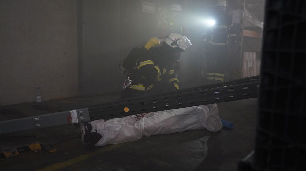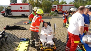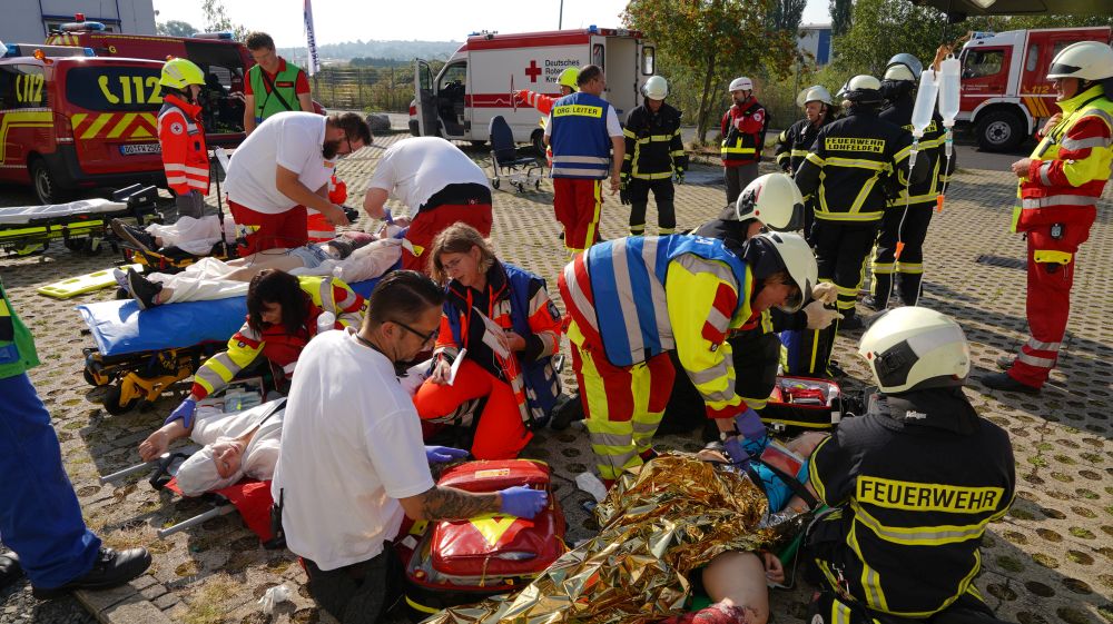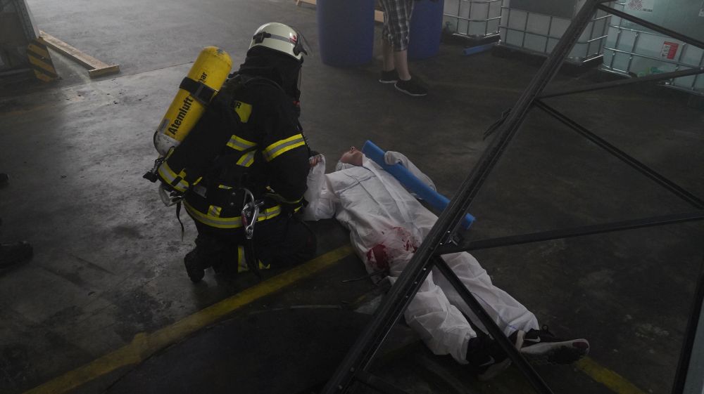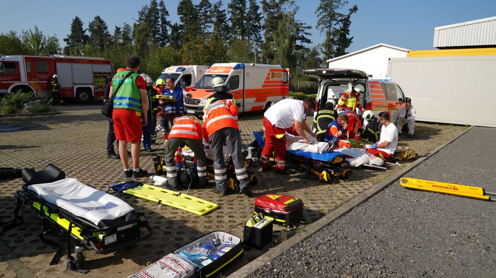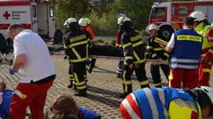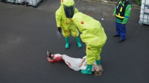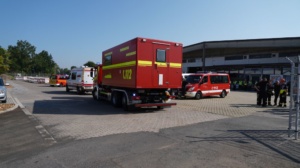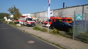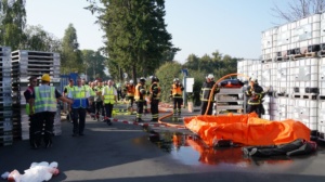 Am Samstagvormittag war dann im Rahmen einer solchen Übung ein Stablerfahrer damit beschäftigt Behälter in Regalen zu ordnen. Hierbei übersah er offensichtlich beim Rangieren ein Hochregal und krachte dagegen. Zu allem Unglück verlor er dann auch noch die Kontrolle über sein Fahrzeug und fuhr in eine Gruppe mit Chemikalien gefüllte Fässer und begrub mehrere Personen darunter. Durch die Wucht des Aufpralls kippte auch das Hochregal um, Fässer und Behälter stürzten zu Boden und verletzte Menschen, die in den Trümmern liegen blieben. Sofort wurden Rettungskräfte alarmiert, die nun die Aufgabe hatten nicht nur 10 verletzte Menschen in Sicherheit zu bringen, sondern auch noch auslaufende Gefahrstoffe zu analysieren und eine mögliche Kontaminierung der Umwelt zu verhindern. Bei solch großen Einsätzen und Chemie Unfällen kommt die Analytische Task Force kurz ATF aus Dortmund zum Einsatz. Deren Aufgabe ist es nun die chemischen Stoffe zu analysieren und möglichen Gefahren einzuschätzen. Auch wenn in Chemiewerken die Lagerung von Stoffen so gewählt ist, dass im Falle eines Unfalls ein Mischen der Stoffe nicht unweigerlich zur Katastrophe führt, reagieren viele Chemikalien unterschiedlich in Verbindung von Luft und Wasser. Es wurde ein Sammelpunkt eingerichtet, um die aus dem Gefahrenbereich gebrachten und verletzten Personen ärztlich zu versorgen und anschließend in umliegende Krankenhäuser einzuliefern. Teilweise mussten Personen unter schwerem Atemschutz aus dem Gebäude gerettet werden. An dieser Übung nahmen rund 190 Einsatzkräfte aus Nordhessen teil. In wie weit die Verantwortlichen mit den Maßnahmen der der Helfer zufrieden waren, wird sich erst im Rahmen von Nachbesprechungen zeigen.