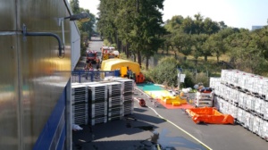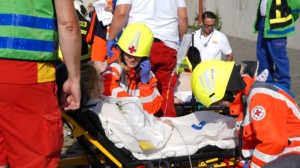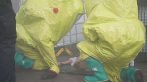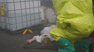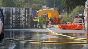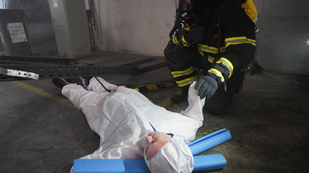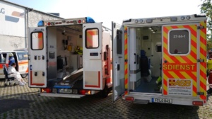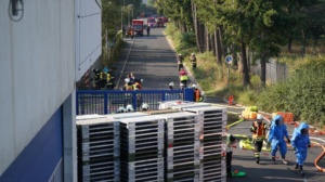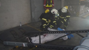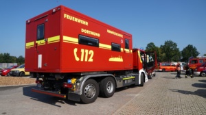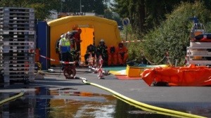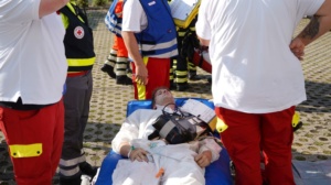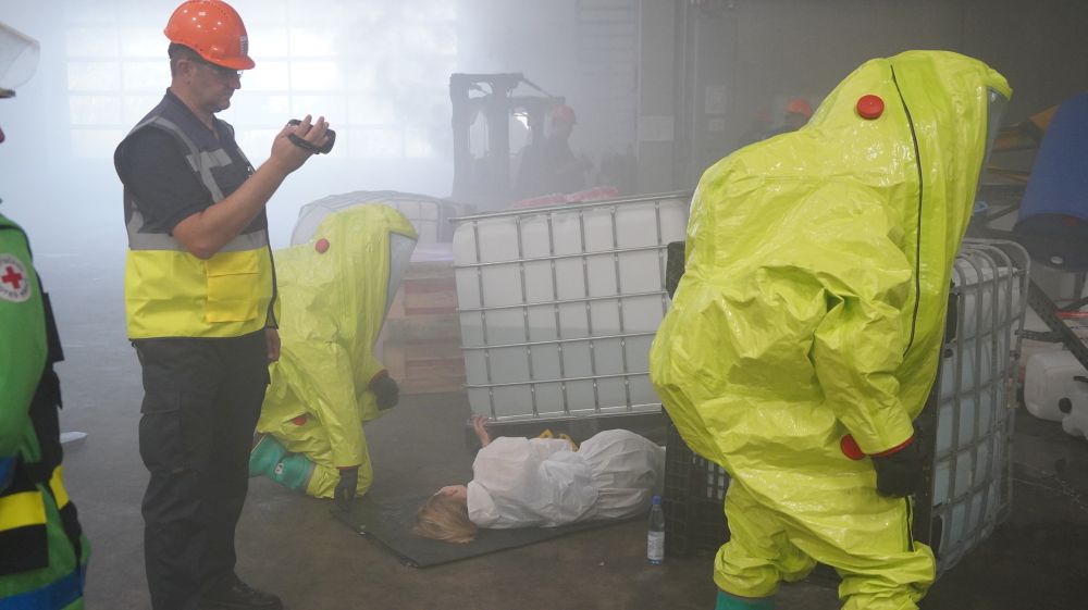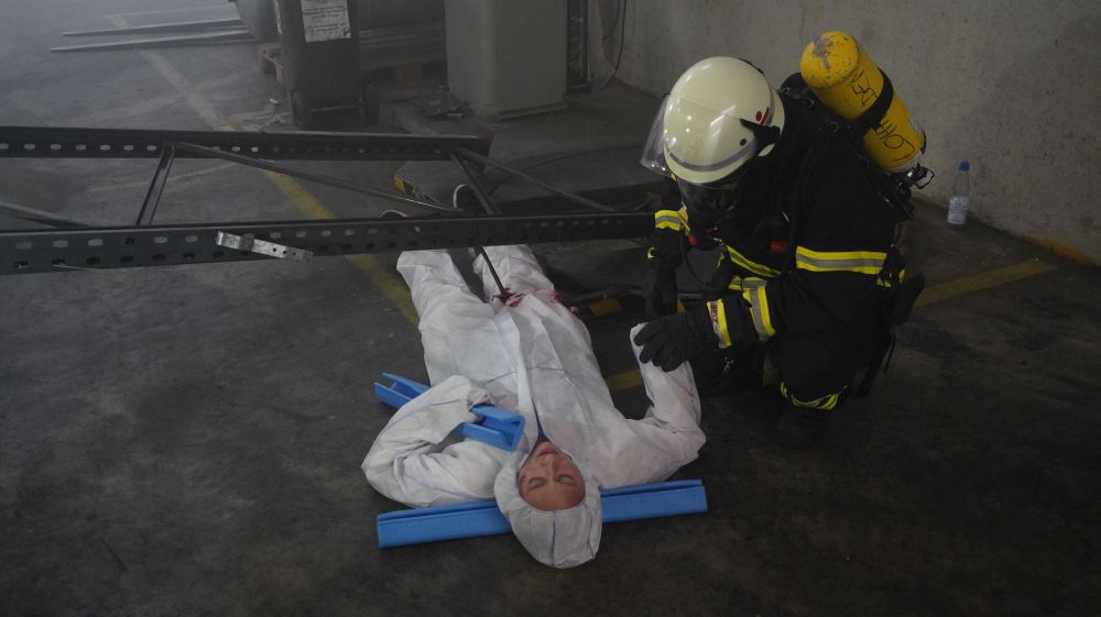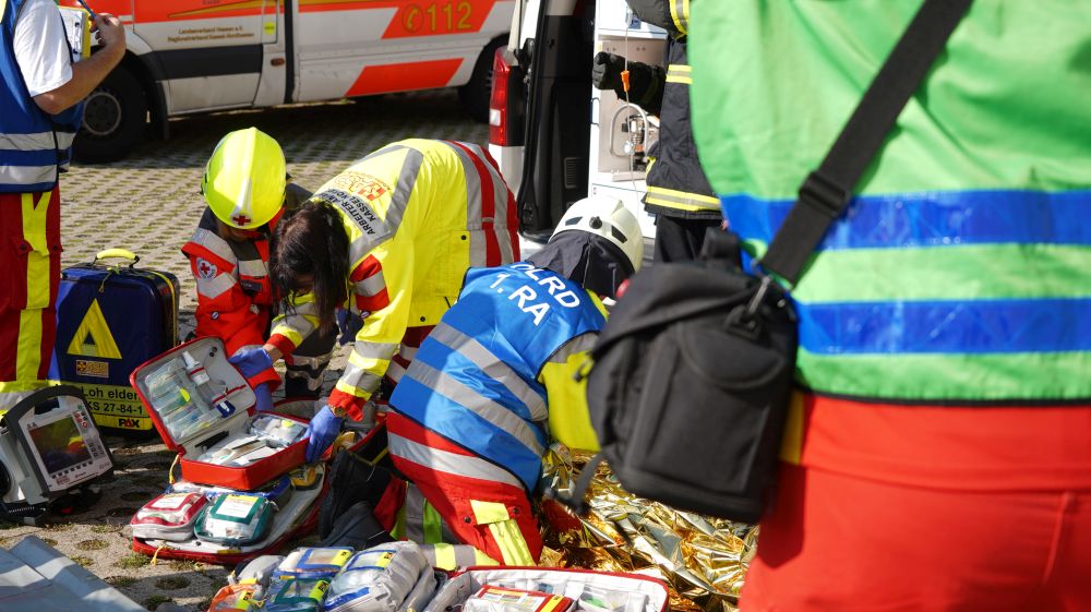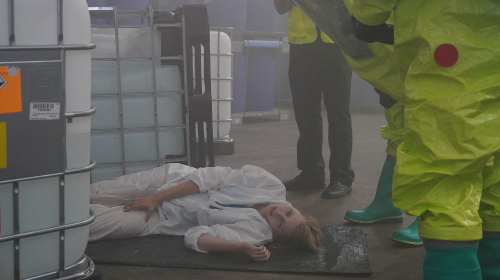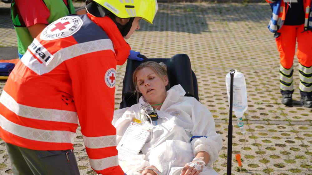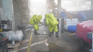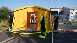 Am Samstagvormittag war dann im Rahmen einer solchen Übung ein Stablerfahrer damit beschäftigt Behälter in Regalen zu ordnen. Hierbei übersah er offensichtlich beim Rangieren ein Hochregal und krachte dagegen. Zu allem Unglück verlor er dann auch noch die Kontrolle über sein Fahrzeug und fuhr in eine Gruppe mit Chemikalien gefüllte Fässer und begrub mehrere Personen darunter. Durch die Wucht des Aufpralls kippte auch das Hochregal um, Fässer und Behälter stürzten zu Boden und verletzte Menschen, die in den Trümmern liegen blieben. Sofort wurden Rettungskräfte alarmiert, die nun die Aufgabe hatten nicht nur 10 verletzte Menschen in Sicherheit zu bringen, sondern auch noch auslaufende Gefahrstoffe zu analysieren und eine mögliche Kontaminierung der Umwelt zu verhindern. Bei solch großen Einsätzen und Chemie Unfällen kommt die Analytische Task Force kurz ATF aus Dortmund zum Einsatz. Deren Aufgabe ist es nun die chemischen Stoffe zu analysieren und möglichen Gefahren einzuschätzen. Auch wenn in Chemiewerken die Lagerung von Stoffen so gewählt ist, dass im Falle eines Unfalls ein Mischen der Stoffe nicht unweigerlich zur Katastrophe führt, reagieren viele Chemikalien unterschiedlich in Verbindung von Luft und Wasser. Es wurde ein Sammelpunkt eingerichtet, um die aus dem Gefahrenbereich gebrachten und verletzten Personen ärztlich zu versorgen und anschließend in umliegende Krankenhäuser einzuliefern. Teilweise mussten Personen unter schwerem Atemschutz aus dem Gebäude gerettet werden. An dieser Übung nahmen rund 190 Einsatzkräfte aus Nordhessen teil. In wie weit die Verantwortlichen mit den Maßnahmen der der Helfer zufrieden waren, wird sich erst im Rahmen von Nachbesprechungen zeigen.