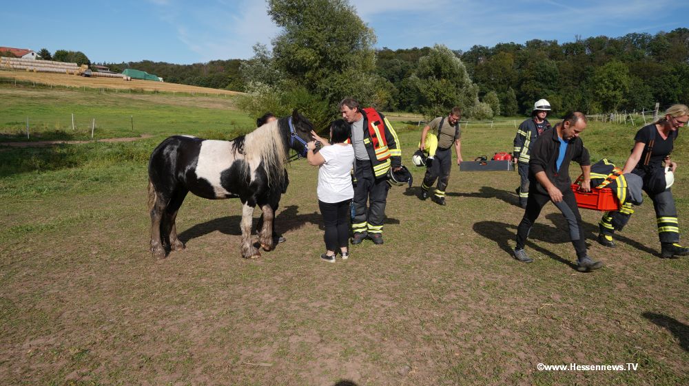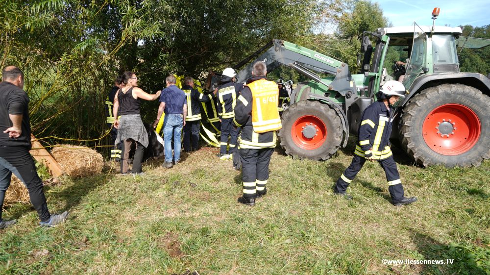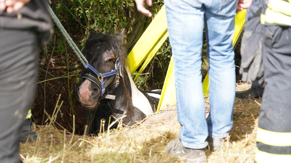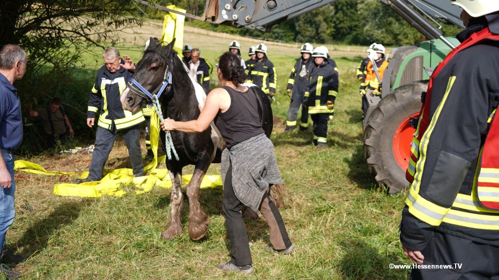 Ein Landwirt kam dann mit einem Frontlader zu Hilfe und konnte so das Pferd wieder befreien. Augenscheinlich hat das Tier keinen Schaden genommen, wird aber von einem Veterinär untersucht. Auch die Berufsfeuerwehr Kassel wurde mit Kran und einem speziellen Hebemittel für große Tiere angefordert, konnte dann aber die Fahrt abbrechen. Zum Einsatz kamen die Feuerwehren Wolfhagen, Viesebeck, Ehringen und Niederelsungen.