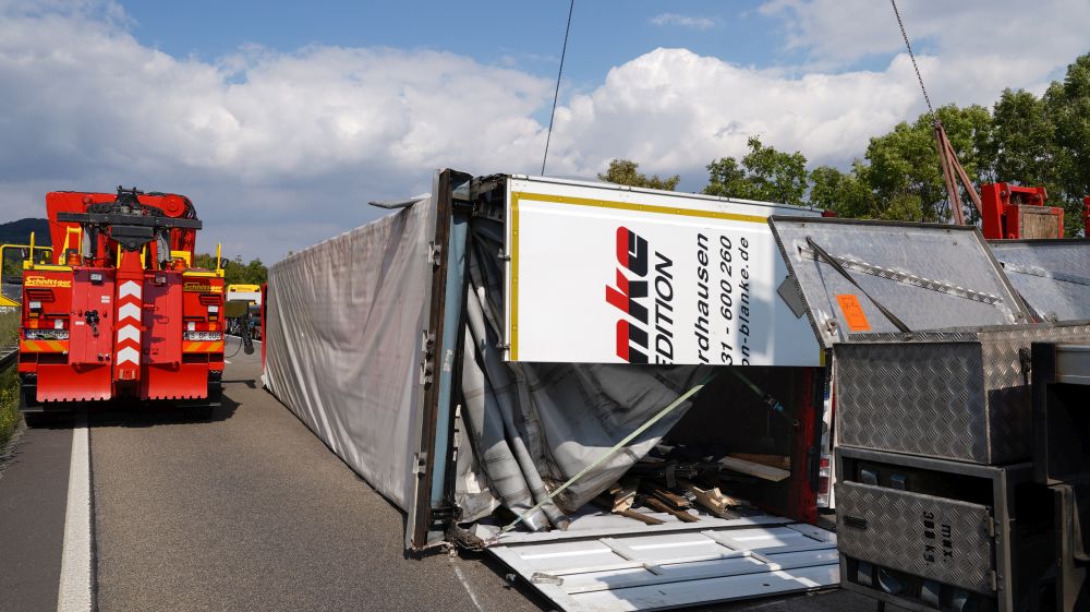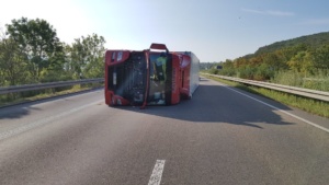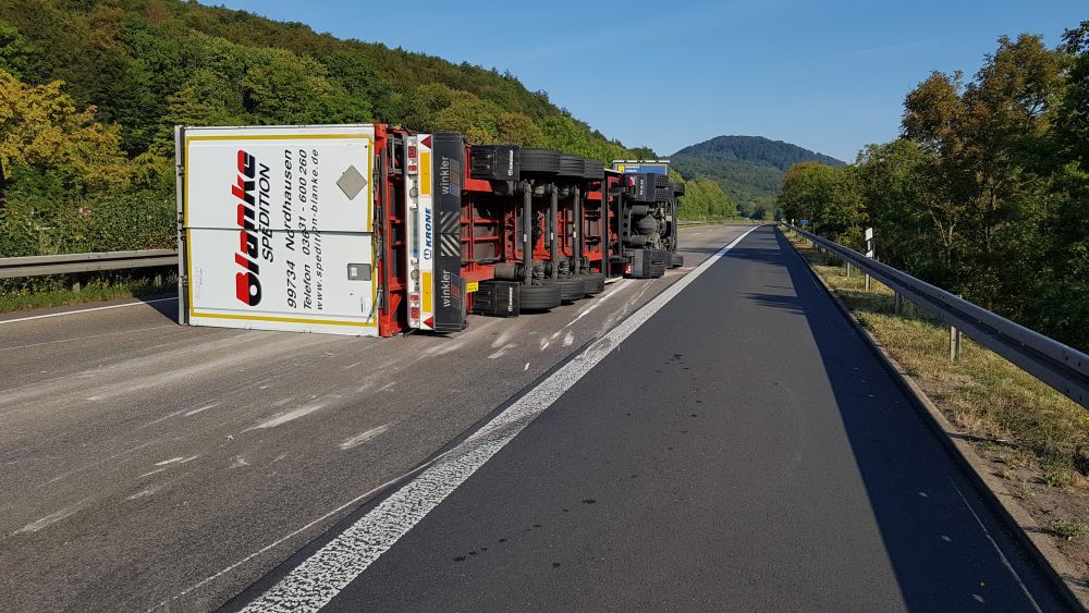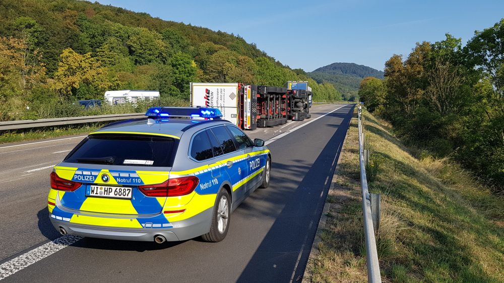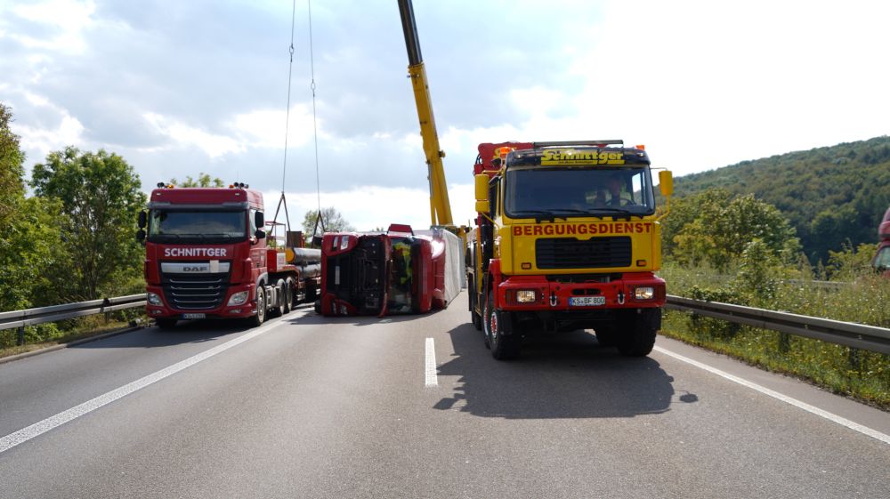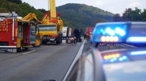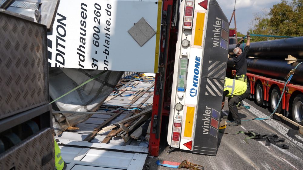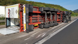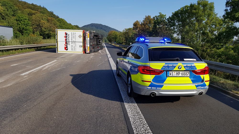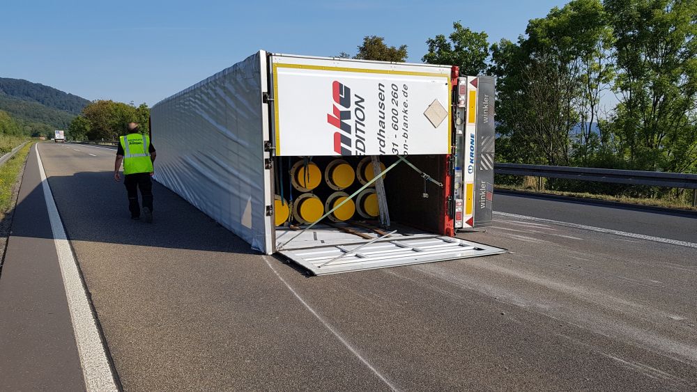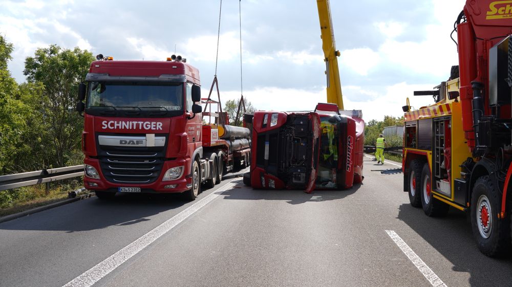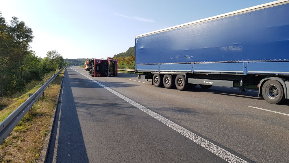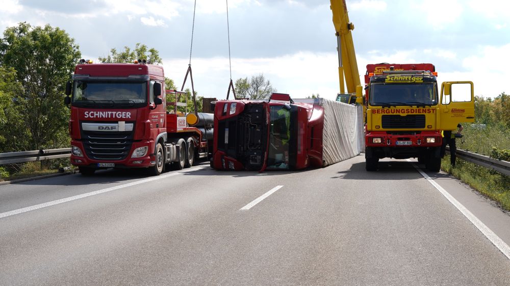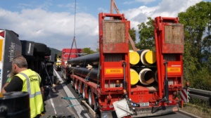 Sein Gegenlenken sorgte dann dafür, dass der LKW auf die Fahrbahn kippte und seitlich liegen blieb. Der Fahrer wurde nach letzten Informationen nur leicht verletzt, kam aber zur weiteren Untersuchung in ein Krankenhaus. Der Auflieger hatte große Kunststoffrohre geladen, die vor der Bergung des LKW erst einzeln mit viel Aufwand entladen werden mussten. Durch den Unfall kam es zu Kilometerlangen Staus. Viele LKW -Fahrer versuchten den Stau zu umfahren, was auch die Umgehungsstraßen komplett überlastete. Schlechte Nachrichten auch für vorbeifahrende Gaffer, die der Meinung waren den Unfall mit dem Handy zu filmen. Die Polizei hat die Übeltäter im Nachhinein aus dem Verkehr herausgezogen. Sie müssen jetzt mit 100.- Euro Bußgeld und einem Punkt in der Verkehrssünderkartei rechnen. Gegen 14.30 Uhr war dann die Fahrbahn wieder für den Verkehr frei gegeben. Nach Angaben der Polizei wird der Gesamtschaden mit rund 40.000.- Euro beziffert.