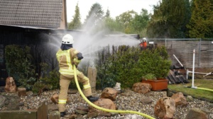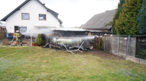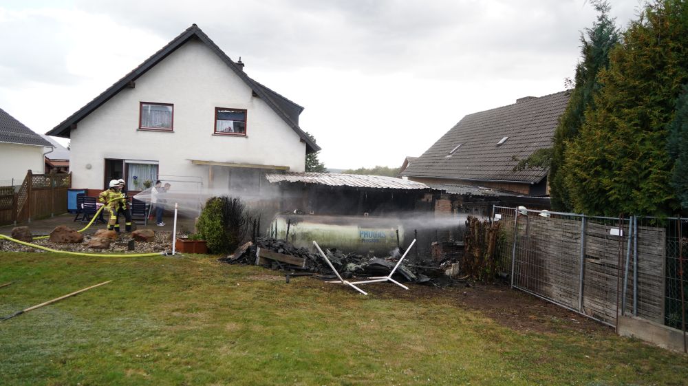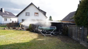 Staufenberg – Am Mittwochnachmittag kam es gegen 14.40 Uhr in Staufenberg-Sichelnstein an der Hessisch-Niedersächsischen Grenze zu einem Großeinsatz der Feuerwehr aus der gesamten Umgebung. Die Feuerwehr wurde zum Brand einer Gartenlaube gerufen. Bei Ankunft stand diese Laube auch in Vollbrand, jedoch befand sich in unmittelbarer Nähe auch ein großer Gastank. Anwohner berichten von einer rund 18 Meter hohen Stichflamme, weil sich das Gas offensichtlich entzündet hatte. Die Feuerwehr kühlte den Behälter jedoch sehr zeitnah ab und konnte so schlimmeres verhindern.