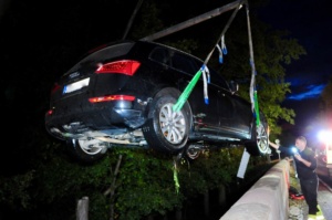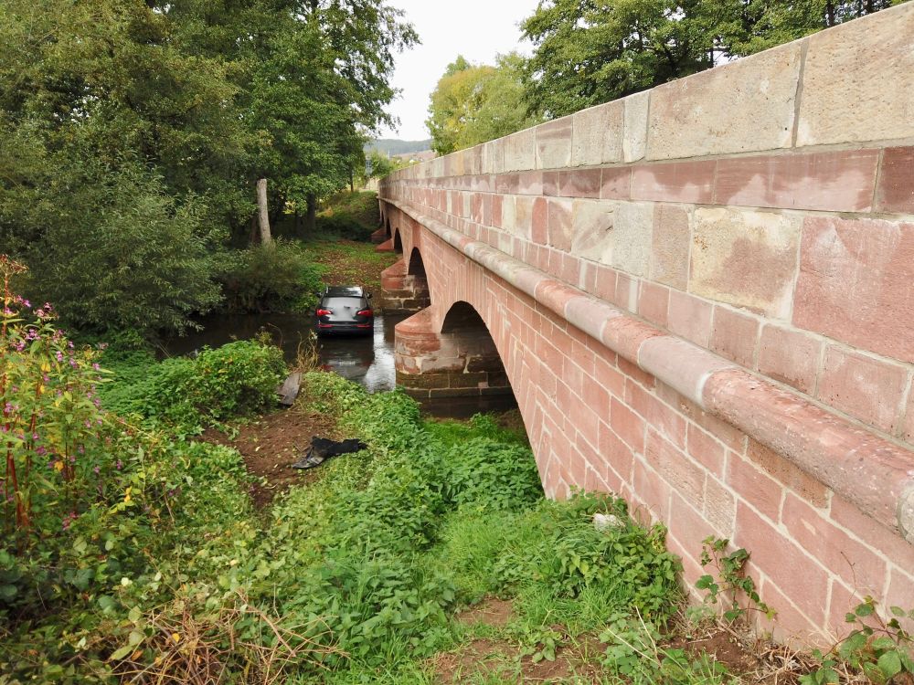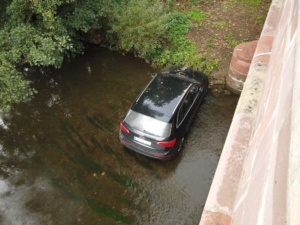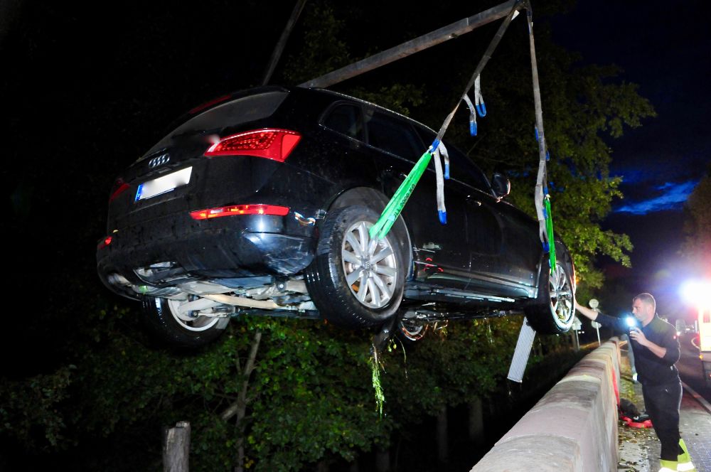 Außer nassen Füßen und einen vermutlich gehörigen Schrecken, gab es bei dem spektakulären Abflug glücklicherweise keine Verletzungen zu beklagen. Auch Fremdschaden entstand bisher noch keiner. Wie hoch der Schaden am Fahrzeug ist, kann derzeit nicht beurteilt werden. Rund eine Stunde dauerte die Bergung des PKW. Mit dem Kran eines LKW Abschlepper wurde gegen 19:30 Uhr mit der Bergung des Fahrzeuges begonnen. Aufgrund der Lage, unmittelbar unterhalb der Brücke, hätte ein normaler Abschleppwagen das Fahrzeug nicht heben können. „Die Stützen hätten nicht weit genug ausgefahren werden können (…) mit dem LKW haben wir da weniger Probleme“, kommentierte Abschleppchef Walke seinen Einsatz. Dazu musste kurzerhand die K 73 zwischen Arnsbach und Kerstenhausen im Bereich der Brücke gesperrt werden. Von der Brücke aus wurde das Fahrzeug an den Kran gehangen und vorsichtig auf die rund acht Meter hohe Brücke gehoben, wo es direkt auf einem Abschleppwagen abgestellt wurde. Für das Abschleppunternehmen nahezu Routine. Wie hoch letztendlich der Schaden am Fahrzeug ist, muss eine Fachwerkstatt klären. Nach rund einer Stunde war die Bergungsaktion vorüber und die Straße wieder frei.