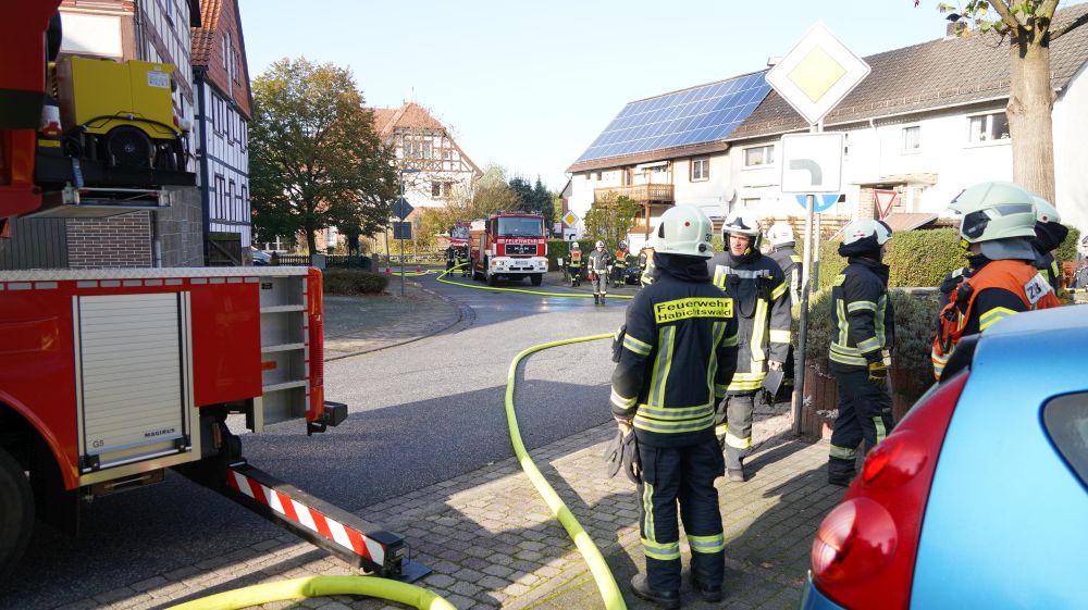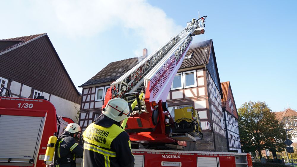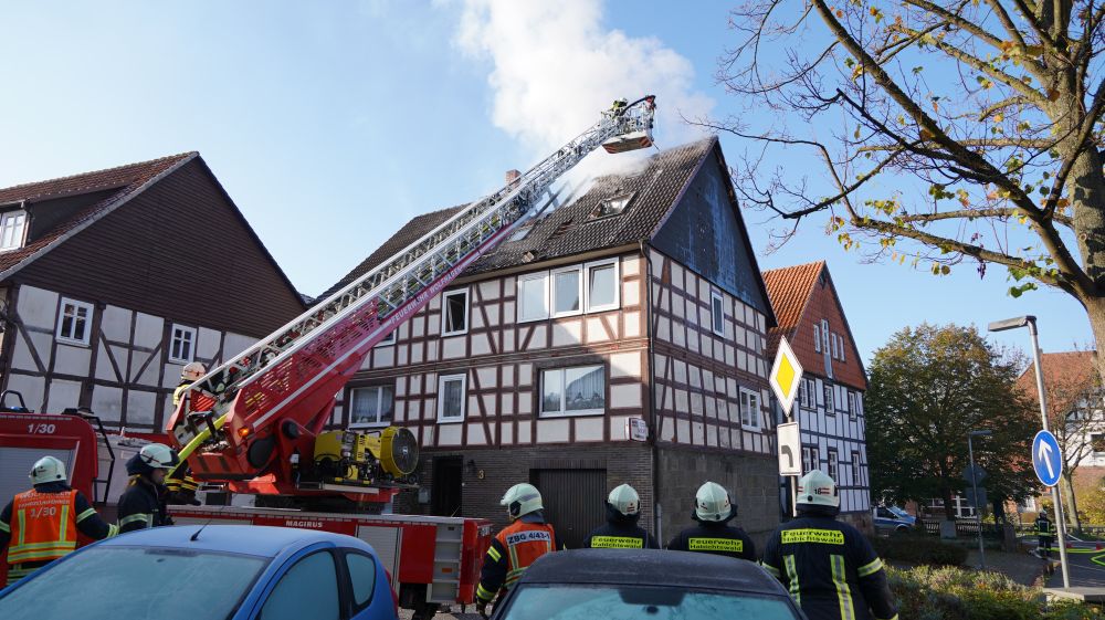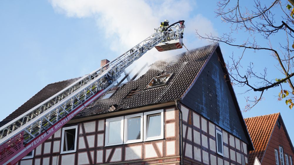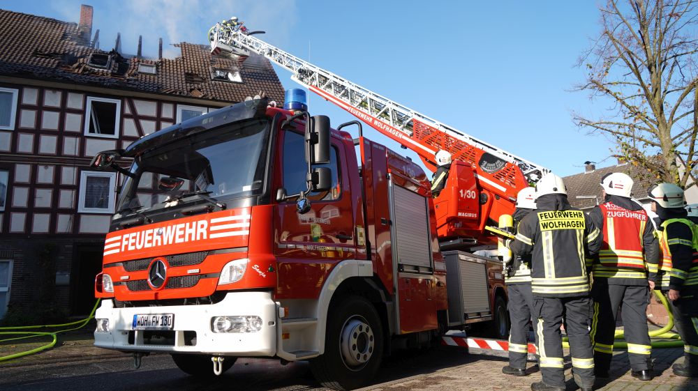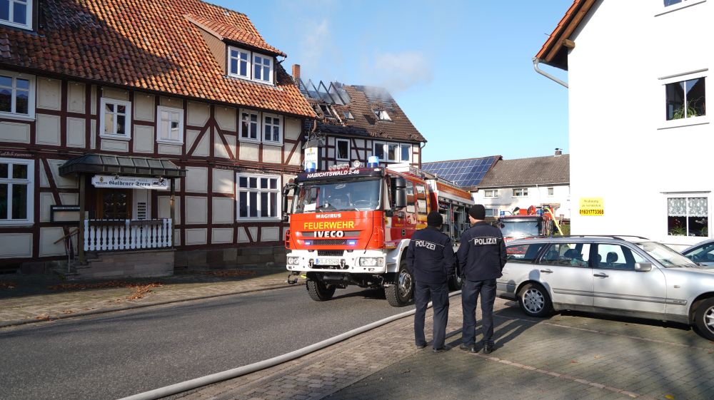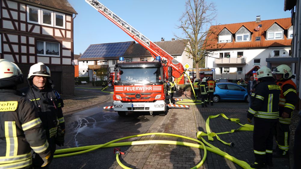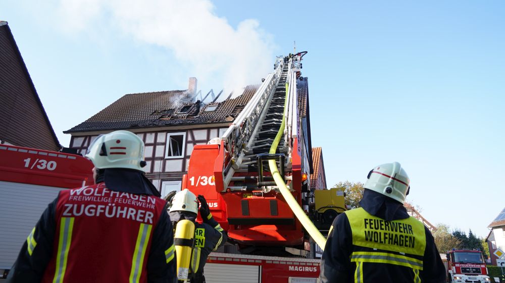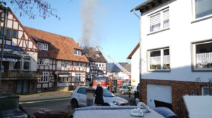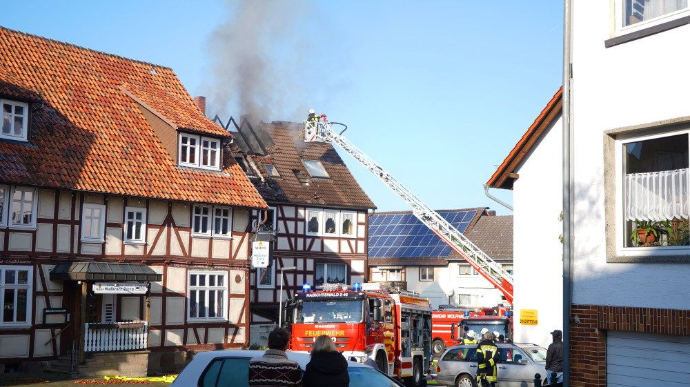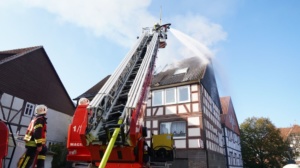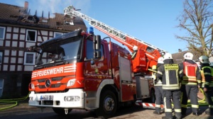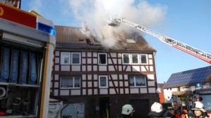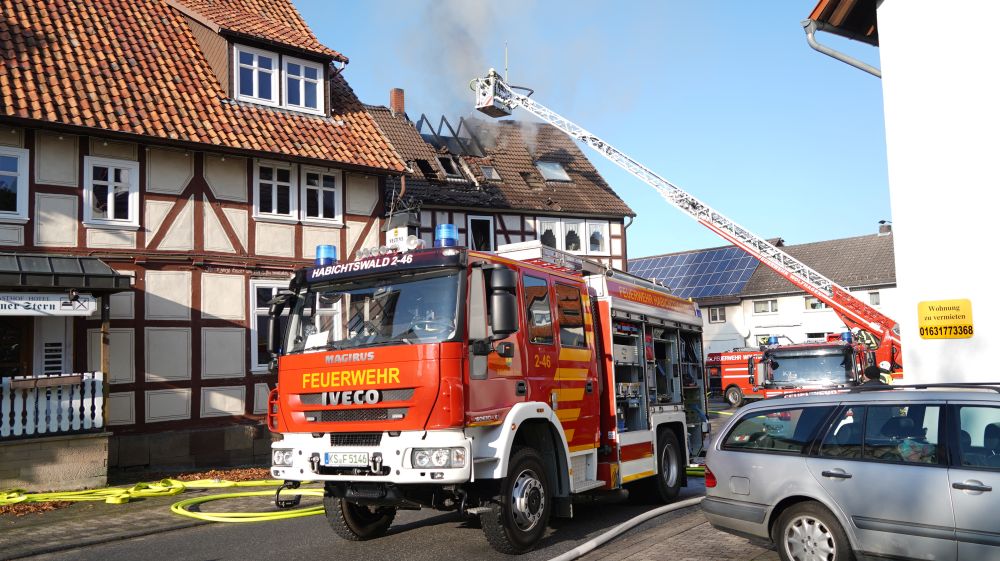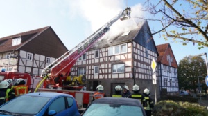 Habichtswald – Am Donnerstagvormittag wurde gegen 09.15 Uhr die Feuerwehr Habichtswald zu einem Dachstuhlbrand alarmiert. Bei Eintreffen der Rettungskräfte stand der Dachstuhl des Fachwerkhauses bereits im Vollbrand. Nach ersten Erkenntnissen wurden Nebengebäude nicht beeinträchtigt. Die beiden Bewohner hatten ihre Häuser bereits eigenständig verlassen und vorab versucht mit zwei Feuerlöschern den Brand unter Kontrolle zu bringen, was jedoch misslang. Verletzt wurde zum Glück niemand.