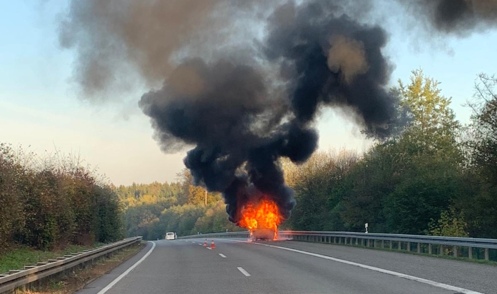 Romrod – Am Donnerstag kam es gegen 15:30 Uhr auf der A5, Reiskirchener Dreieck – Hattenbacher Dreieck, Gemarkung Romrod, Richtung Norden, zu einem Fahrzeugbrand. Ein 49 -jähriger PKW-Fahrer und seine 43 jährige Frau aus Erfurt befuhren mit ihrem PKW- Wohnwagengespann die zweispurige A5 in Fahrtrichtung Kassel. Zwischen den Anschlussstellen Homberg/Ohm und Alsfeld/West bemerkte der Fahrer plötzlich Qualm an seinem Wohnwagenanhänger. Geistesgegenwärtig hielt der Fahrer auf dem Seitenstreifen an und kuppelte seinen PKW rechtzeitig vom Wohnwagen ab.