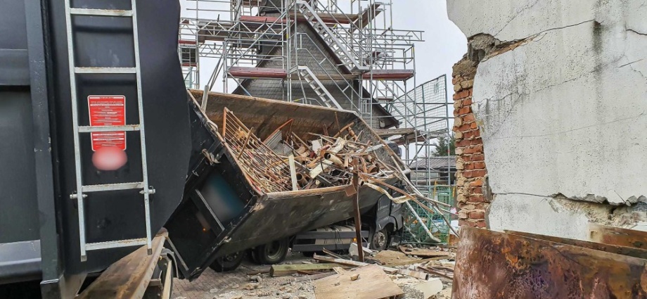 Daupthetal – Am Montagmorgen gegen 08.40 Uhr, prallte ein Lastwagen gegen zwei Häuser und dann noch gegen eine Wand der eingerüsteten Kirche in Hommertshausen im Landkreis Marburg-Biedenkopf. Bei dem Unfall wurde niemand verletzt. Fest steht, dass der 49 Jahre alte Fahrer nach dem Durchfahren einer Linkskurve mit seinem Gespann nach rechts von der Straße abkam. Die Ursache dafür steht derzeit noch nicht fest. Das Gespann streifte zunächst ein Haus und kollidierte dann mit dem nachfolgenden Haus bevor das Führerhaus gegen die seitliche Mauer des Anbaus der eingerüsteten Kirche prallte.