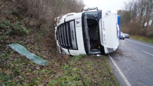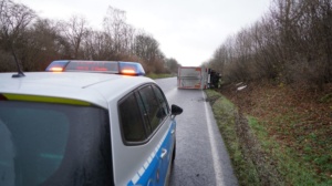 Der Fahrer wurde nach einer Erstversogung an der Unfallstelle in ein Krankenhaus eingeliefert. Für die Bergung musste die B7 ab 13 Uhr voll gesperrt werden. Die Ladung des Sattelaufliegers, wobei es sich um ungefährlichen Industrieabfall handelt, muss auf einen anderen Lkw umgeladen werden, bevor der Sattelzug schließlich von einem Bergungsdienst aufgerichtet und abgeschleppt werden kann. Wie lange die B 7 gesperrt sein wird, kann momentan nicht eingeschätzt werden. Die Polizei empfiehlt, den Bereich weiträumig zu umfahren. An dem recht neuen Sattelzug im Gesamtwert von rund 200.000 Euro dürfte nach erster vorsichtiger Schätzung ein Totalschaden entstanden sein.
