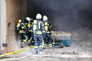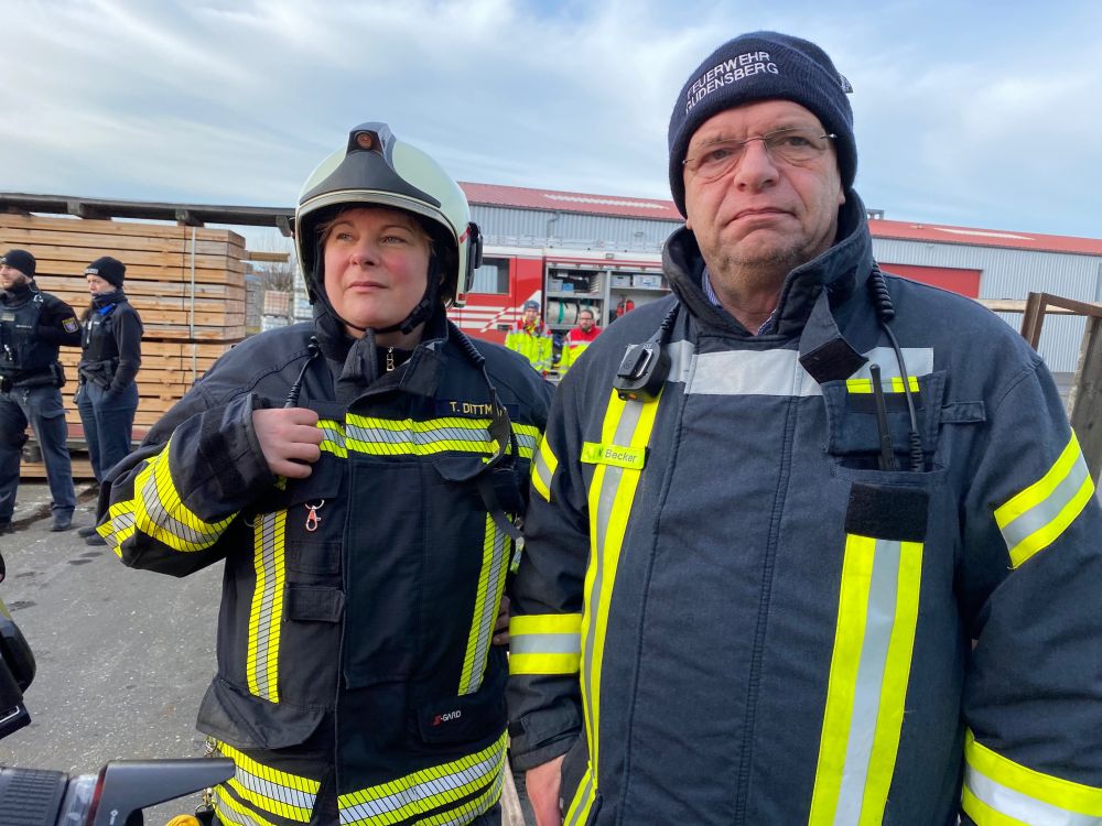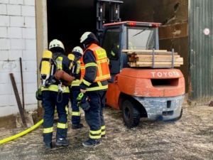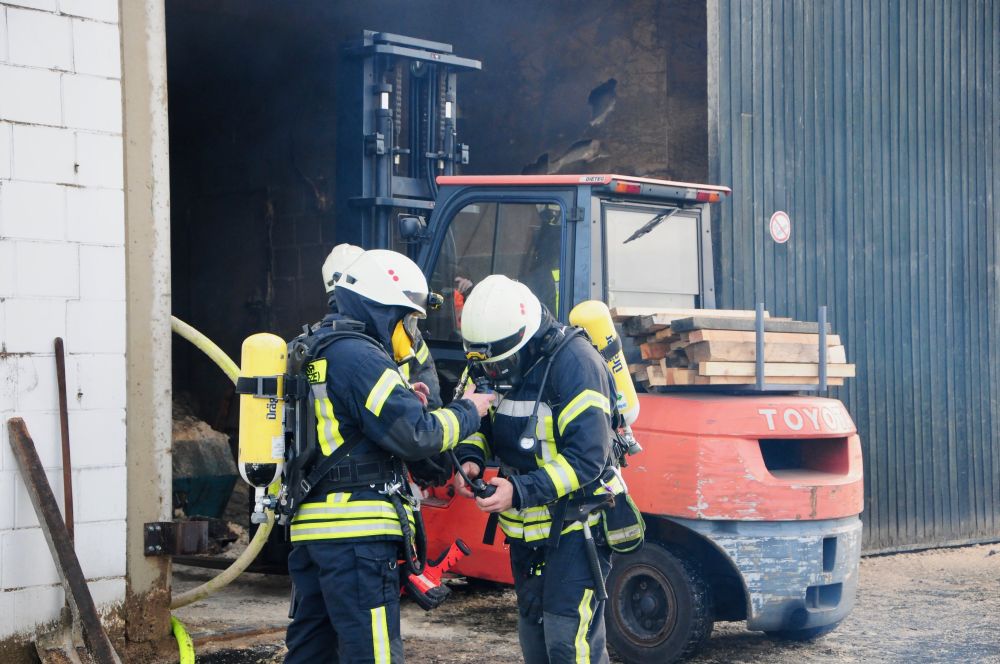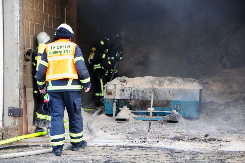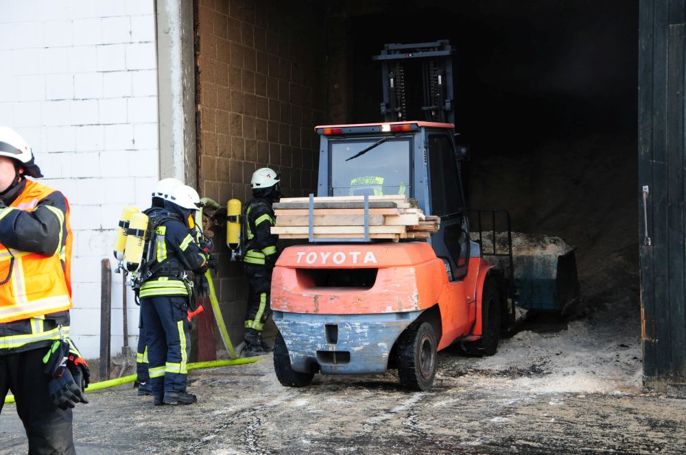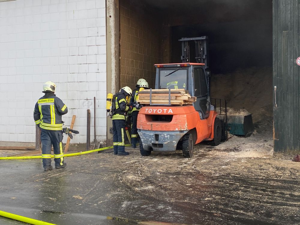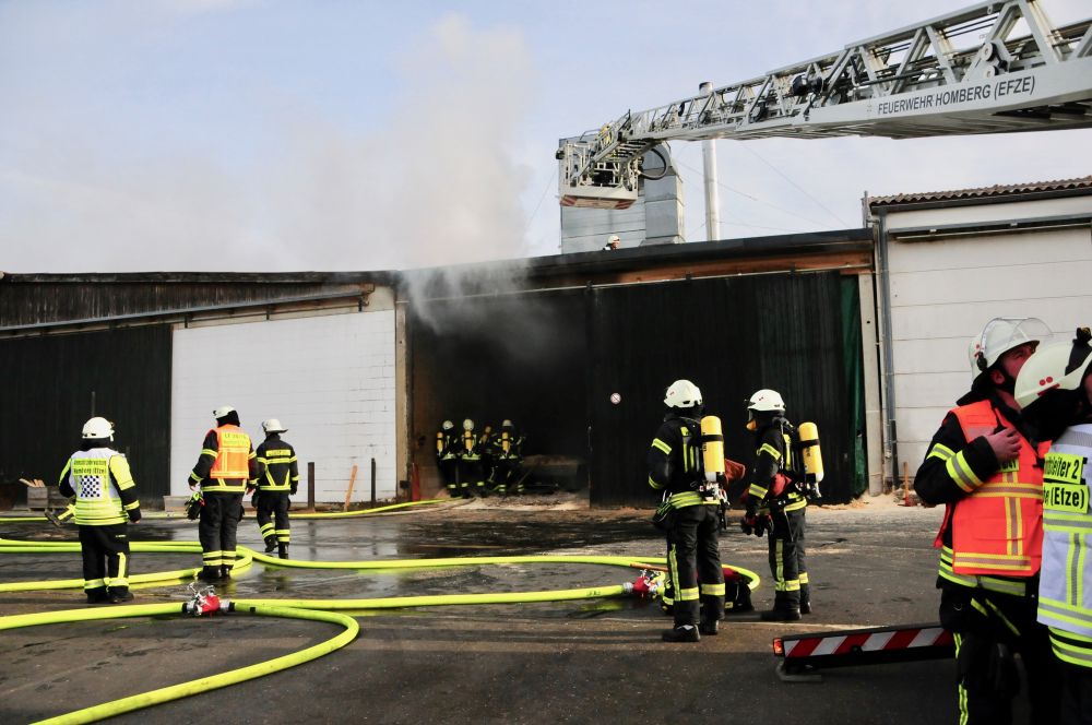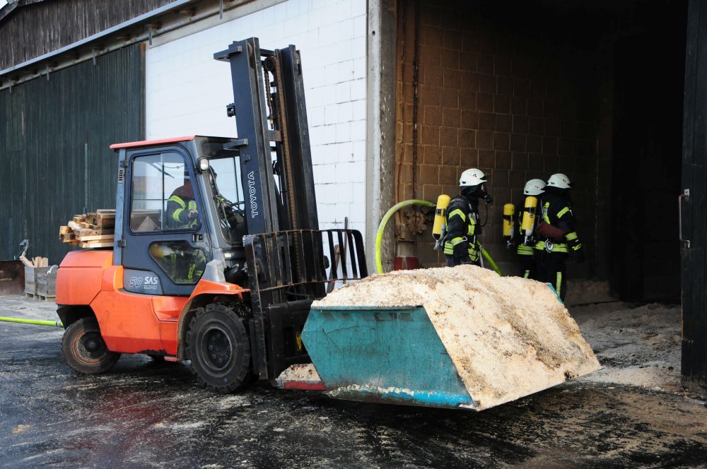 Nachdem die Wasserversorgung hergestellt war, gingen die Brandschützer von zwei Gebäudeseiten vor. Wie Wehrführer Matthias Poppitz berichtete, brannte der Bunker im hinteren Bereich. Dort „waren Flammen zu sehen“, so Poppitz. Eine Brandschutzwand verhinderte zudem, dass sich das Feuer auf einen benachbarten Spähnebunker ausbreiten konnte. Insgesamt waren drei Trupps unter Atemschutz nötig um das Feuer und die Glutnester in dem Spänebunker zu bekämpfen. Mit einem Gebelstapler wurde die Späne später ins Freie befördert und weiter abgelöscht. Warum das Feuer ausbrach ist derzeit noch unklar. Auch die Schadenshöhe war vor Ort noch nicht zu ermitteln. Im Einsatz waren 50 Einsatzkräfte der Feuerwehren Homberg und Holzhausen, ein Rettungswagen und die Polizei Homberg. Auch Landrat Winfried Becker machte sich vor Ort ein Bild der Lage.