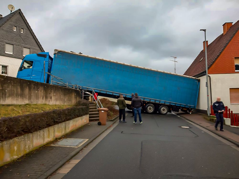 Kurzum entschied er sich rückwärts zu wenden, was aufgrund der winkeligen Einmündung und der abschüssigen Straßenführung scheiterte. Der Sattelauflieger des Gespanns prallte mit dem Heck gegen eine Hauswand und ließ sich mit eigenen Manövern nicht mehr aus dieser misslichen Lage befreien. Ein Abschleppunternehmen wurde mit der Bergung des Aufliegers beauftragt. Ob hierfür zunächst das Granulat abgeladen werden musste oder der Auflieger mit einem großen Kran komplett mit seiner Ladung gehoben werden konnte, mussten die Bergungsexperten vor Ort entscheiden. Letztlich zogen sie das Gespann von der Hauswand weg und wieder gerade auf die Straße, so dass die Fahrbahn gegen 13.30 Uhr wieder freigeben werden konnte.