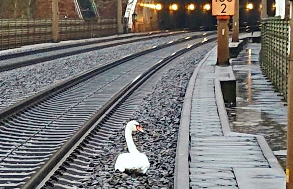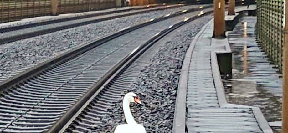 Fuldatal – Auf der Bahnstrecke zwischen Kassel und Göttingen kam es am Mittwoch (23.12.) gegen 16 Uhr zu einer ganz besonderen Rettungsaktion. Zwei Schwäne hatten sich bei einem Ausflug in den Bereich der ICE- Schnellfahrstrecke verirrt. Eines der beiden Tiere war vermutlich in die stromführende Oberleitung geraten und konnte von Beamten der Bundespolizei Kassel nur noch tot geborgen werden. Sein trauernder Gefährte saß noch im gefährlichen Bereich der Gleise.
