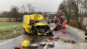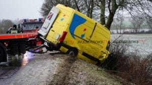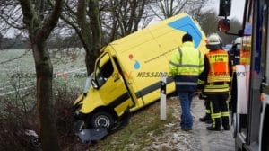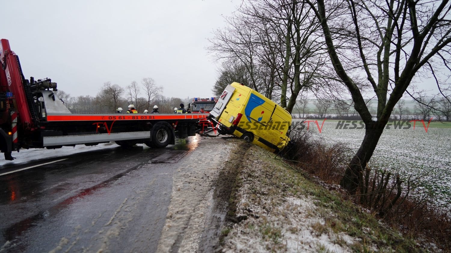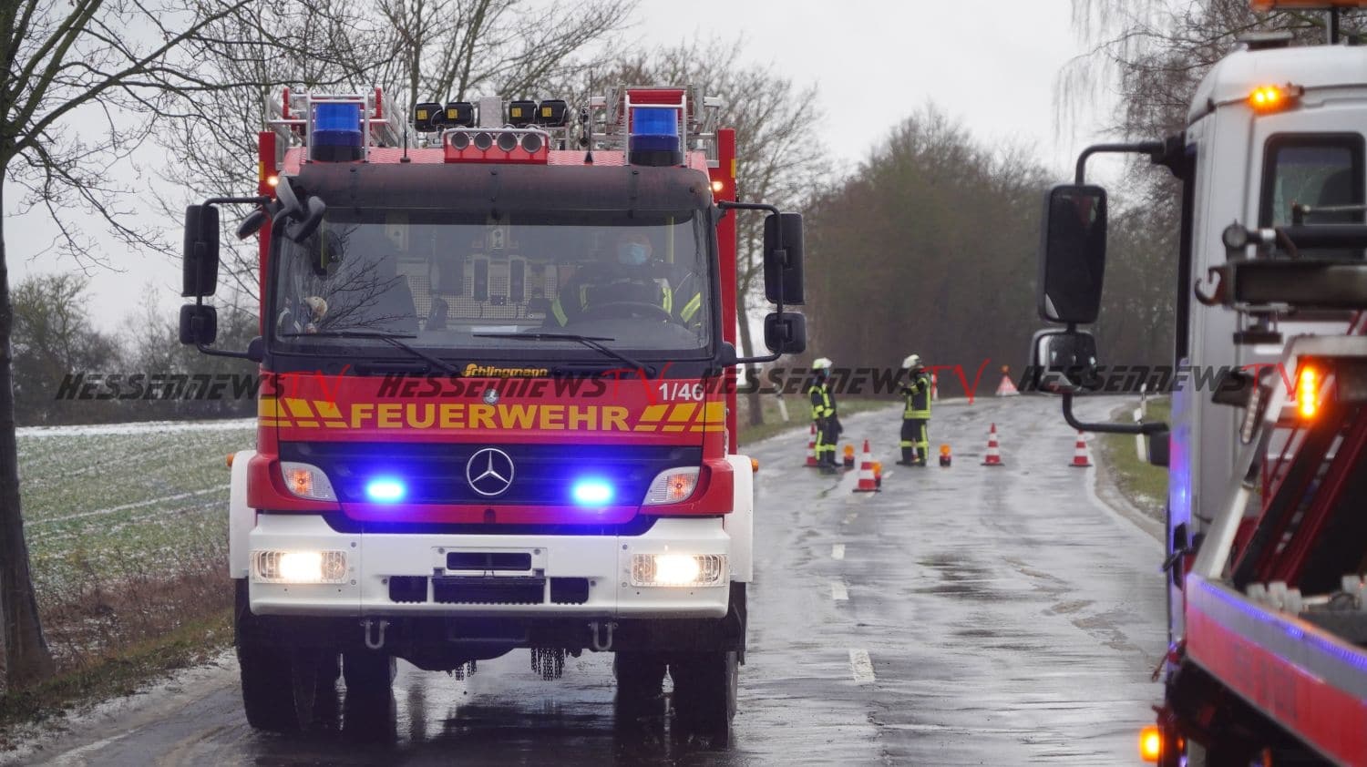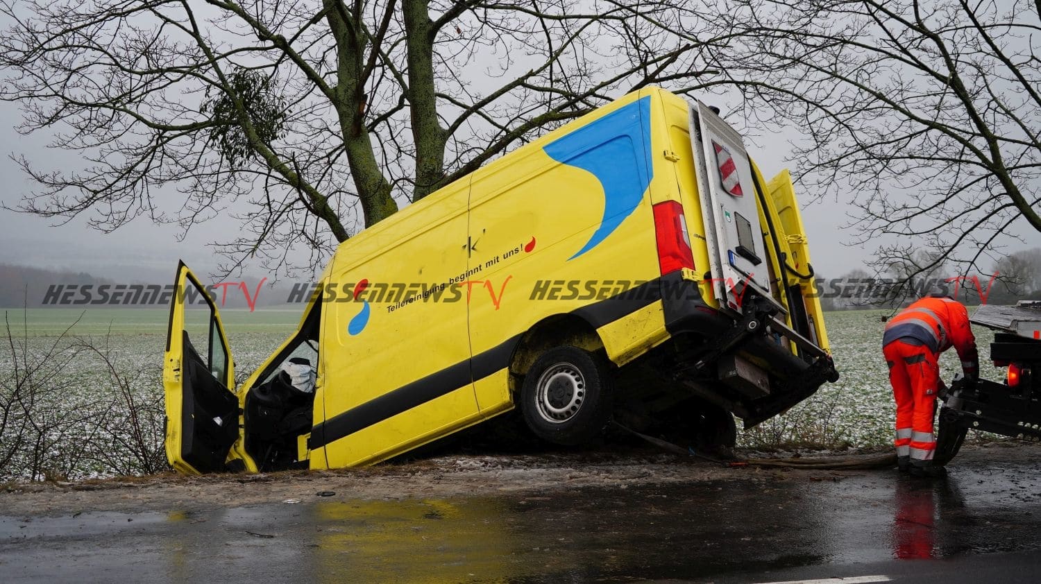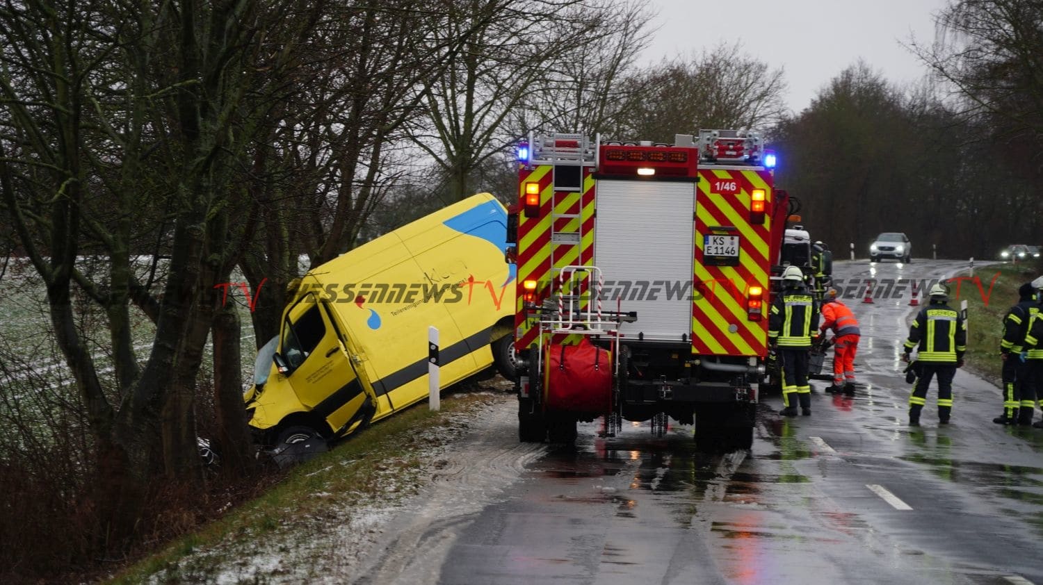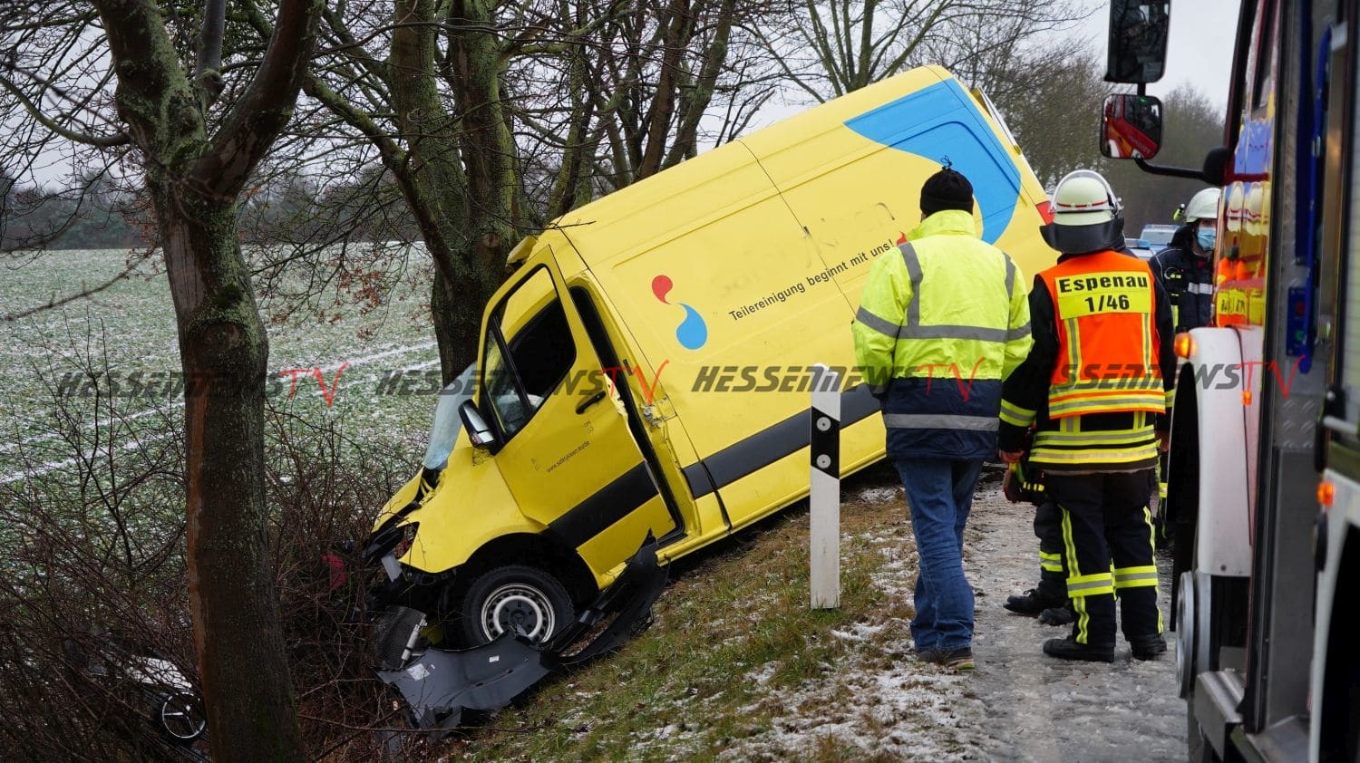 Espenau – Zu einem Verkehrsunfall kam es am Dienstag gegen 13.45 Uhr auf der L3386. Der Fahrer eines Transporters, beladen mit Waschbenzin und Verdünnung, befuhr die Landstraße von Vellmar kommend in Fahrtrichtung Espenau. Aufgrund von Schneematsch auf der Straße verlor der Fahrer die Kontrolle über sein Fahrzeug, kam nach rechts ab und prallte frontal gegen einen Baum. Wie durch ein Wunder blieb der Fahrer soweit unverletzt. Er wurde dennoch zur Kontrolle in ein Krankenhaus eingeliefert. Die Ladung wurde leicht beschädigt, es lief nur eine geringe Menge an Flüssigkeit aus. Die Landstraße blieb mehrere Stunden gesperrt.
