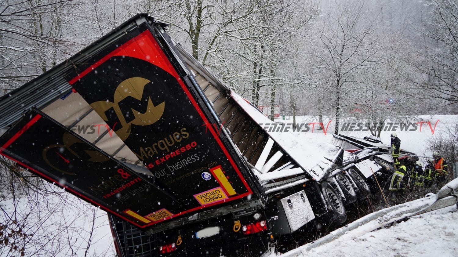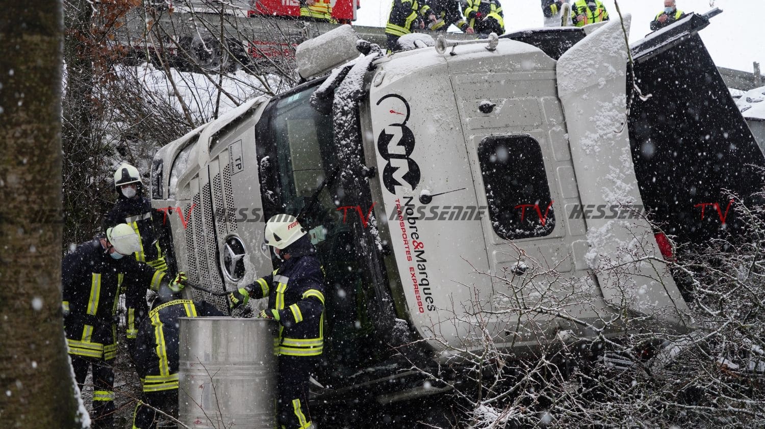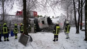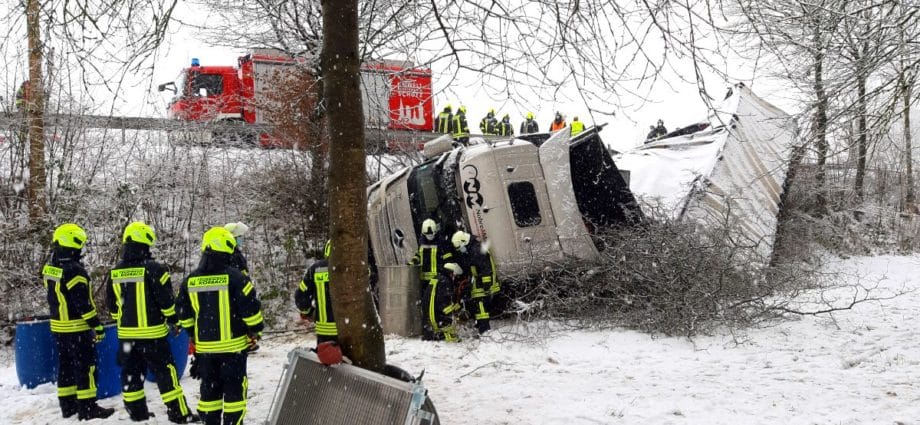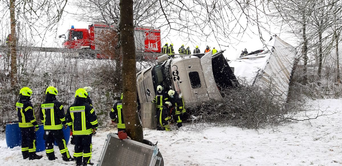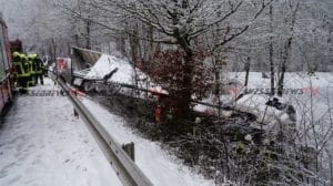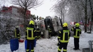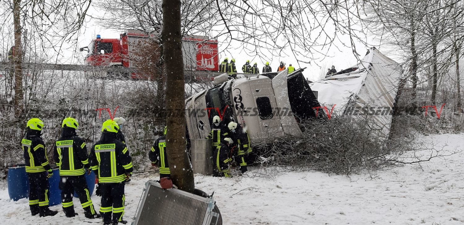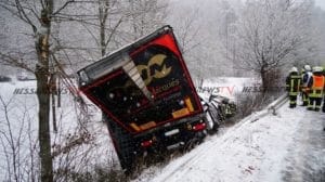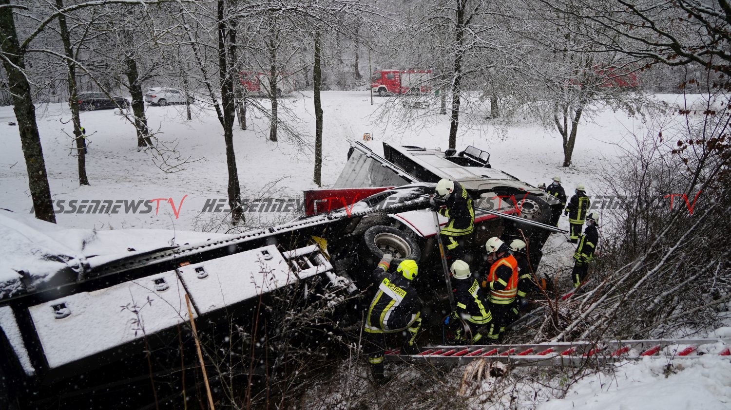 Sachsenhausen – Auf der B251 zwischen Sachsenhausen und Freienhagen kam es am Donnerstag zu einem Verkehrsunfall. Der Fahrer eines Sattelzugs befuhr gegen 13 Uhr die Bundesstraße von Sachsenhausen kommend in Fahrtrichtung Freienhagen. In einer Rechtskurve in Höhe eines Parkplatzes verlor der Fahrer auf schneebedeckter Fahrbahn die Kontrolle über sein Fahrzeug und rutschte nach links von der Fahrbahn ab. Der mit rund neun Tonnen Eisen beladene LKW kam in einem Abhang auf der Seite zum Liegen. Der Fahrer konnte sich selbst befreien und stand beim Eintreffen der Feuerwehr auf dem LKW. Die Feuerwehr rettete den Mann mit einer Leiter. Nach der Erstversorgung wurde der Fahrer in ein Krankenhaus eingeliefert. Die Feuerwehr sicherte die Unfallstelle ab und musste mehrere hundert Liter Diesel abpumpen. Für die Bergung war die Bundesstraße voll gesperrt.