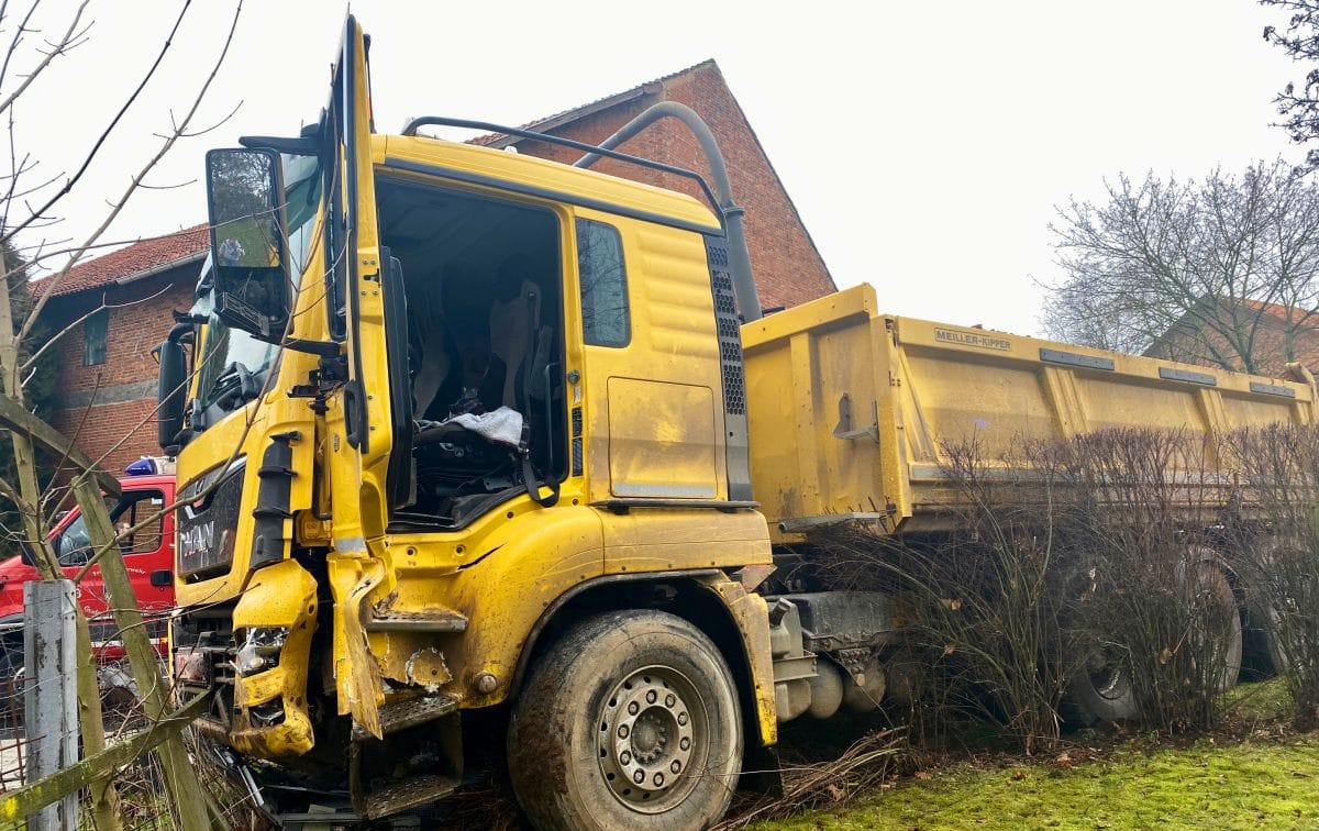 Deute – Ein 60-jähriger Fahrer eines Kippers befuhr zunächst die L3222 von Neuenbrunslar in Richtung Gudensberg. In der Ortsmitte von Deute übersah der Mann einen aus Richtung Niedervorschütz kommenden vorfahrtberechtigten Fahrer eines Betonmischer, welcher auf der B 254 in Richtung Kassel unterwegs war. Durch den Zusammenstoß der beiden Schwergewichte wurde der Kipper des 60-jährigen Mannes aus Wabern nach rechts in Richtung Dissen abgewiesen. Der mit Erde beladene LKW querte die Gegenfahrbahn, pflügte eine Hecke nieder, brachte eine Fußgängerampel in Schräglage und zerstörte zudem die Ampelsteuerung. In einem Vorgarten kam das tonnenschwere Fahrzeug zum Stillstand. Durch den Zusammenprall wurde der Mann in seinem Fahrzeug eingeklemmt und im Verlauf von der Feuerwehr patientenschonend aus seiner misslichen Lage befreit.Der 62-jährige Fahrer des Betonmischers zog sich glücklicherweise nur leichte Verletzungen zu. Beide Fahrzeugführer wurden durch den Rettungsdienst in Krankenhäuser nach Kassel und Fritzlar gebracht. Während der Rettungs- und Bergungsmaßnahmen war die B-254 zeitweise für den Verkehr voll gesperrt.Im Einsatz waren die Feuerwehr Gudensberg und Stadtteile, zwei Rettungswagen, ein Notarzt sowie die Polizei Fritzlar. Den Gesamtschaden schätzt die Polizei auf 20.000 Euro.