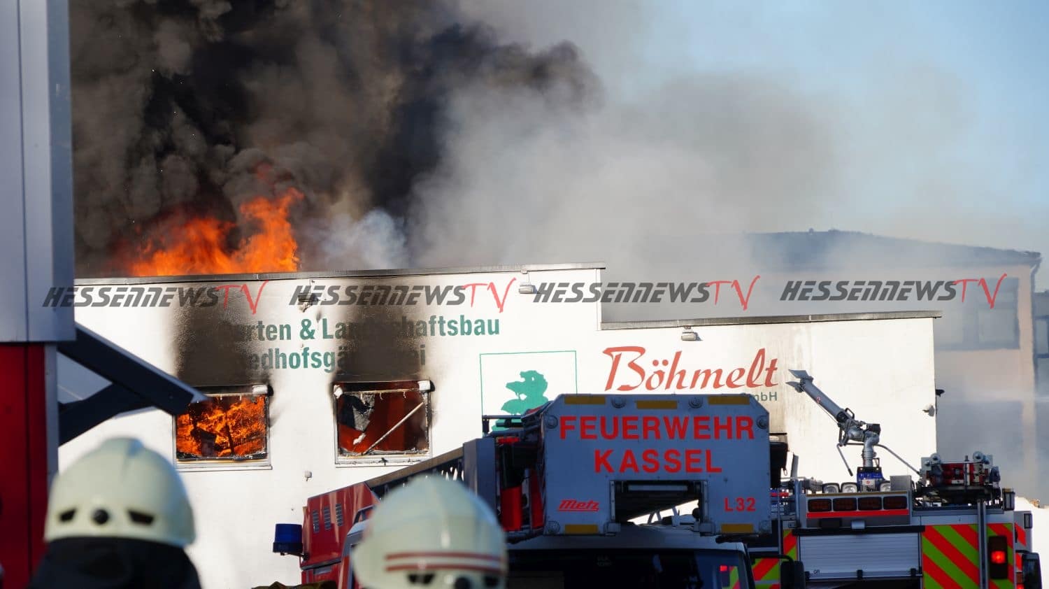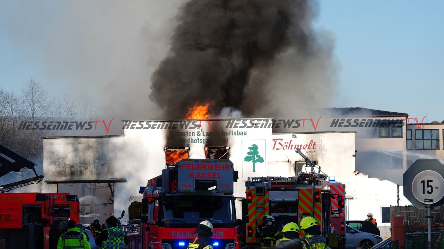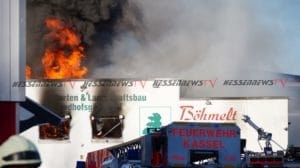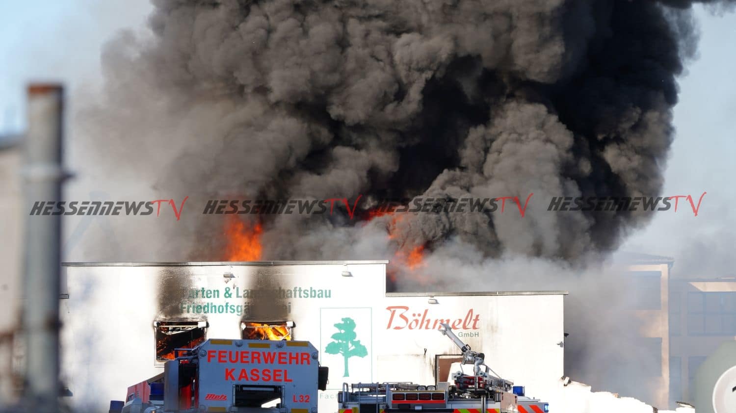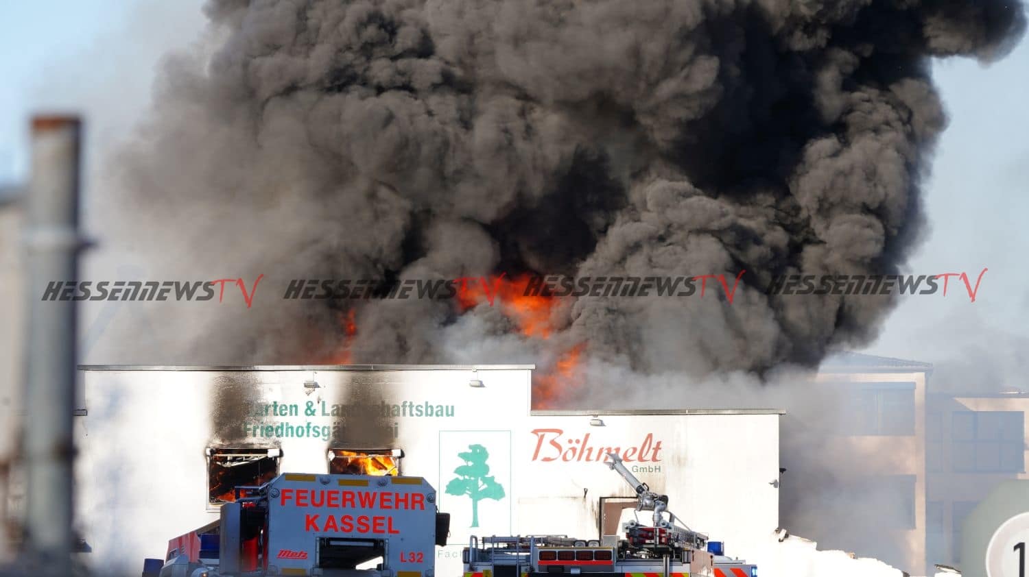Kassel – Am frühen Sonntagmorgen gegen 07.45 Uhr wurde von Anwohnern aus der Angersbachstraße in Kassel eine starke Rauchentwicklung gemeldet. Beim Eintreffen der ersten Einsatzkräfte wurde festgestellt, dass das Gebäude eines Garten- und Landschaftsbaubetrieb im Vollbrand stand. Auf Grund der enormen Brandausdehnung mussten zwei angrenzende Wohnhäuser geräumt werden. Die insgesamt 30 Bewohner befinden sich aktuell in Betreuung. Bis zum aktuellen Zeitpunkt gibt es glücklicherweise noch keine Verletzten. Insgesamt sind derzeit 100 Einsatzkräfte der Feuerwehr und ca. 30 Polizeibeamte im Einsatz. Was genau den Band ausgelöst hat ist ebenso wie die Höhe des Sachschadens derzeit noch völlig unklar. Sobald wir neue Informationen haben berichten wir nach. Anwohner aus der näheren Umgebung werden gebeten Fenster und Türen geschlossen zu halten. Die Rauchsäule war kilometerweit sichtbar.