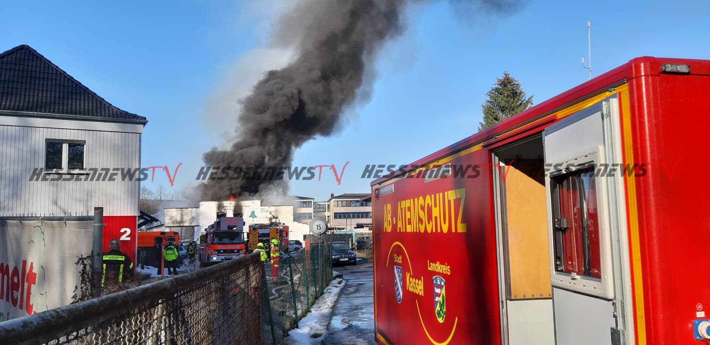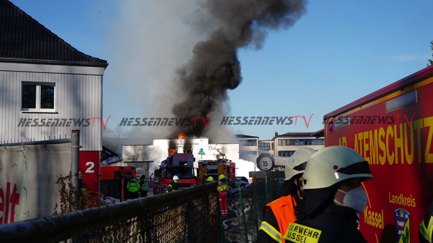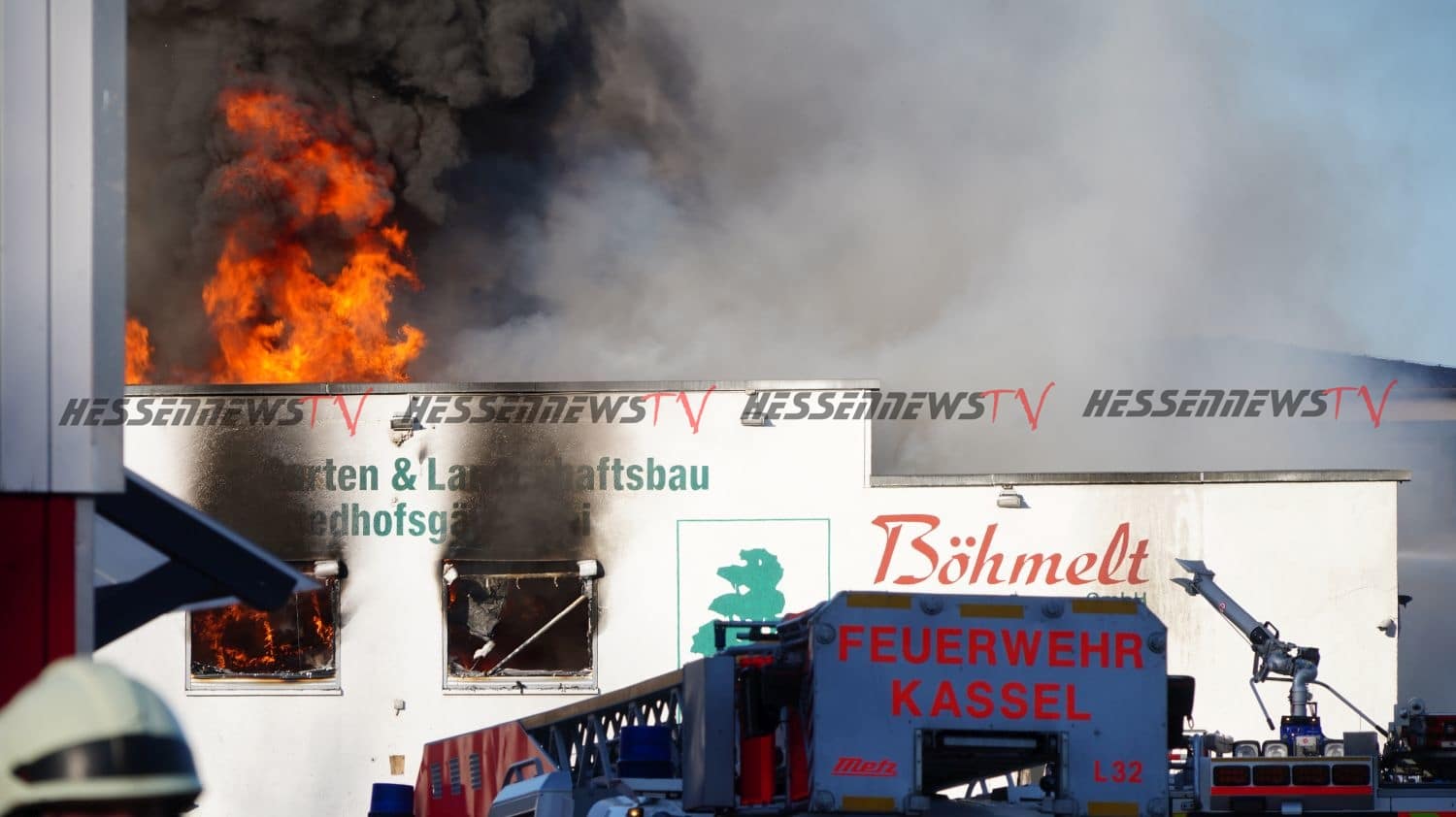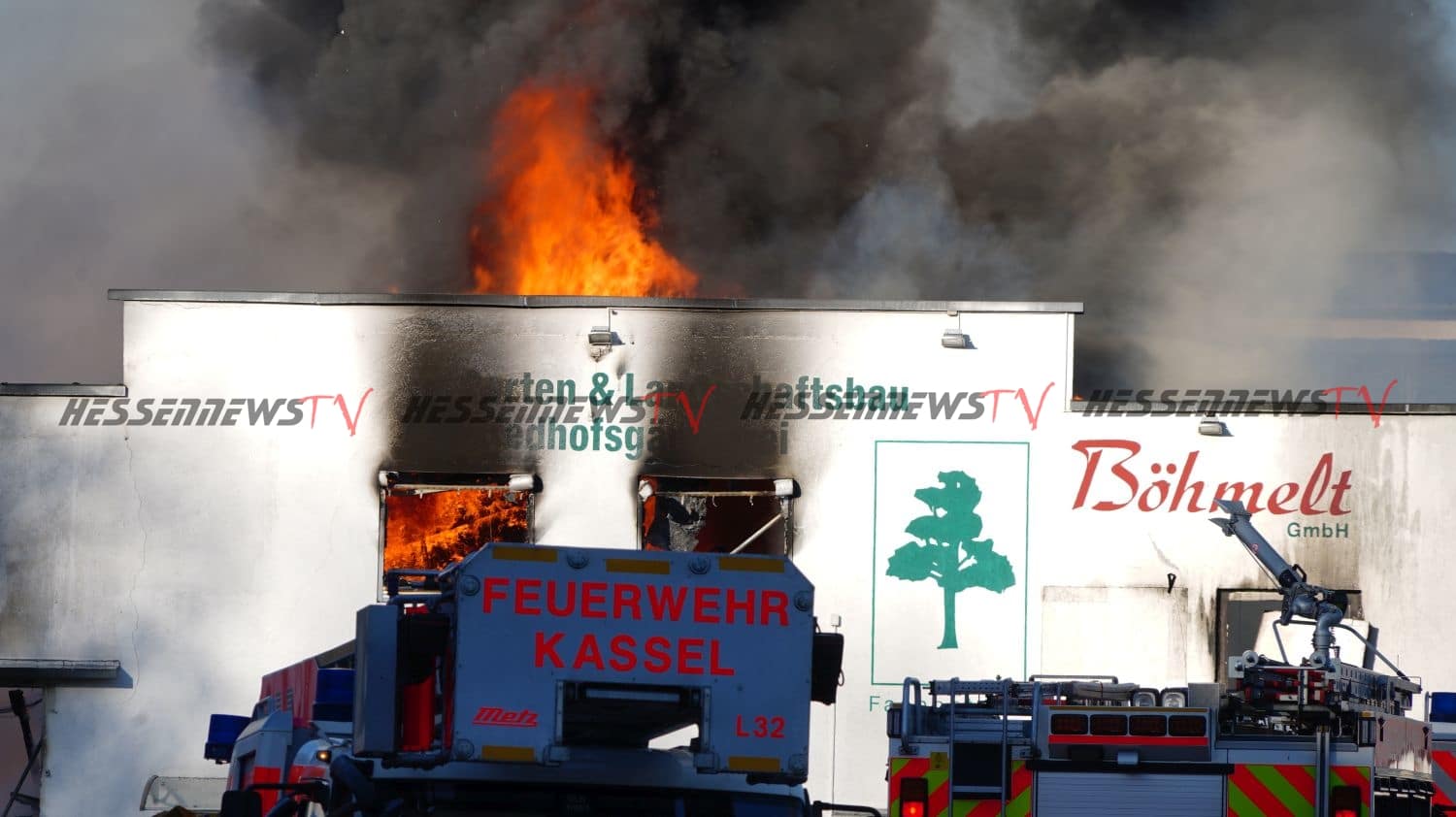 Kassel – Am frühen Sonntagmorgen gegen 07.45 Uhr wurde von Anwohnern aus der Angersbachstraße in Kassel eine starke Rauchentwicklung gemeldet. Beim Eintreffen der ersten Einsatzkräfte wurde festgestellt, dass das Gebäude eines Garten- und Landschaftsbaubetrieb im Vollbrand stand. Auf Grund der enormen Brandausdehnung mussten zwei angrenzende Wohnhäuser geräumt werden. Die insgesamt 30 Bewohner befinden sich aktuell in Betreuung. Bis zum aktuellen Zeitpunkt gibt es glücklicherweise noch keine Verletzten. Insgesamt sind derzeit 100 Einsatzkräfte der Feuerwehr und ca. 30 Polizeibeamte im Einsatz. Was genau den Band ausgelöst hat ist ebenso wie die Höhe des Sachschadens derzeit noch völlig unklar. Sobald wir neue Informationen haben berichten wir nach. Anwohner aus der näheren Umgebung werden gebeten Fenster und Türen geschlossen zu halten. Die Rauchsäule war kilometerweit sichtbar.