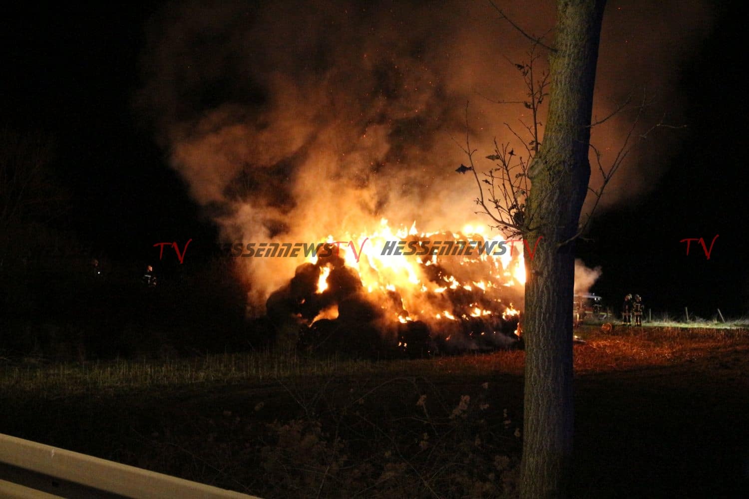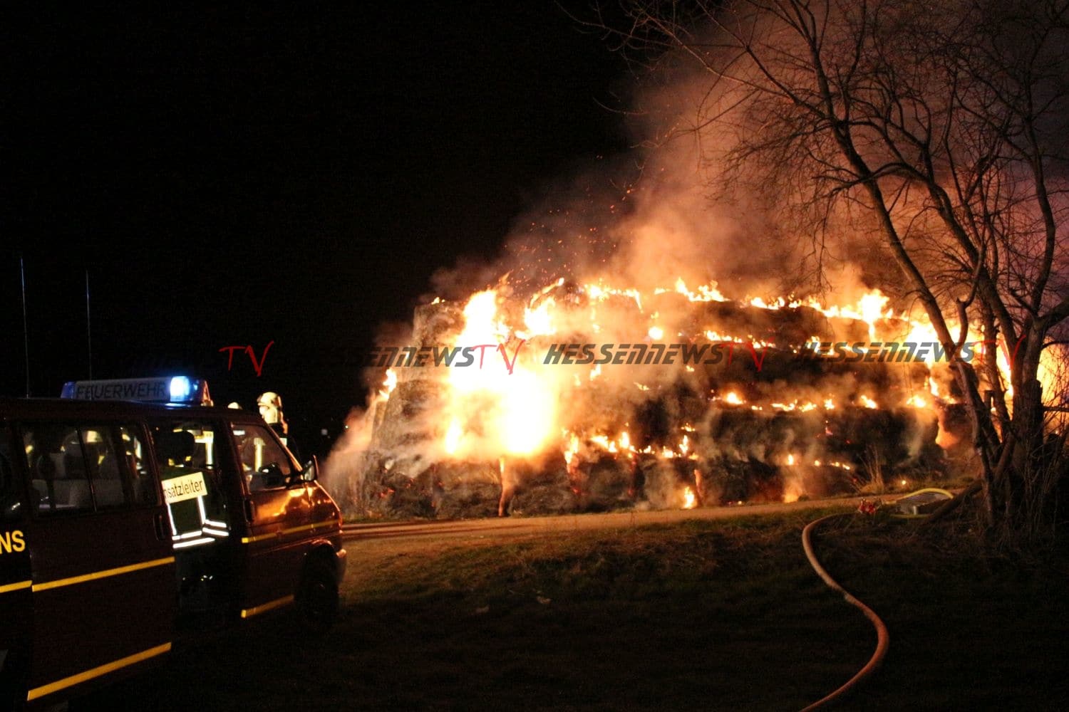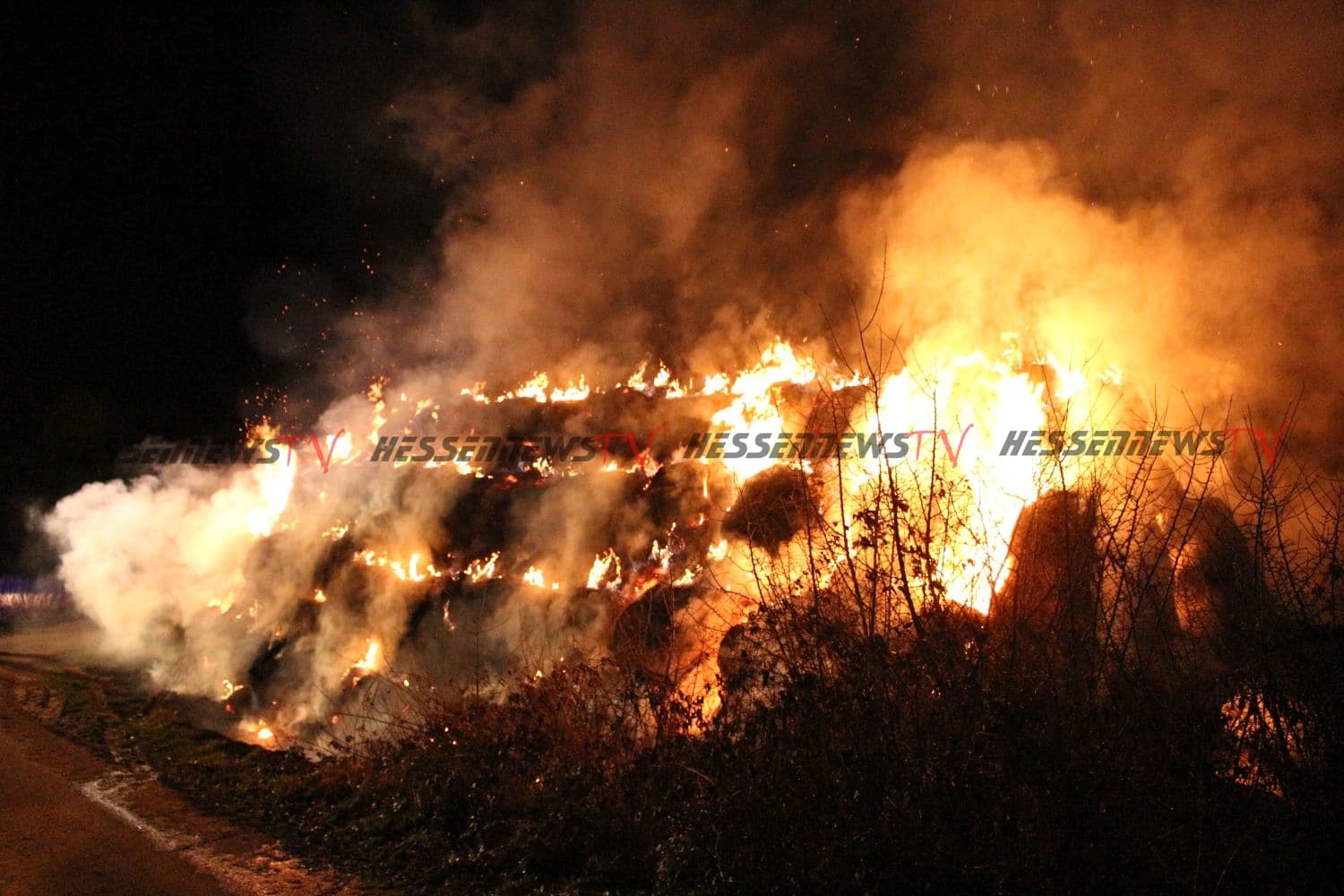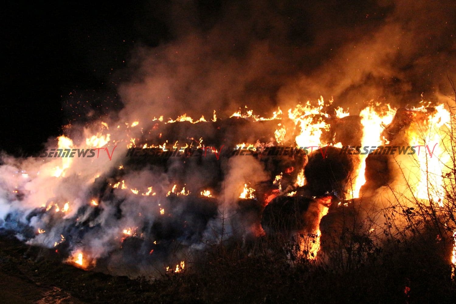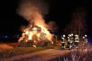 Guxhagen − Am frühen Samstag morgen gegen 4 Uhr, wurde die Feuerwehr Guxhagen und die Feuerwehr Edermünde−Grifte zu einem Brand im Freien Alarmiert. Beim eintreffen der ersten Einsatzkräfte standen rund. 200 Rundballen auf einem Feld an der L3221 in Brand. Die Feuerwehr hat die ersten Löschmaßnahmen eingeleitet und alarmierte zusätzlich das THW mit entsprechendem schweren Gerät zur Einsatzstelle, um die Rundballen auseinander zu ziehen. Die Feuerwehr war mit rund 40 Einsatzkräften vor Ort.