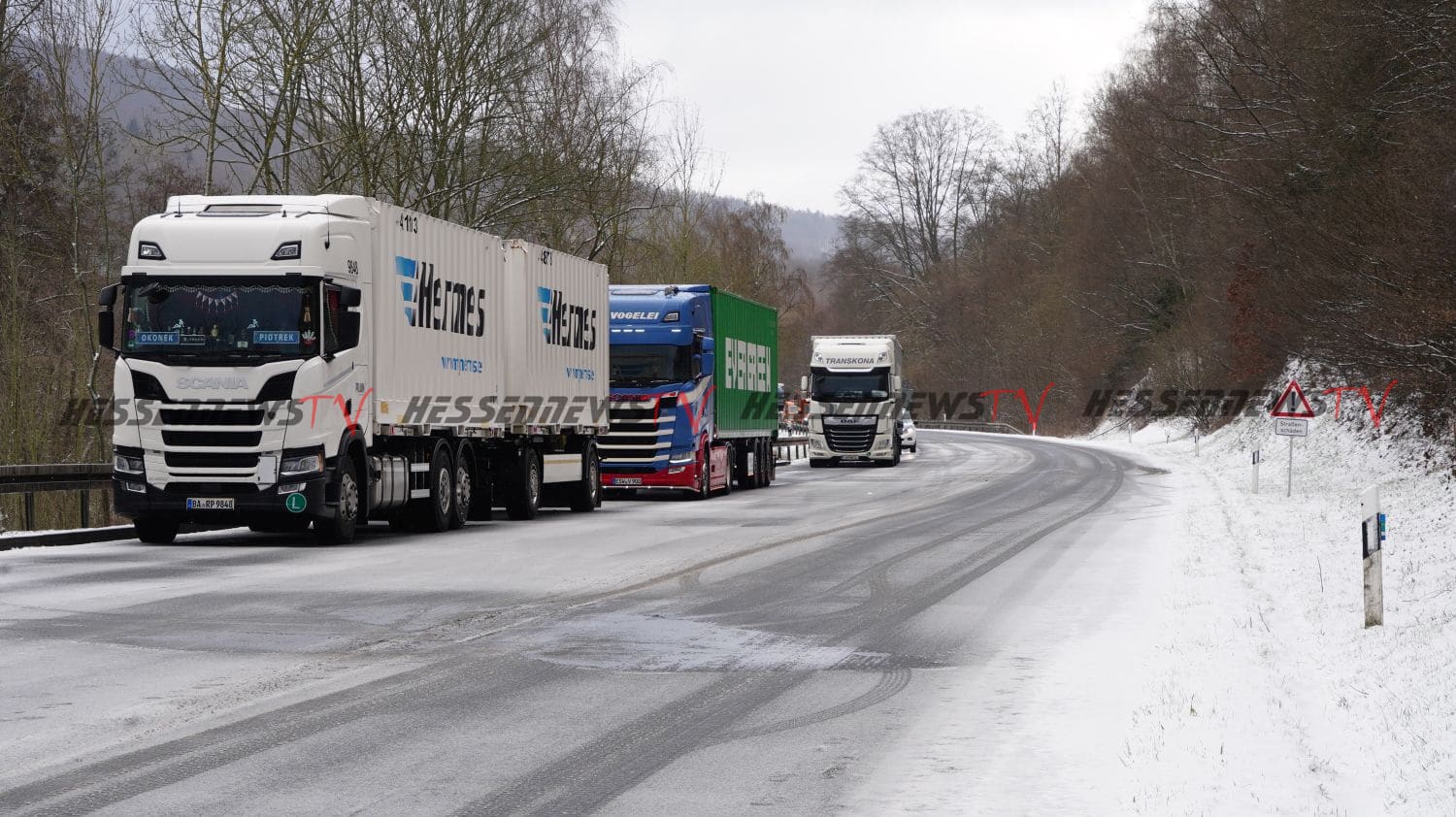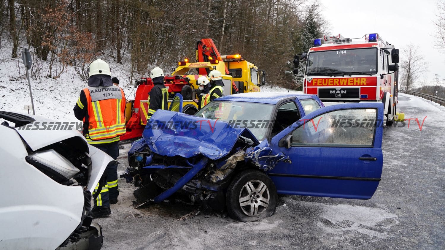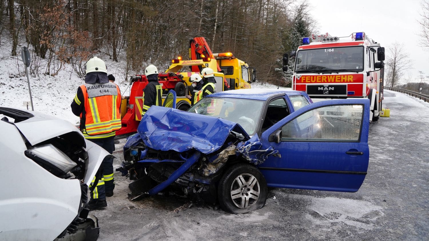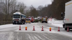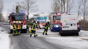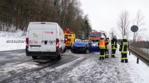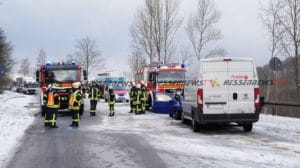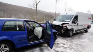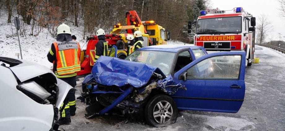 Kaufungen – Am Dienstag kam es gegen 07.20 Uhr auf der B7 zwischen Kaufungen und Helsa zu einem Verkehrsunfall. Eine 20-Jährige Fahrerin eines VW befuhr die Bundesstraße in Fahrtrichtung Helsa. In einer Kurve rutschte das Fahrzeug, vermutlich aufgrund von Straßenglätte und Sommerreifen in den Gegenverkehr. Der dort in Richtung Kassel entgegenkommende LKW, des glücklicherweise unverletzt gebliebenen 54-jährigen Fahrers aus dem Landkreis Saalfeld-Rudolstadt, kollierte mit dem VW Golf beim Vorbeifahren, sodass beide Fahrzeuge an den Längsseiten beschädigt wurden. Der dem Sattelzug folgende Kleintransporter hatte bereits zum Überholen des LKW angesetzt und so kam es zum Frontalzusammenstoß mit dem entgegenkommenden VW Golf. Der 26-jährige Fahrer des Kleintransporters erlitt ebenfalls schwere Verletzungen und wurde in ein Kasseler Krankenhaus eingeliefert. Auch die 20-Jährige wurde schwer verletzt in ein Krankenhaus eingeliefert. Die Anfahrt war für die Rettungskräfte sehr schwierig, da die Bundesstraße mit Schnee und Eis bedeckt war. Die B7 war bis 09.10 Uhr voll gesperrt.