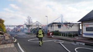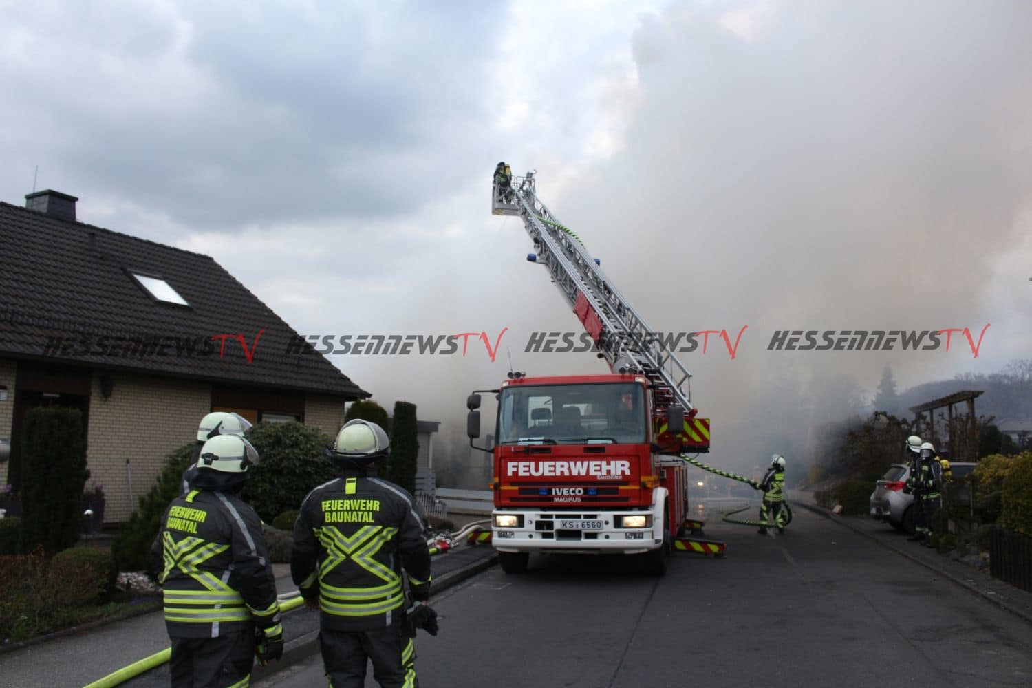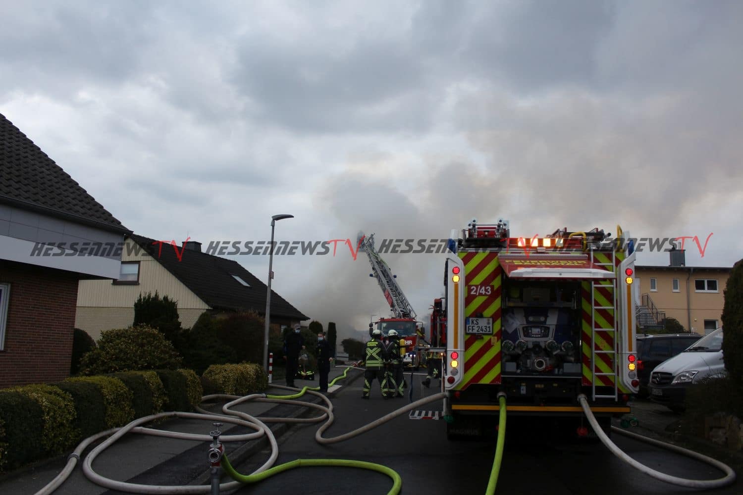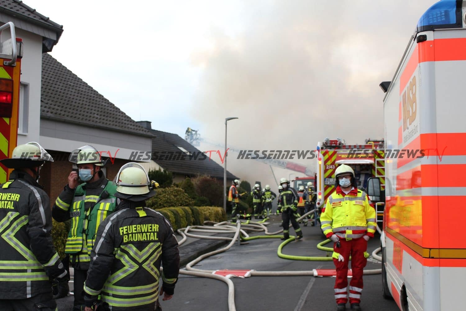 Baunatal – Gegen 16.15 Uhr wurde die Feuerwehr Baunatal zu einem Brand im Gebäude alarmiert. Zunächst ging man davon aus, dass sich noch Menschen im Gebäude befinden. Dies bewahrheitete sich zum Glück jedoch nicht. Beim Eintreffen der ersten Einsatzkräfte stand das Gebäude bereits im Vollbrand. Durch die enorme Brandentwicklung war nur noch ein Außenangriff durch die Feuerwehr möglich, da bereits Teile des Gebäudes eingestürzt waren. Ein Wohnwagen der sich auf dem Nachbargrundstück befand, wurde von der Feuerwehr in einen sicheren Bereich gebracht. Auch die angrenzenden Gebäude konnten von der Feuerwehr gesichert werden. Nach letzten Informationen von der Einsatzstelle wurde bei dem Brand niemand verletzt. Was genau den Brand ausgelöst hat ist derzeit noch unbekannt, die Polizei hat die Ermittlungen aufgenommen. Die Löscharbeiten werden nach Angaben der Feuerwehr noch bis in den späten Abend andauern.