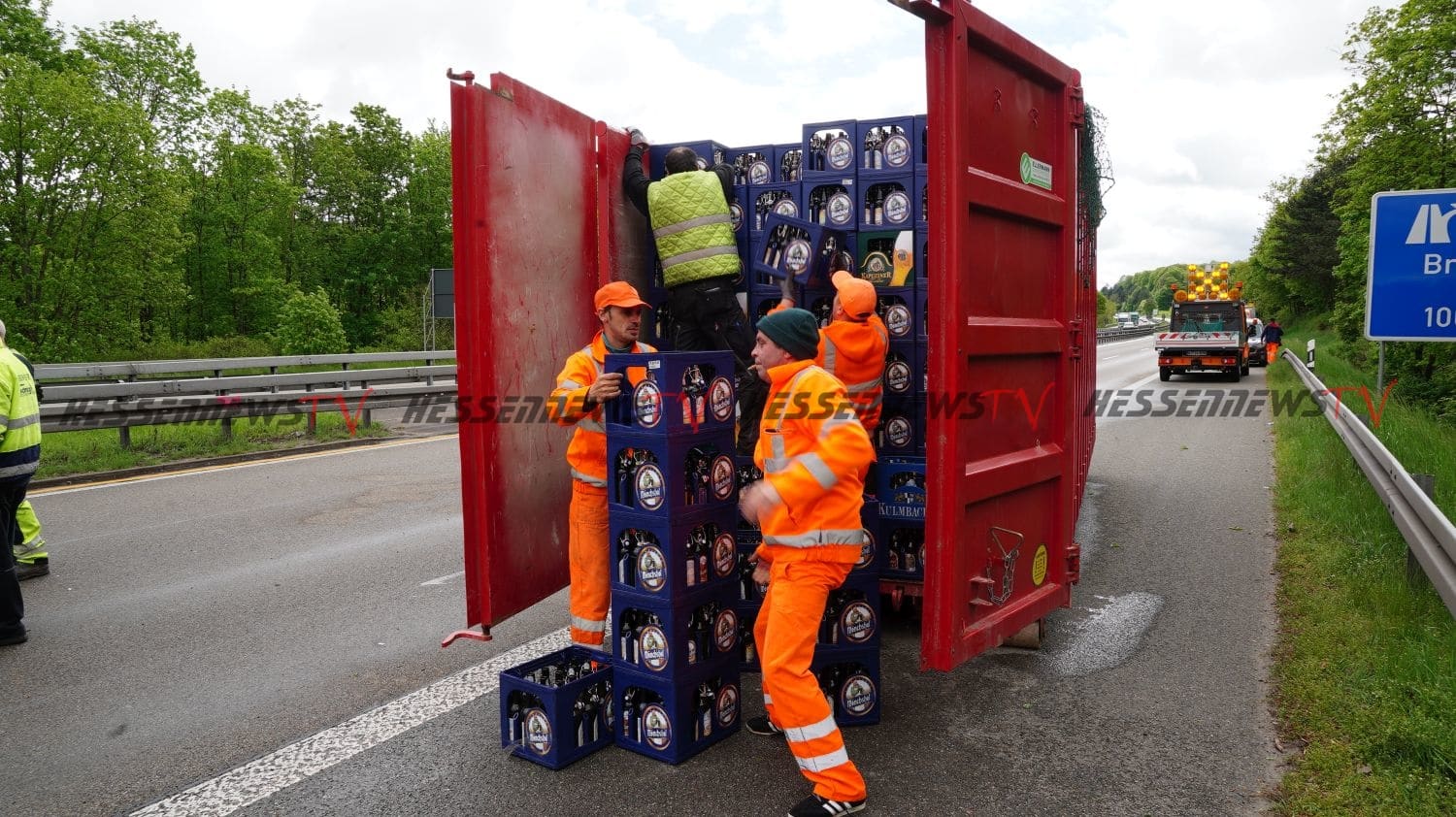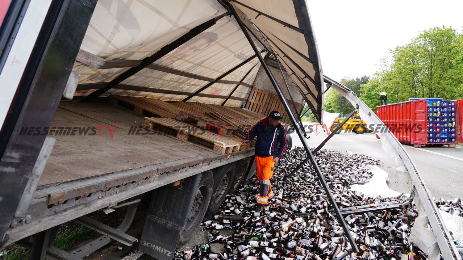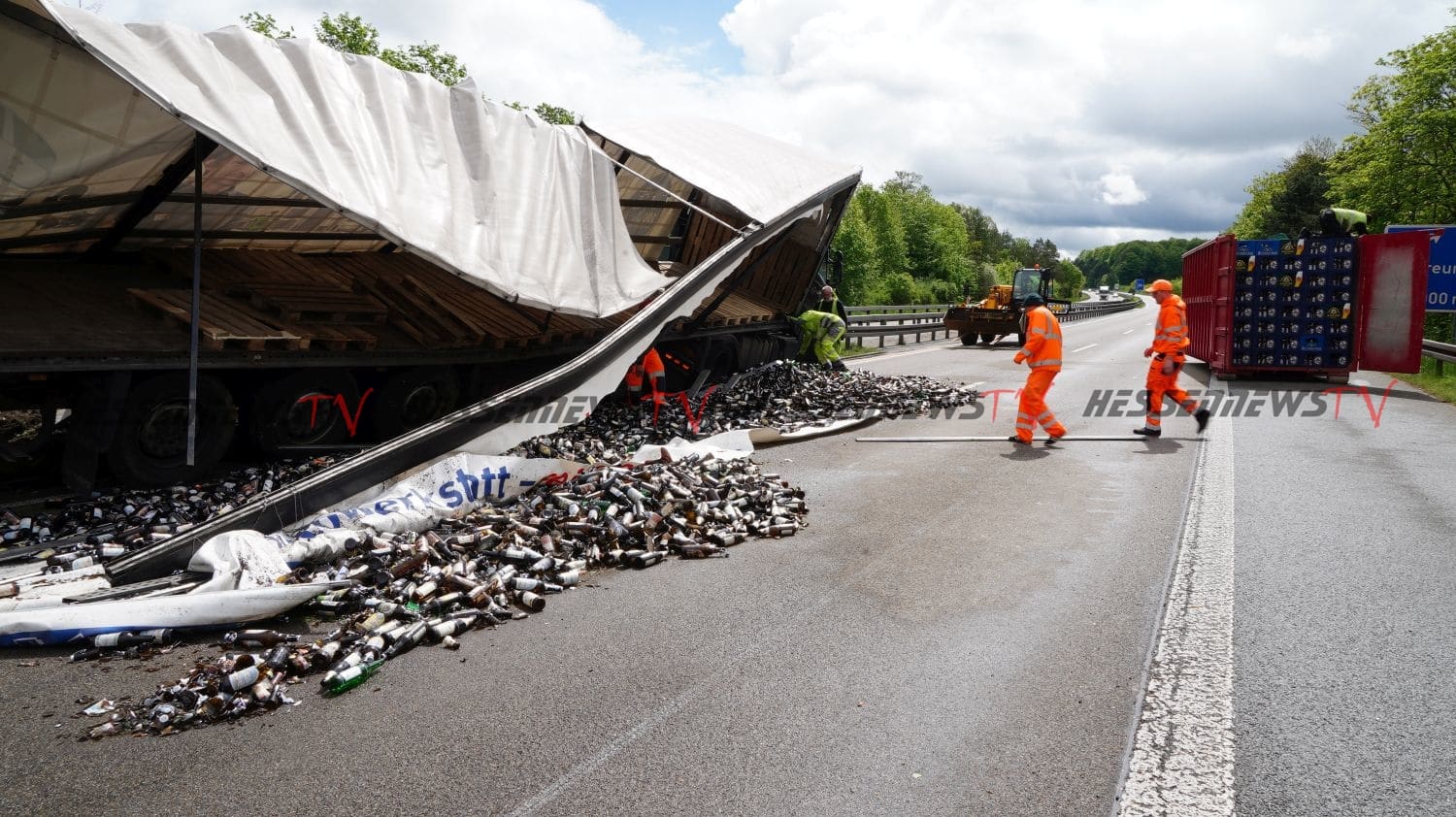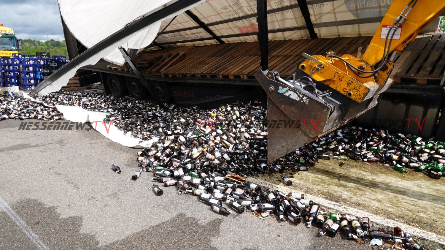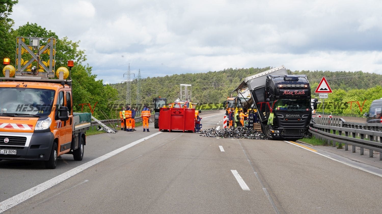 Breuna – Auf der A44 kam es am Dienstagmorgen zwischen Warburg und Breuna zu einem LKW-Unfall. Wie der LKW-Fahrer Alexander Esch gegenüber Hessennews.TV berichtet, fuhr er mit seinem Sattelzug in Fahrtrichtung Kassel. Rund einem Kilometer vor der Abfahrt Breuna platzte ihm ein Reifen vorne links. Dabei verlor er die Kontrolle über sein LKW und krachte in die Mittelleitplanke. Der Fahrer blieb unverletzt. Die Ladung, rund 20 Tonnen Leergut, verteilte sich zum größten Teil über die Fahrbahn. Die Bergungsarbeiten sind schwierig, wie uns Marc Schnittger vom Bergungsdienst berichtet. Erst muss der LKW komplett entladen werden und das Leergut von der Fahrbahn geräumt werden. Erst dann kann der Kran zum Einsatz kommen und den Sattelauflieger von der Mittelleitplanke herunterheben. Die Vollsperrung wurde gegen 14.15 Uhr aufgehoben.