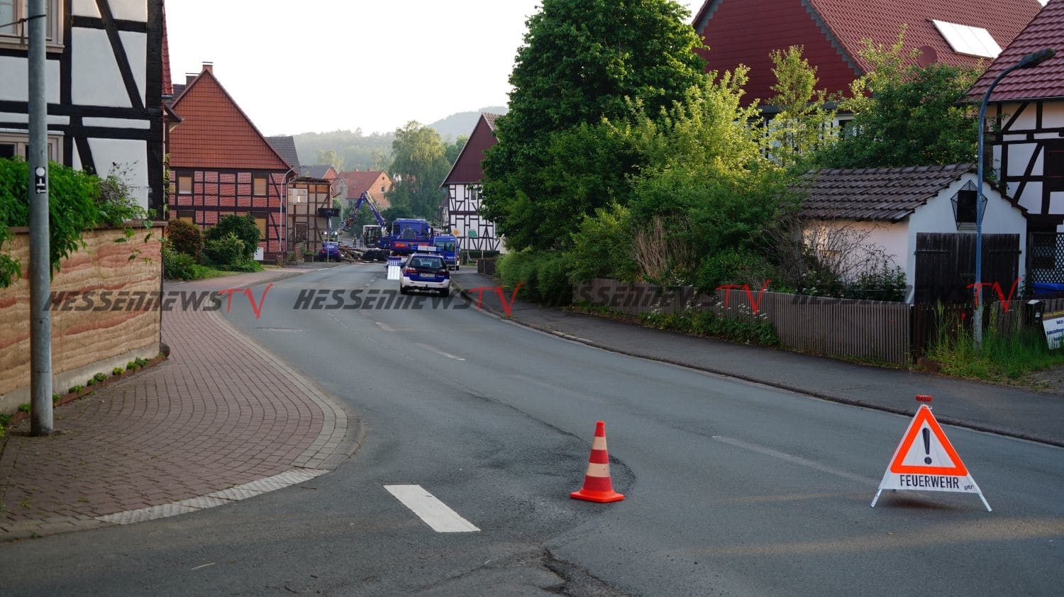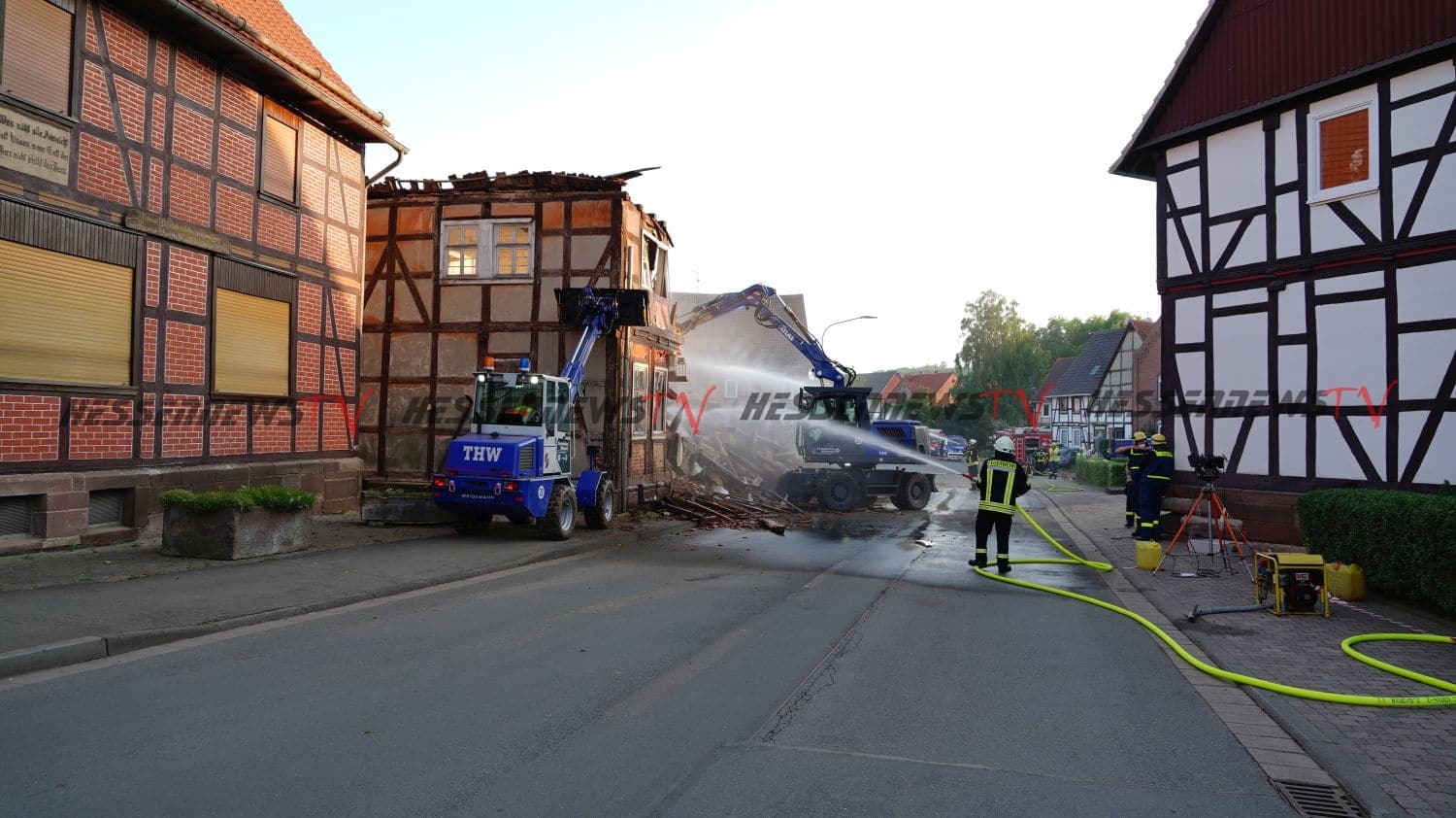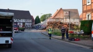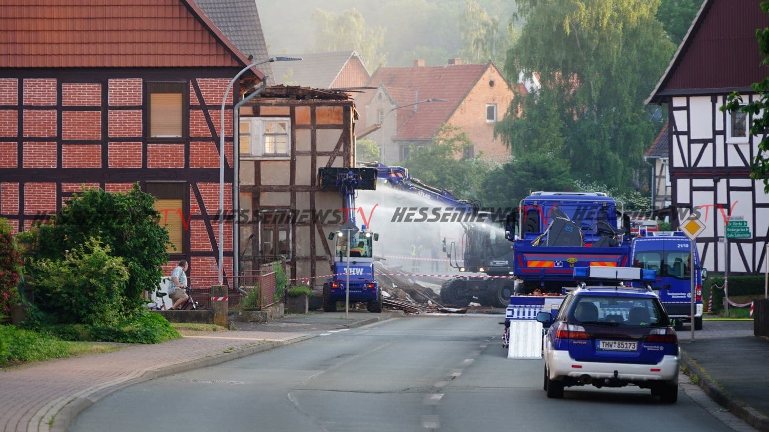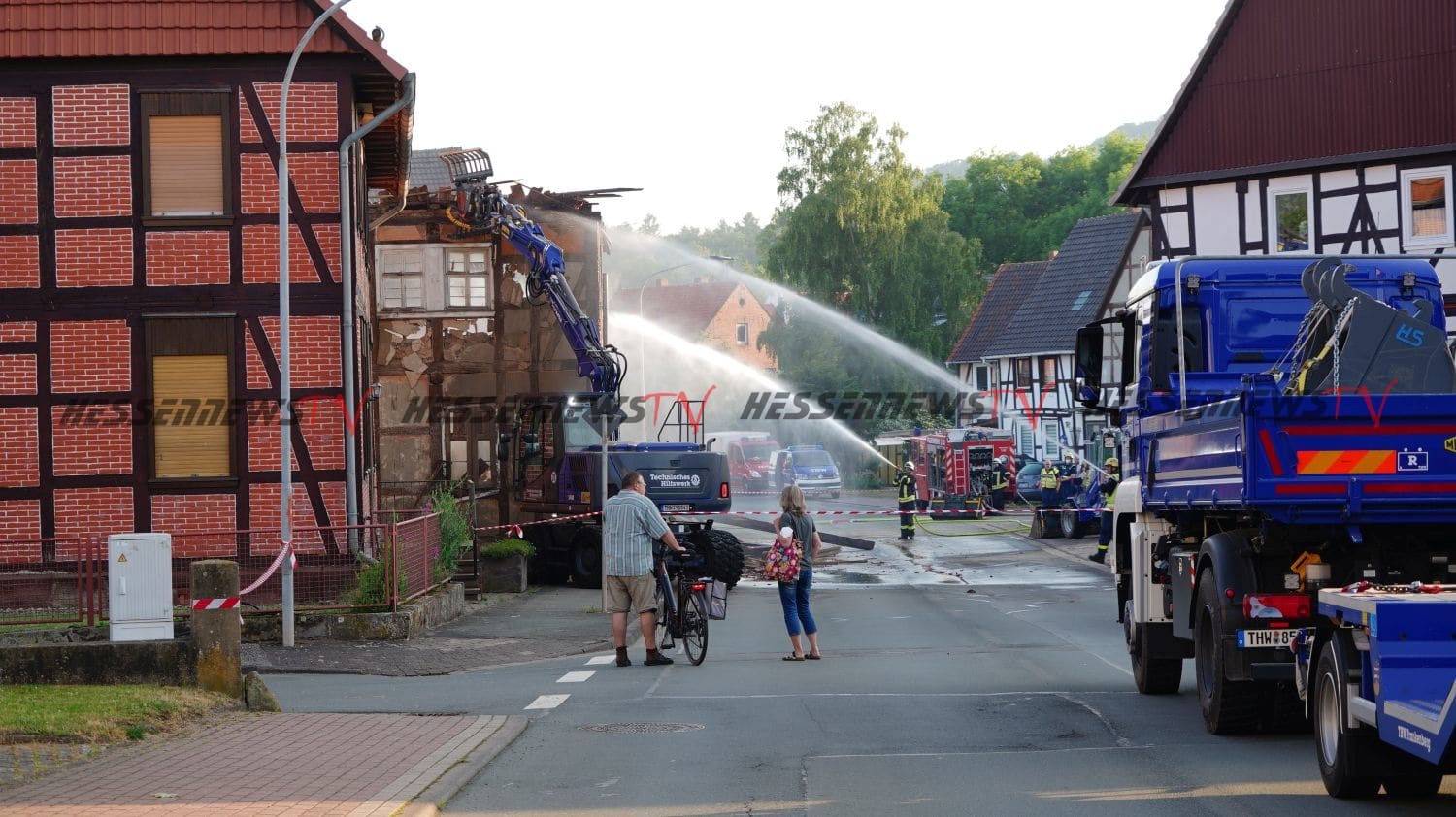 Volkmarsen – Die Anwohner in Volkmarsen-Ehringen wurden in der Nacht auf Samstag durch ein lautes Geräusch geweckt, kurz danach ging die Sirene. In der Ortsdurchfahrt in Höhe der Unterstraße war der Dachstuhl eines unbewohnten Haus eingestürzt. Die Feuerwehr, die gegen 22.45 Uhr alarmiert wurde, sicherte die Einsatzstelle ab. Im Gebäude waren keine Personen mehr. Noch in der Nacht wurde das THW Korbach und Frankenberg beauftragt, das Gebäude abzureißen. Die Ortsdurchfahrt ist weiterhin voll gesperrt. Der Ortsverband des DRK Korbach-Bad Arolsen versorgte die Einsatzkräfte mit Essen und Getränke.