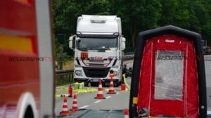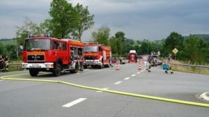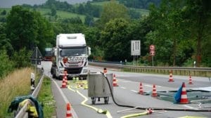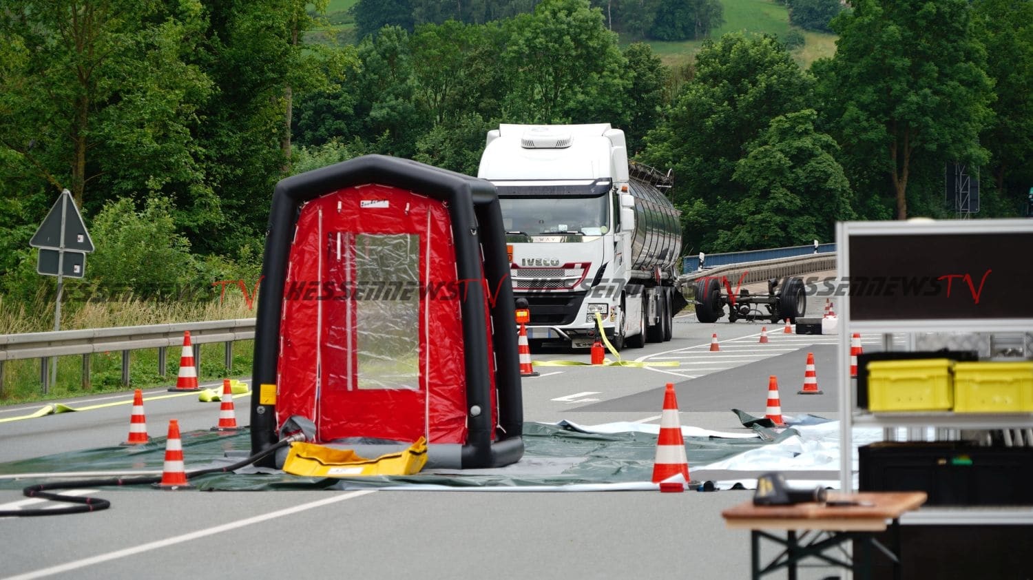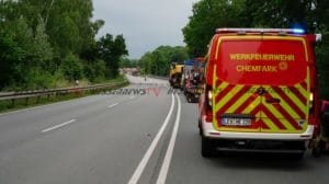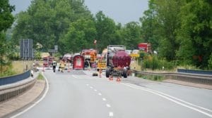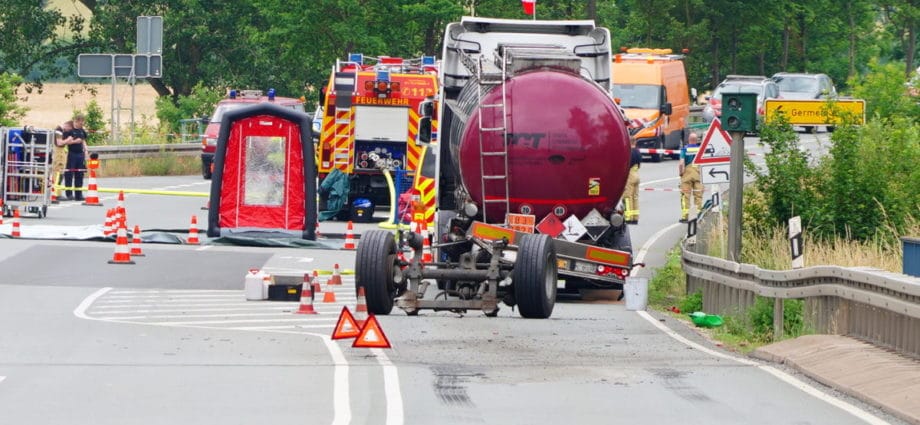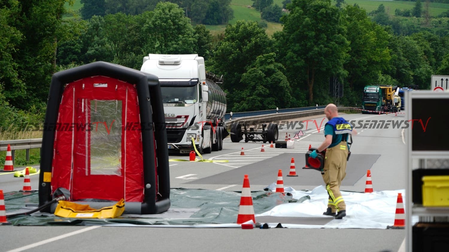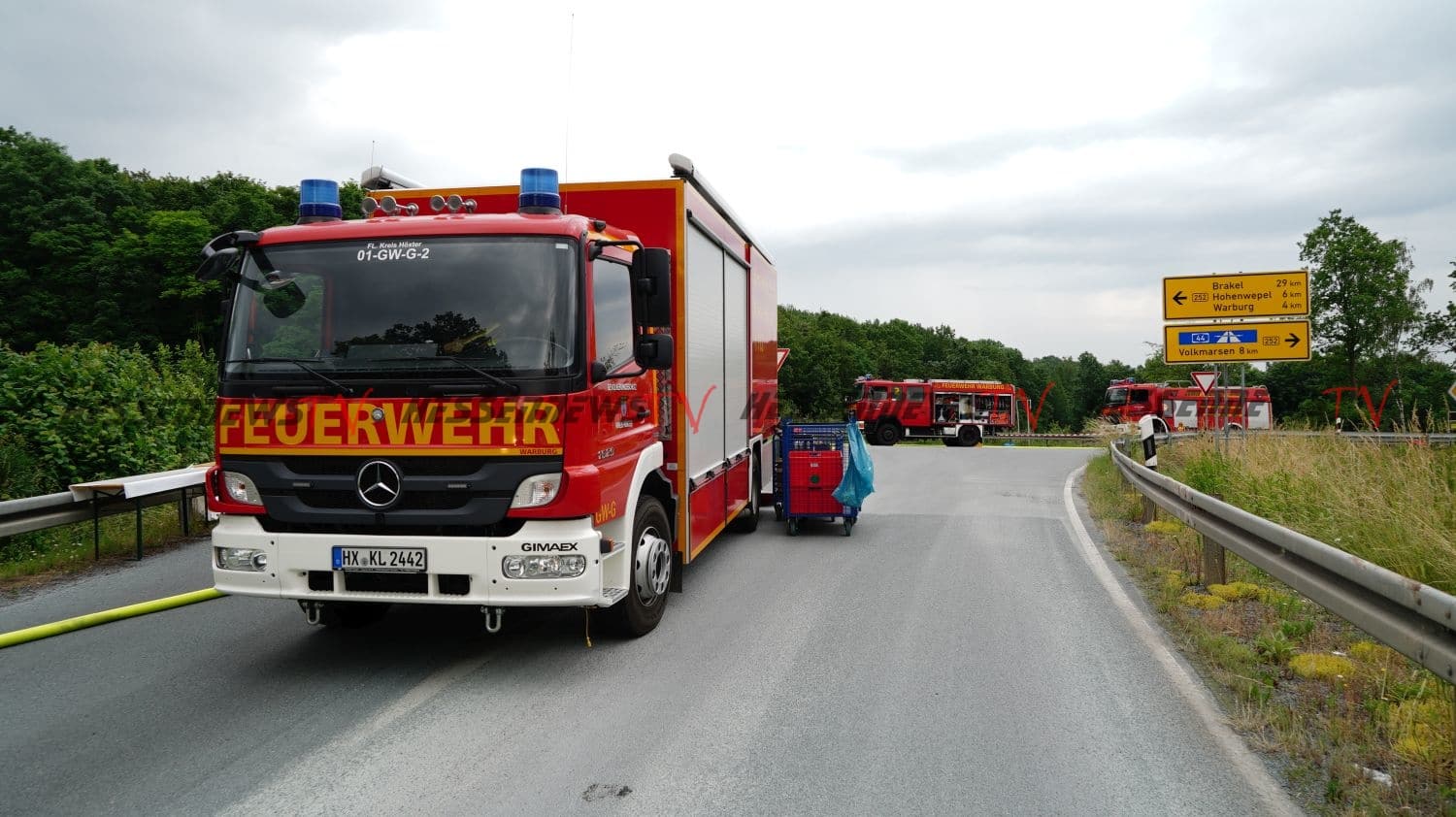 Warburg – Auf der B252 in Höhe der Abfahrt nach Warburg-Germete hat am Donnerstag ein Gefahrguttransporter eine Achse verloren. Aus dem Tank des Aufliegers trat eine ätzende Flüssigkeit aus. Gegen 11 Uhr befuhr ein 46-jähriger Fahrer mit einem Gefahrguttransporter die B252 von der Autobahnabfahrt in Richtung Warburg. In Höhe der Abfahrt nach Germete, löste sich aus noch ungeklärten Gründen die hintere Achse des Aufliegers. Dem Fahrer gelang es, die Zugmaschine nach wenigen Metern zum Stillstand zu bringen. Die Straße wurde für den Verkehr vollständig gesperrt. Der rumänische Fahrer erlitt einen Schock und wurde zunächst mit einem Rettungswagen in ein Krankenhaus eingeliefert und nach ambulanter Behandlung entlassen. Die Feuerwehr und die Untere Wasserbehörde wurden zur Gefahrensicherung und Gefährdungsbeurteilung hinzugerufen. Es wurde entschieden, dass der flüssige Inhalt aus dem beschädigten Gefahrguttank abgepumpt werden muss. Dazu wurde ein Spezialfahrzeug der Werkfeuerwehr Chempark aus Leverkusen angefordert. Aufgrund der aufwendigen Bergung bleibt die B252 voraussichtlich bis in die Abendstunden hinein im Abschnitt zwischen der Anschlussstelle A44 und der B7 bei Warburg gesperrt.
