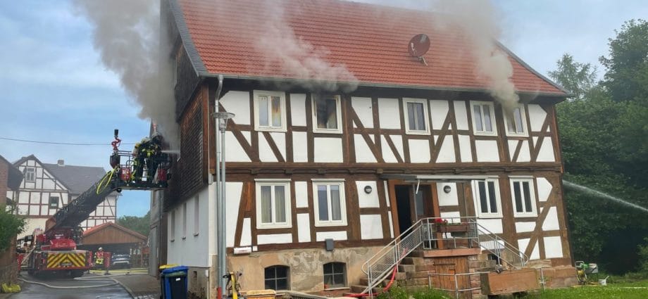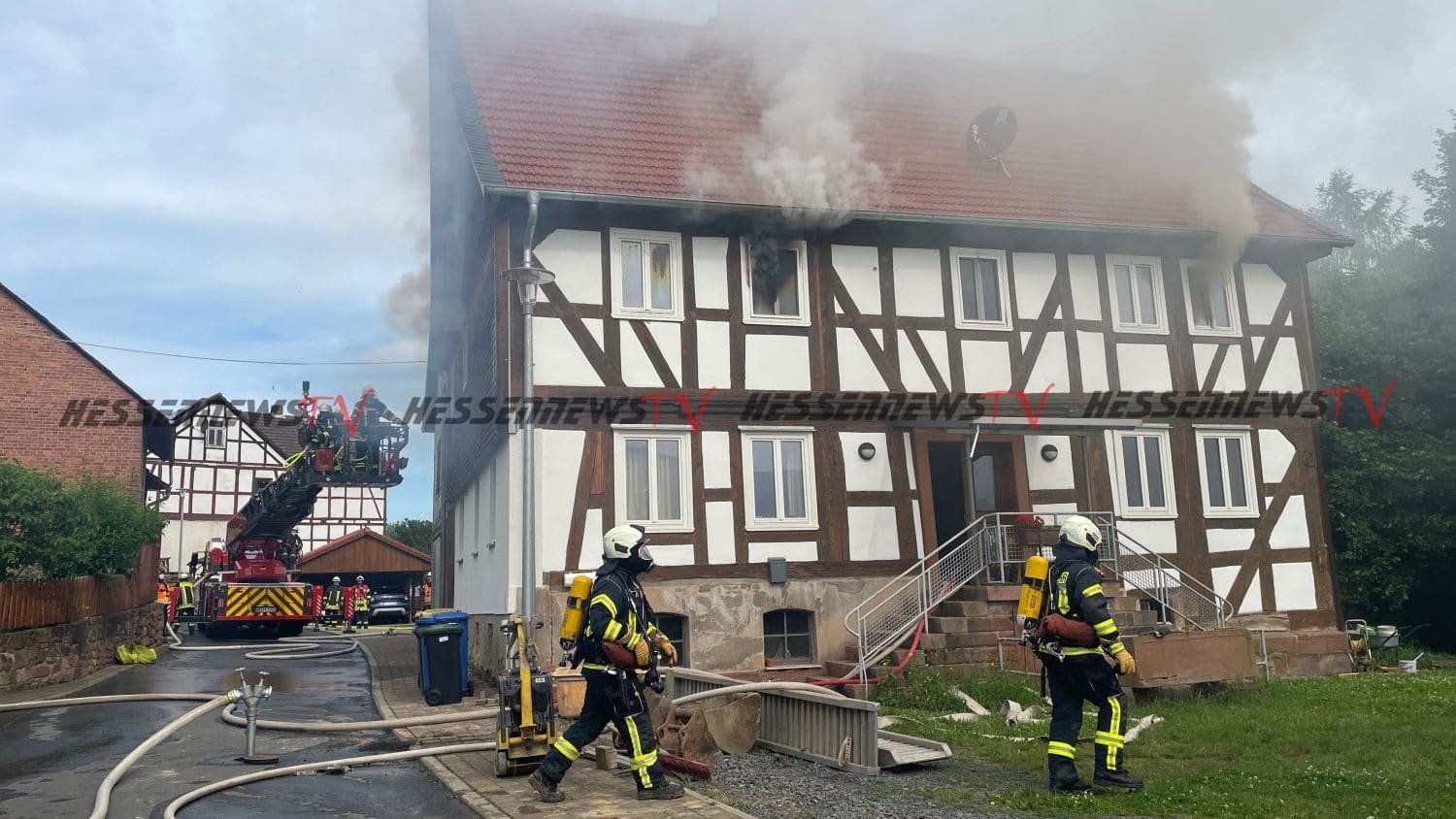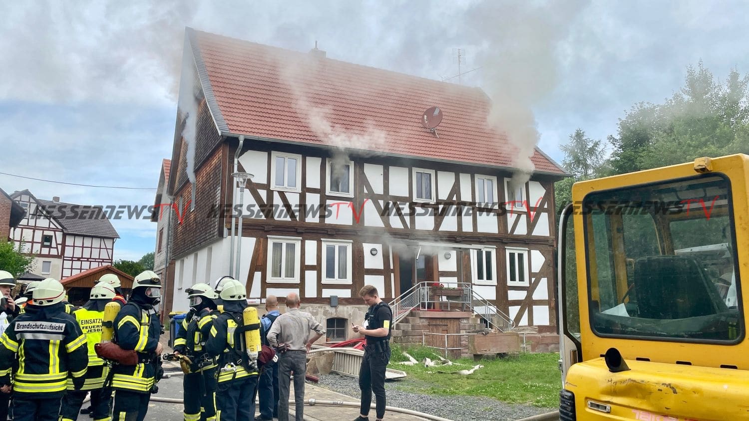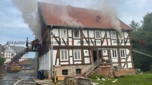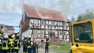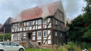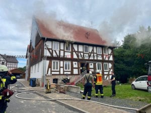 Jesberg – Am Donnerstagmorgen kam es im Ortskern von Elnrode zum einem Wohnhausbrand. Aus bislang ungeklärten Umständen brach im ersten Obergeschoss ein Feuer aus. Die Bewohner konnten ihr Fachwerkhaus rechtzeitig verlassen. Ein Feuerwehrmann wurde im Einsatz bei einem Treppensturz leicht verletzt. Am Donnerstagmorgen wurden die Einsatzkräfte von Feuerwehr, Polizei und Rettungsdienst nach Elnrode gerufen. Aus bislang ungeklärten Umständen kam es im ersten Obergeschoss eines Fachwerkhauses zu einem Brandausbruch. Die Einsatzkräfte hatten alle Hände voll zu tun und mussten unter anderen ein direkt angrenzendes Gebäude vor einem möglichen Übergreifen des Feuers schützen.