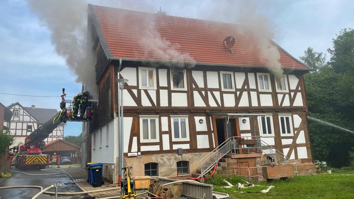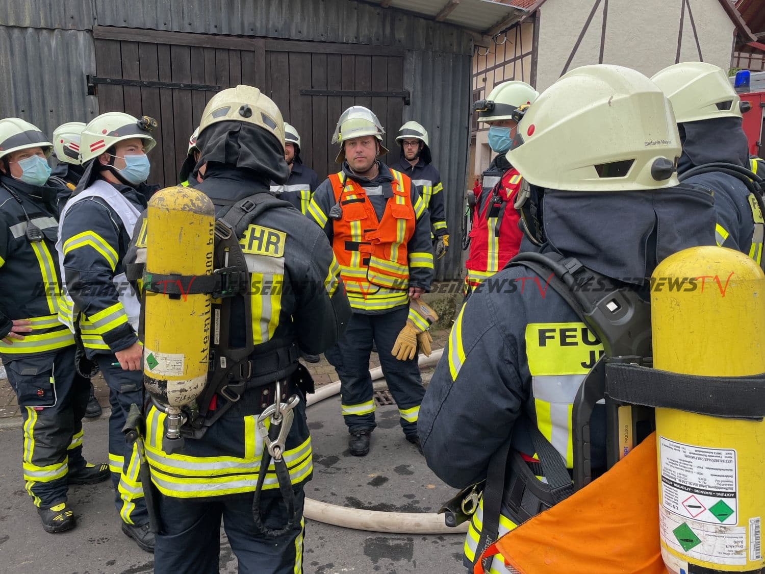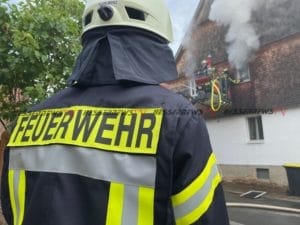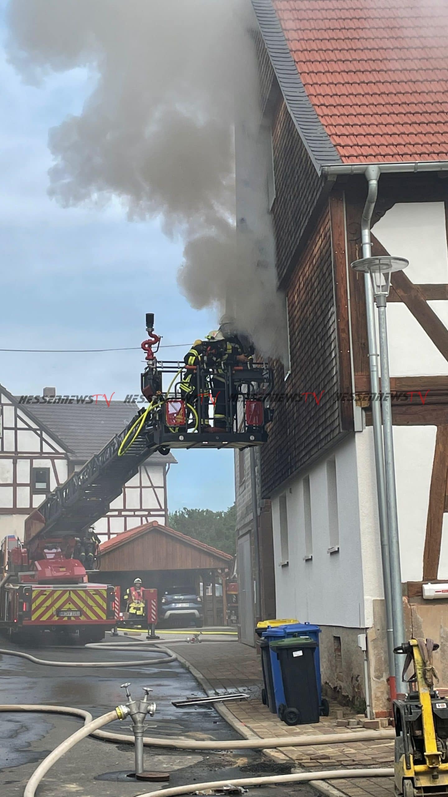 Jesberg – Am Donnerstagmorgen kam es im Ortskern von Elnrode zum einem Wohnhausbrand. Aus bislang ungeklärten Umständen brach im ersten Obergeschoss ein Feuer aus. Die Bewohner konnten ihr Fachwerkhaus rechtzeitig verlassen. Ein Feuerwehrmann wurde im Einsatz bei einem Treppensturz leicht verletzt. Am Donnerstagmorgen wurden die Einsatzkräfte von Feuerwehr, Polizei und Rettungsdienst nach Elnrode gerufen. Aus bislang ungeklärten Umständen kam es im ersten Obergeschoss eines Fachwerkhauses zu einem Brandausbruch. Die Einsatzkräfte hatten alle Hände voll zu tun und mussten unter anderen ein direkt angrenzendes Gebäude vor einem möglichen Übergreifen des Feuers schützen.