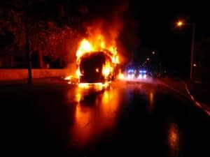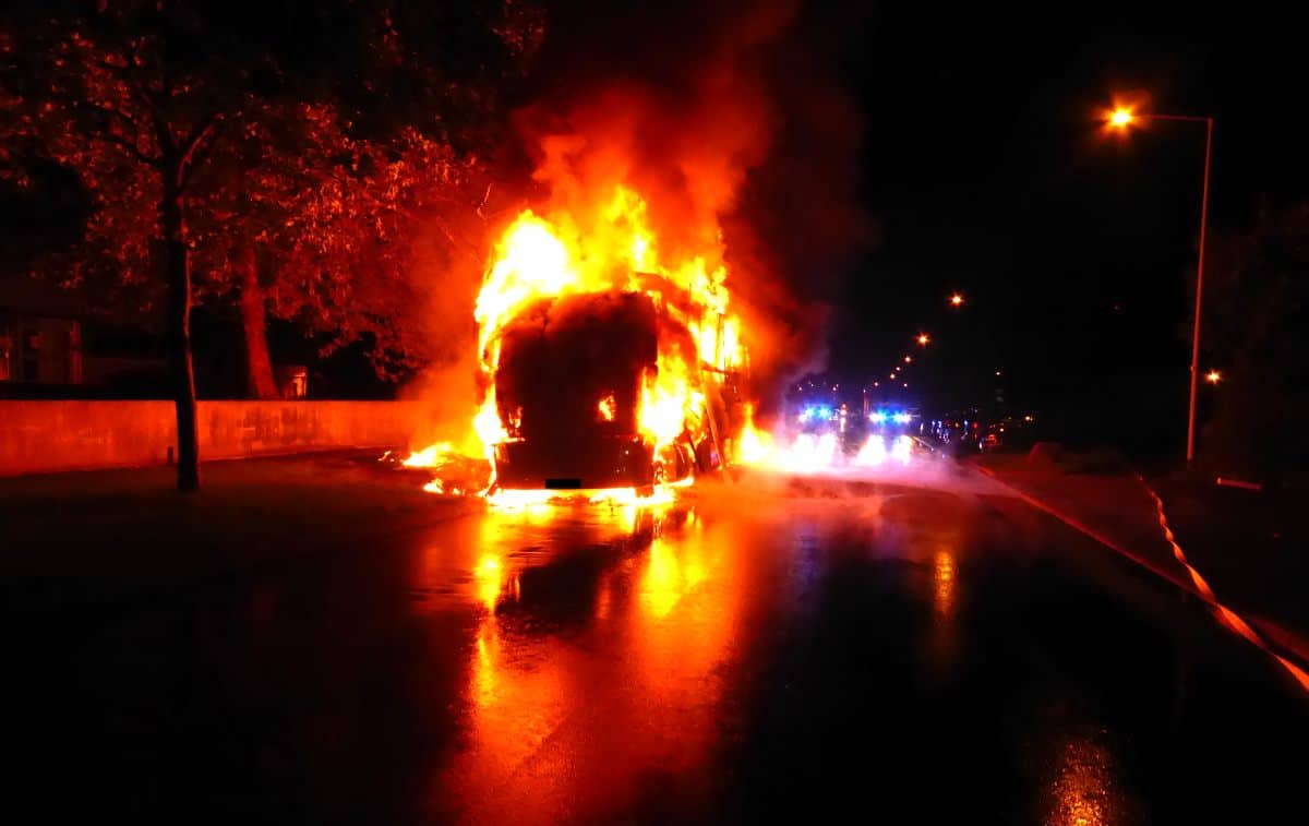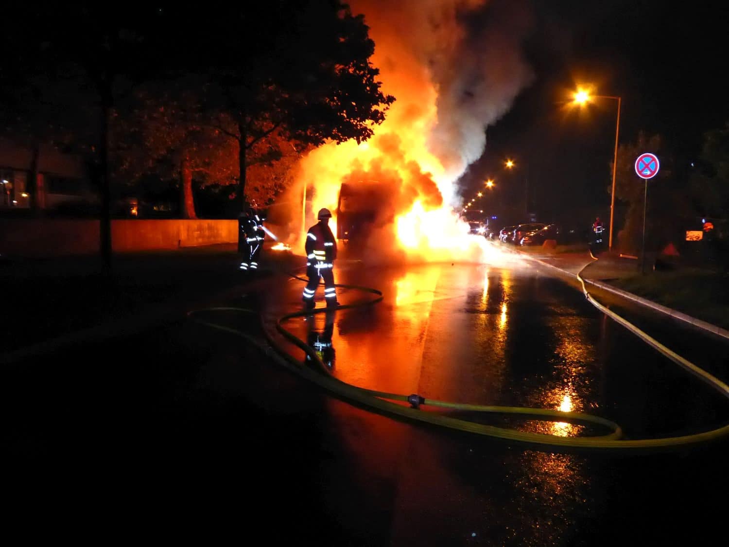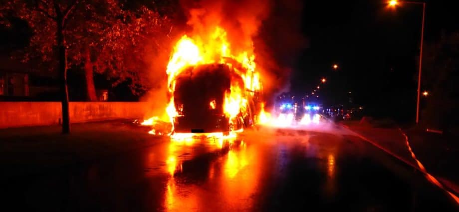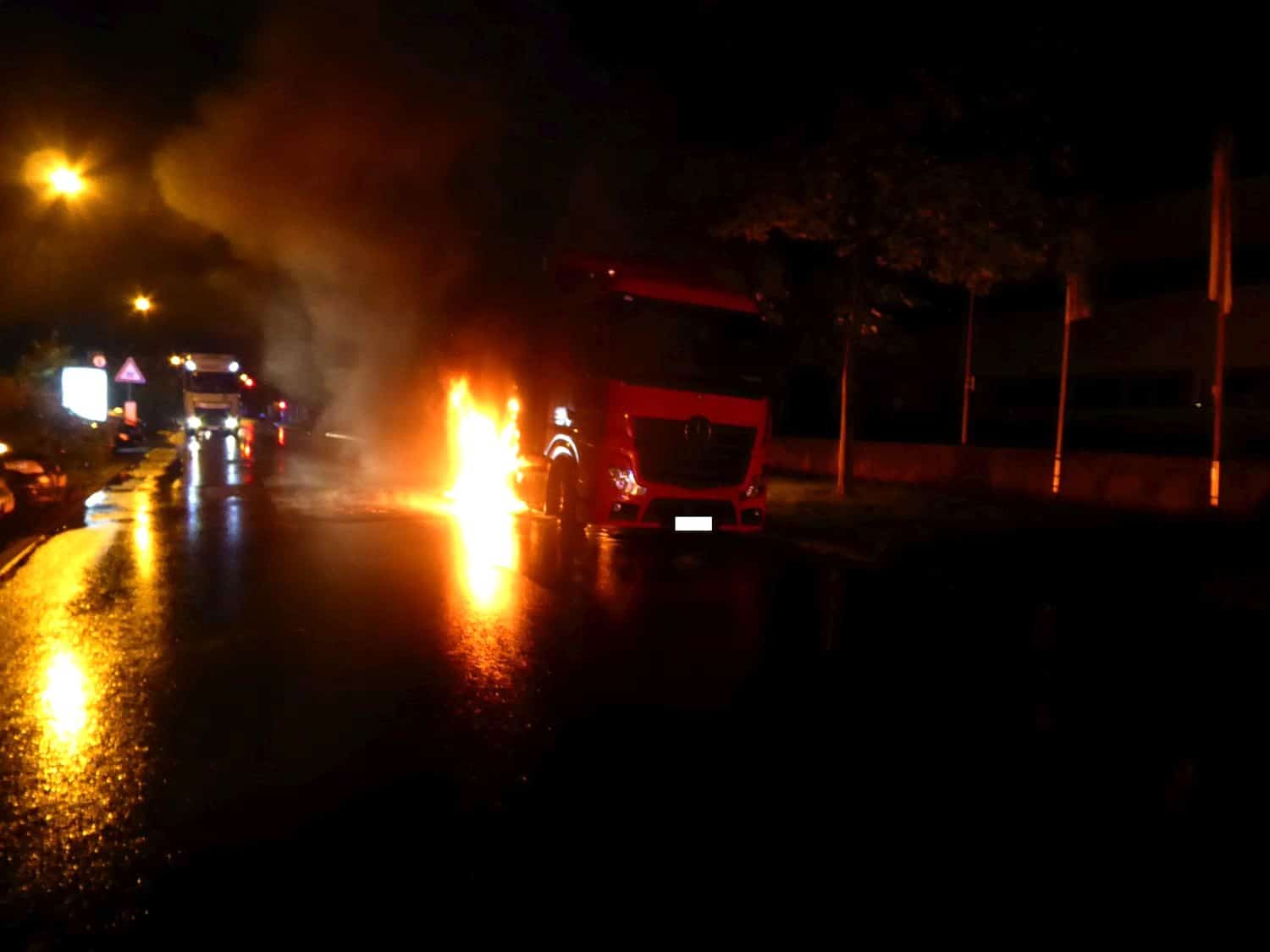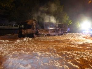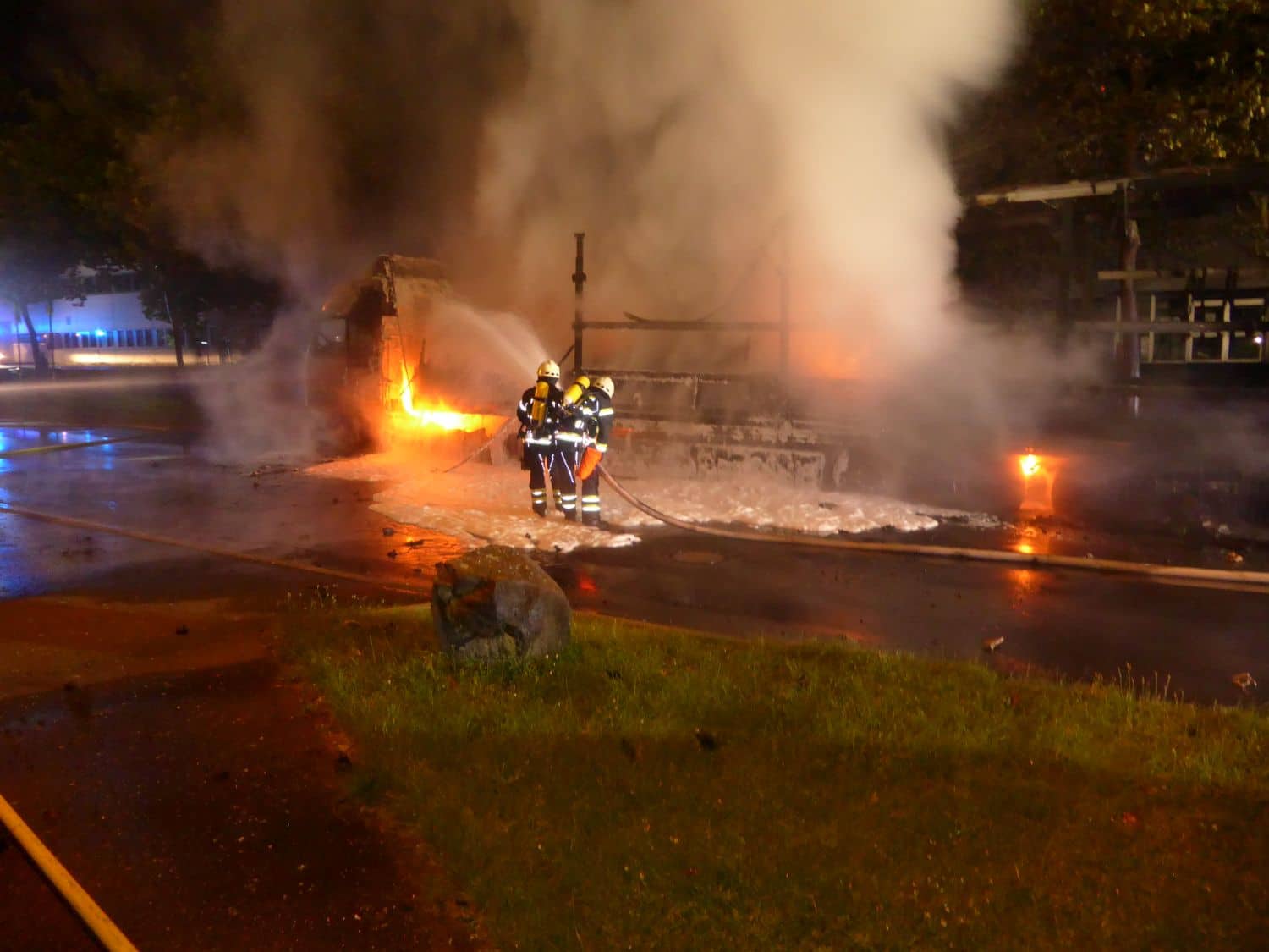 Kassel – Zwei brennende Sattelzüge im Industriegebiet Waldau beschäftigten die Feuerwehr Kassel in der Nacht auf Mittwoch. Ein Sattelzug brannte dabei komplett aus, an einem weiteren konnte ein größerer Schaden durch das schnelle Eingreifen der Feuerwehr verhindert werden. Gegen 00:30 Uhr wurde der Leitstelle der Feuerwehr Kassel ein brennender LKW in der Falderbaumstraße im Industriegebiet Waldau gemeldet. Daraufhin wurde umgehend der Löschzug der Berufsfeuerwehr der Feuerwache 1 sowie die Freiwillige Feuerwehr Kassel-Waldau alarmiert. Vor Ort brannte ein Sattelzug in voller Ausdehnung. Ein weiterer Sattelzug, rund 100 Meter entfernt abgestellt, brannte bereits im Bereich der hinteren Achse der Zugmaschine und das Feuer drohte unmittelbar auf das Fahrerhaus sowie auf den kompletten Auflieger überzugreifen. Mit einem gezielten und schnellen Löschangriff eines Trupps unter Atemschutz mit Strahlrohr konnte ein weiteres Übergreifen des Brandes verhindert und somit ein größerer Schaden abgewehrt werden. Bei dem im Vollbrand stehenden Sattelzug war ein massiver Löschangriff mehrerer Strahlrohre unter Zuhilfenahme von Löschschaum notwendig um das Feuer zu löschen, da sich Teile der Ladung und austretender Dieselkraftstoff immer wieder entzündeten. Der Einsatz der Feuerwehr war nach rund drei Stunden beendet. Kasselwasser sowie die Untere Wasserbehörde waren ebenfalls im Einsatz, dabei dem Brand größere Mengen Dieselkraftstoff und Betriebsmittel ausgetreten sind. Die Kraftstoffe sowie der Löschschaum wurden im weiteren Verlauf durch Kasselwasser aufgenommen. Die Falderbaumstraße bleibt bis zur Beendigung der Reinigungsarbeiten im Bereich der Einsatzstelle voll gesperrt. Zur Brandursache ermittelt die zuständige Kriminalpolizei.