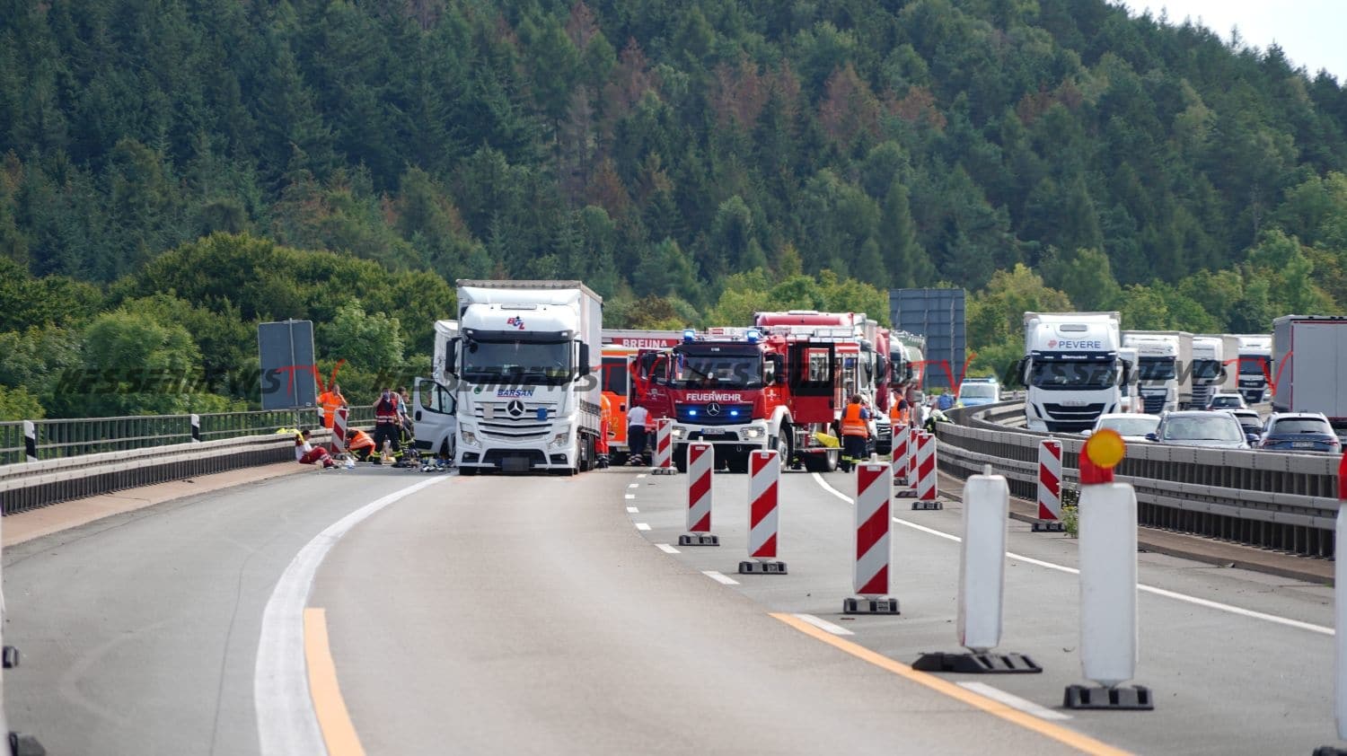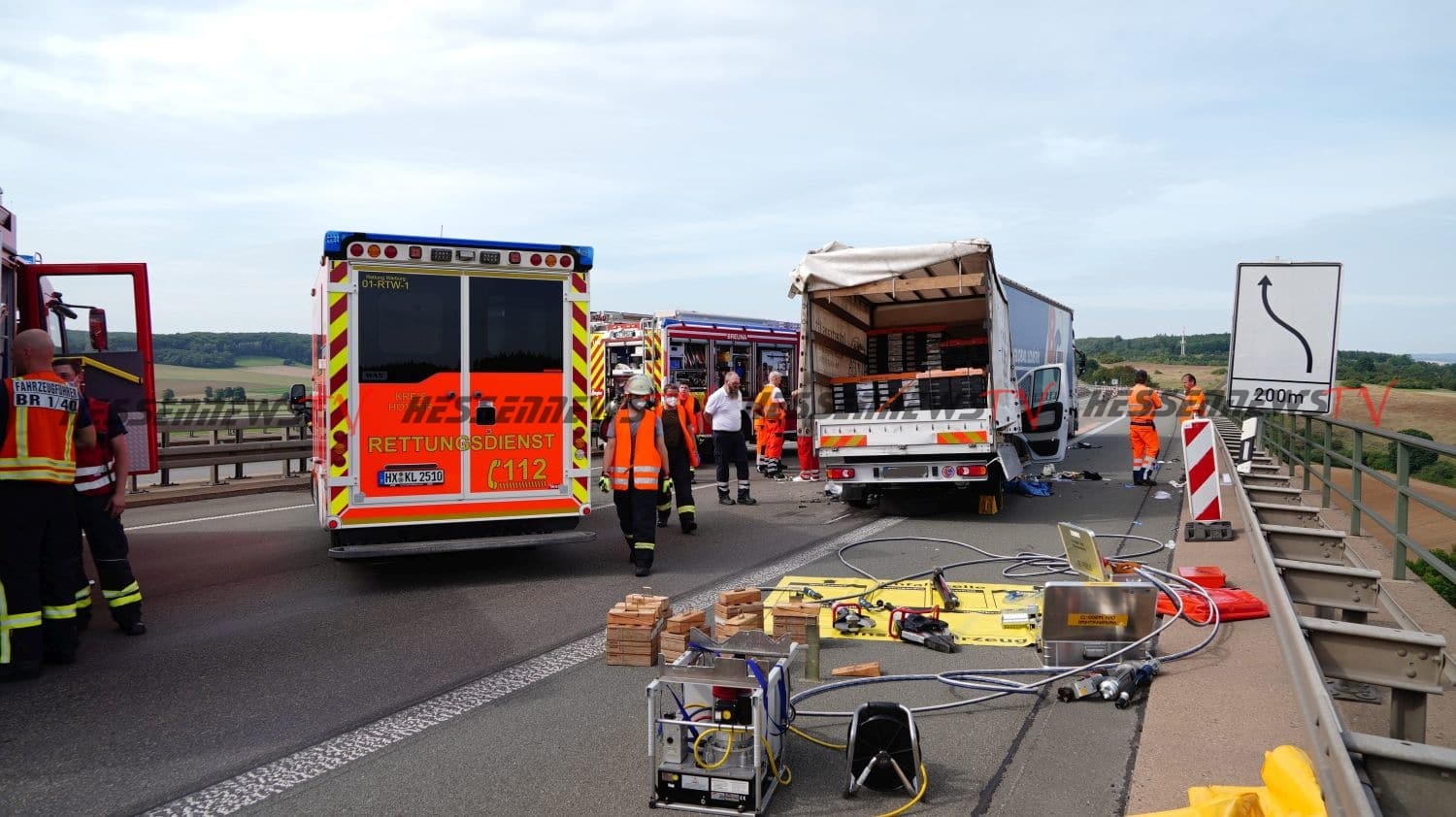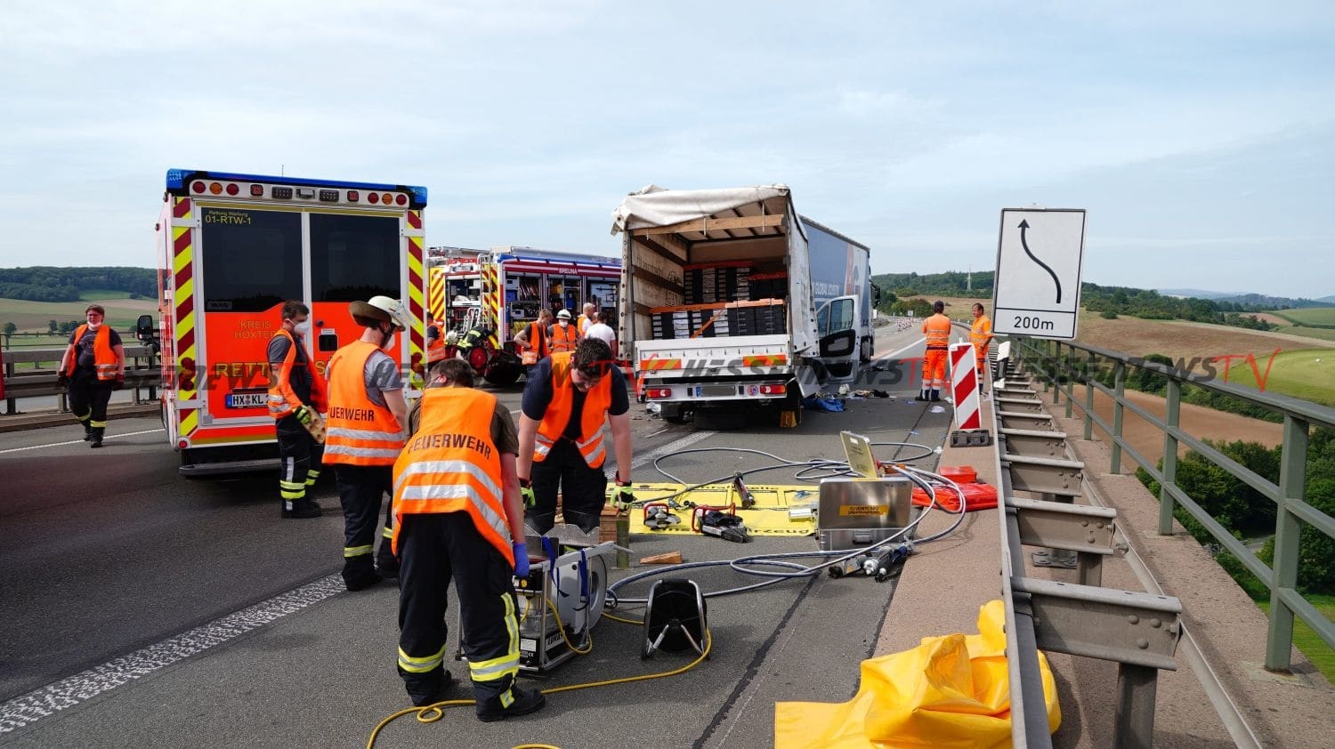 Warburg – Auf der A44 kam es am Dienstag zu einem schweren Verkehrsunfall. Ein 38-Jähriger LKW-Fahrer aus der Türkei befuhr die Autobahn von Breuna kommend in Fahrtrichtung Dortmund. Auf der Talbrücke rund einen Kilometer vor der Anschlussstelle Warburg, musste der Fahrer staubedingt in der Baustelle anhalten. Das übersah wohl ein 21-Jähriger Fahrer eines Kleintransporters aus Ungarn und fuhr auf den Sattelzug auf. Der Fahrer wurde schwer eingeklemmt und musste von der Feuerwehr Breuna und Wolfhagen aus dem Fahrerhaus gerettet werden. Nach einer Erstversorgung an der Unfallstelle, wurde der Fahrer mit dem Rettungshubschrauber Christoph 13 aus Bielefeld in ein Krankenhaus nach Kassel geflogen. Der Verkehr konnte auf der parallel verlaufenden Fahrbahn an der Unfallstelle vorbeigeleitet werden. Im Einsatz war auch die Berufsfeuerwehr Kassel mit einem Kran, der allerdings nicht zum Einsatz kommen musste. Für die Rettungs- und Bergungsarbeiten war der rechte Fahrstreifen für mehrere Stunden voll gesperrt. Somit war auch die Anschlussstelle Warburg voll gesperrt.
