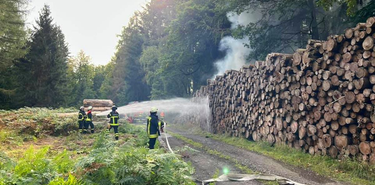 Volkmarsen – Gleich zweimal mussten die Brandschützer aus Volkmarsen am Sonntag zu brennenden Holzstapeln ausrücken. Zum ersten Brand kam es gegen 14.20 Uhr. Gemeinsam mit der Feuerwehr aus Bad Arolsen wurden die Einsatzkräfte zu einem „F Wald 2“ in einem Waldstück zwischen Bad Arolsen-Helsen und Volkmarsen-Külte alarmiert. Bereits auf der Anfahrt war eine starke Rauchentwicklung sichtbar. Beim Eintreffen der ersten Einsatzkräfte brannte ein aufgeschichteter Holzstapel. Um die Wasserversorgung sicherzustellen, wurde aus Helsen eine Schlauchleitung verlegt. Mit einem Rückeschlepper konnte man die Holzstämme umschichten, um besser an die Glutnester zu kommen.