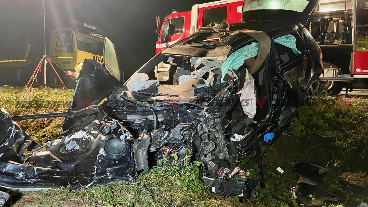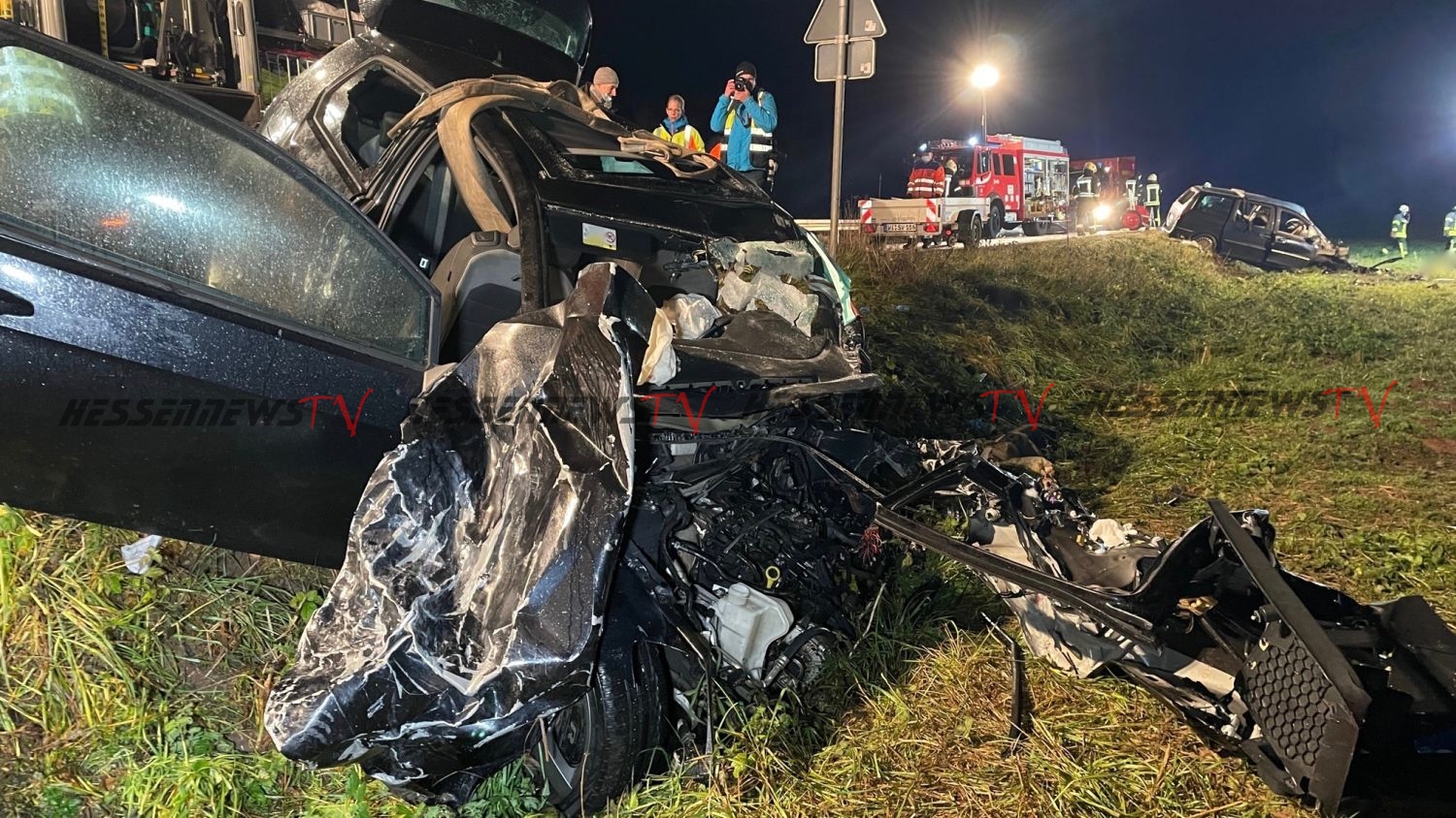 Durch den heftigen Zusammenprall wurde beide Fahrzeuge komplett zerstört. Die vier Fahrzeuginsassen im Golf, im Alter von 27 bis 57 Jahren, sowie die 42-jährige Fahrerin des Lancia wurden tödlich verletzt. Ein auf der Rückfahrt von einem Einsatz befindliche Rettungswagenbesatzung aus Bad Wildungen, welche nur kurze Zeit nach dem Zusammenprall an der Unfallstelle eintraf, sowie ein Arzt, konnten den Verunfallten nicht mehr helfen. Für die Feuerwehr Fritzlar keine leichte Aufgabe. Die zum Teil schwer eingeklemmten Fahrzeuginsassen beider Fahrzeuge mussten nach Auskunft von Stadtbrandinspektor Rüdiger Hanke mit hydraulischen Geräten befreit werden. Da außerdem beide Fahrzeuge an einem Hang lagen, mussten diese zudem unterbaut und vor einem möglichen abrutschen zusätzlich gesichert werden. Hanke: „Für die Einsatzkräfte ist das ein schreckliches Bild (…) Wir haben auch einen Notfallseelsorger für die Einsatzkräfte hier vor Ort“. Landrat Winfried Becker und Fritzlars Bürgermeister Hartmut Spogat machten sich vor Ort ein Bild der Lage. Becker: „Dieser schlimme Einsatz ist eine Herausforderung für alle Einsatzkräfte.“ Insgesamt waren fünf Rettungswagen, zwei Notärzte, ein Leitender Notarzt, zwei Organisatorische Leiter Rettungsdienst, die Feuerwehr Fritzlar, ein Bahnmanager sowie die Polizei des Landkreises vor Ort im Einsatz. Die Bundesstraße 253 war während der Rettungs-, Bergungs- und Gutachtermaßnahmen für mehrere Stunden voll gesperrt. (mpu)