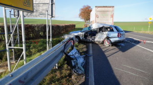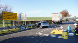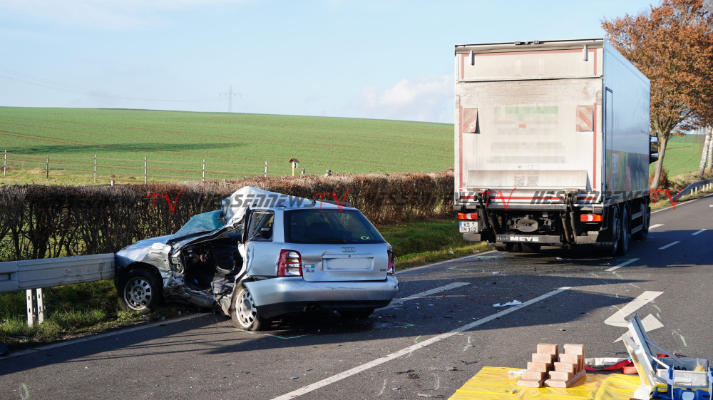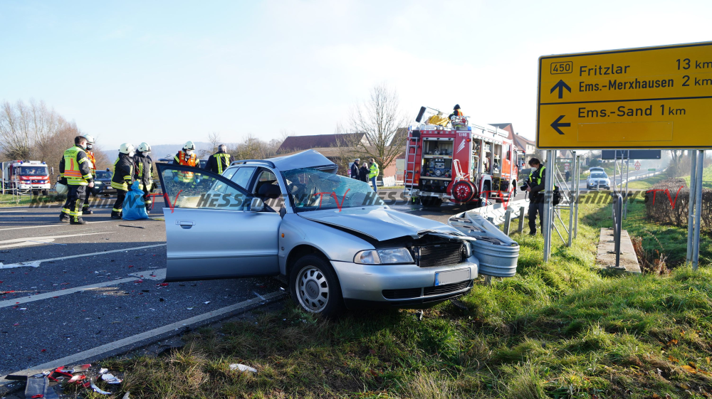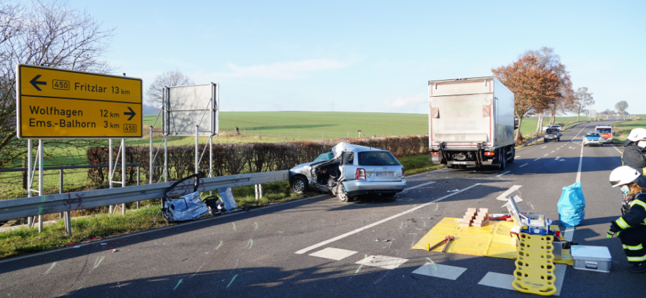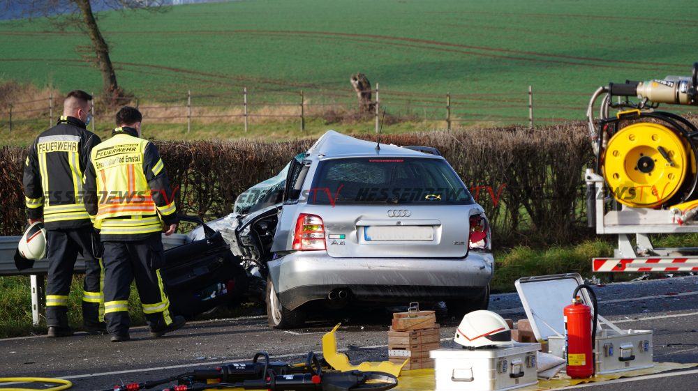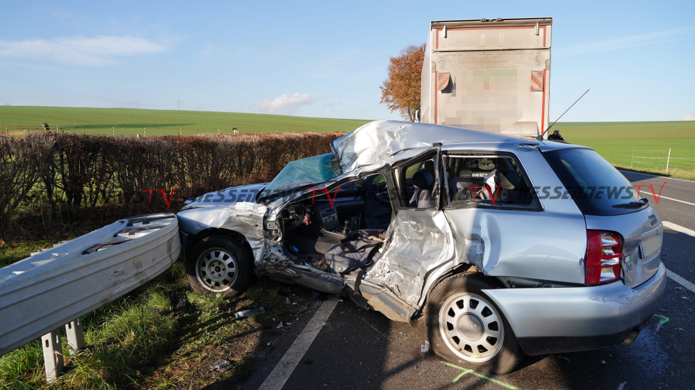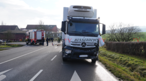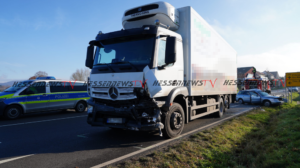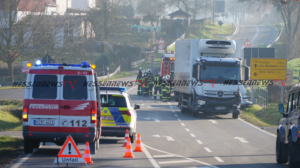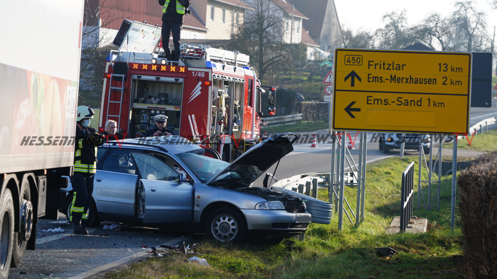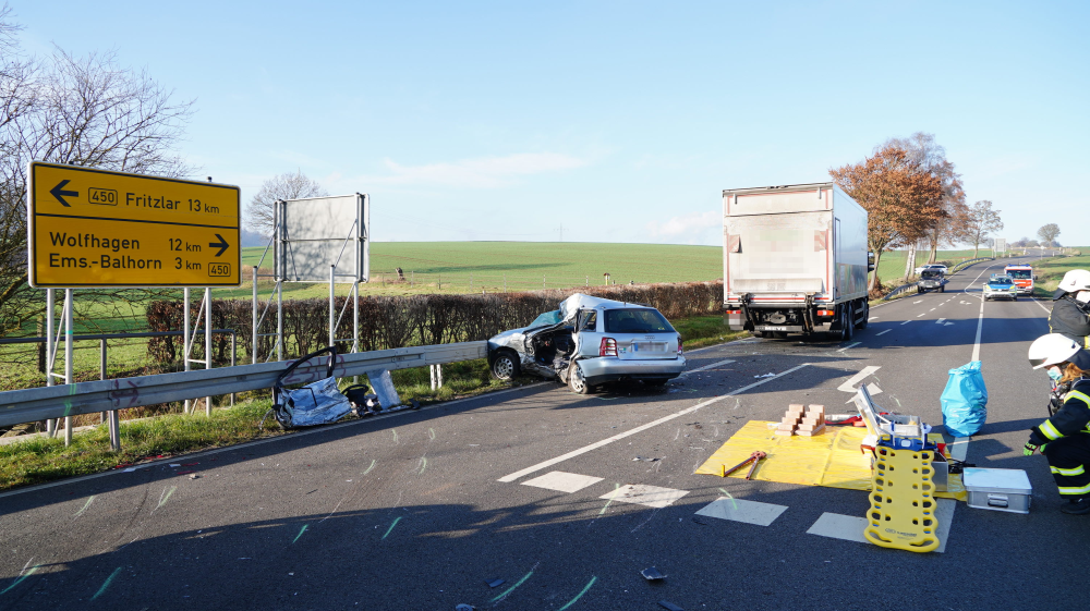 Bad Emstal – Auf der B450 bei Bad Emstal-Sand kam es am Montagmorgen gegen 10.45 Uhr zu einem schweren Verkehrsunfall. Eine PKW-Fahrerin kam aus Bad Emstal-Sand und wollte auf die B450 in Richtung Fritzlar einbiegen. Dabei übersah Sie offenbar den LKW von Fritzlar kommend. Es kam zum Zusammenstoß auf der Bundesstraße. Für die 81-jährige Fahrerin aus Niedenstein kam jede Hilfe zu spät, Sie verstarb noch an der Unfallstelle. Auch ein Hund der mit im Fahrzeug war, überlebte den Unfall nicht. Der 68-jährige Fahrer des Lkw, der ebenfalls aus Niedenstein stammt blieb unverletzt. Ob die aktuell tiefstehende Sonne als Unfallursache in Betracht kommt, ist derzeit noch unklar. Mit der Rekonstruktion des Unfallhergangs wurde ein Gutachter beauftragt. Die Bundesstraße war für mehrere Stunden voll gesperrt und konnte erst gegen 16.10 Uhr wieder für den Verkehr freigegeben werden.