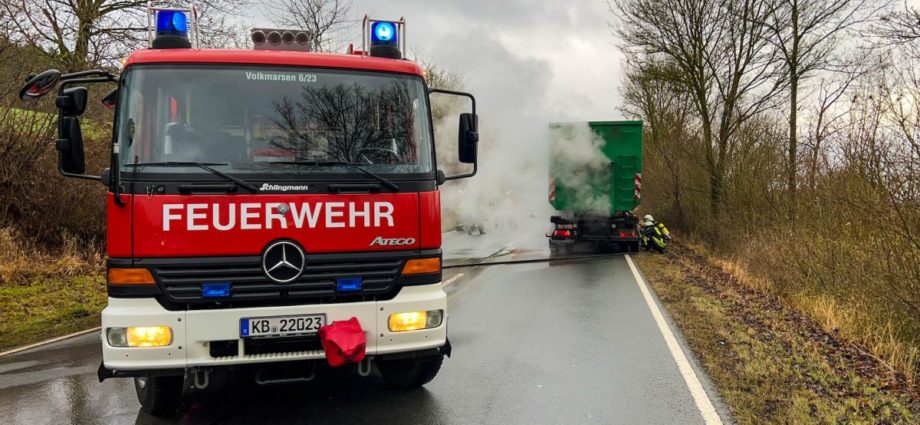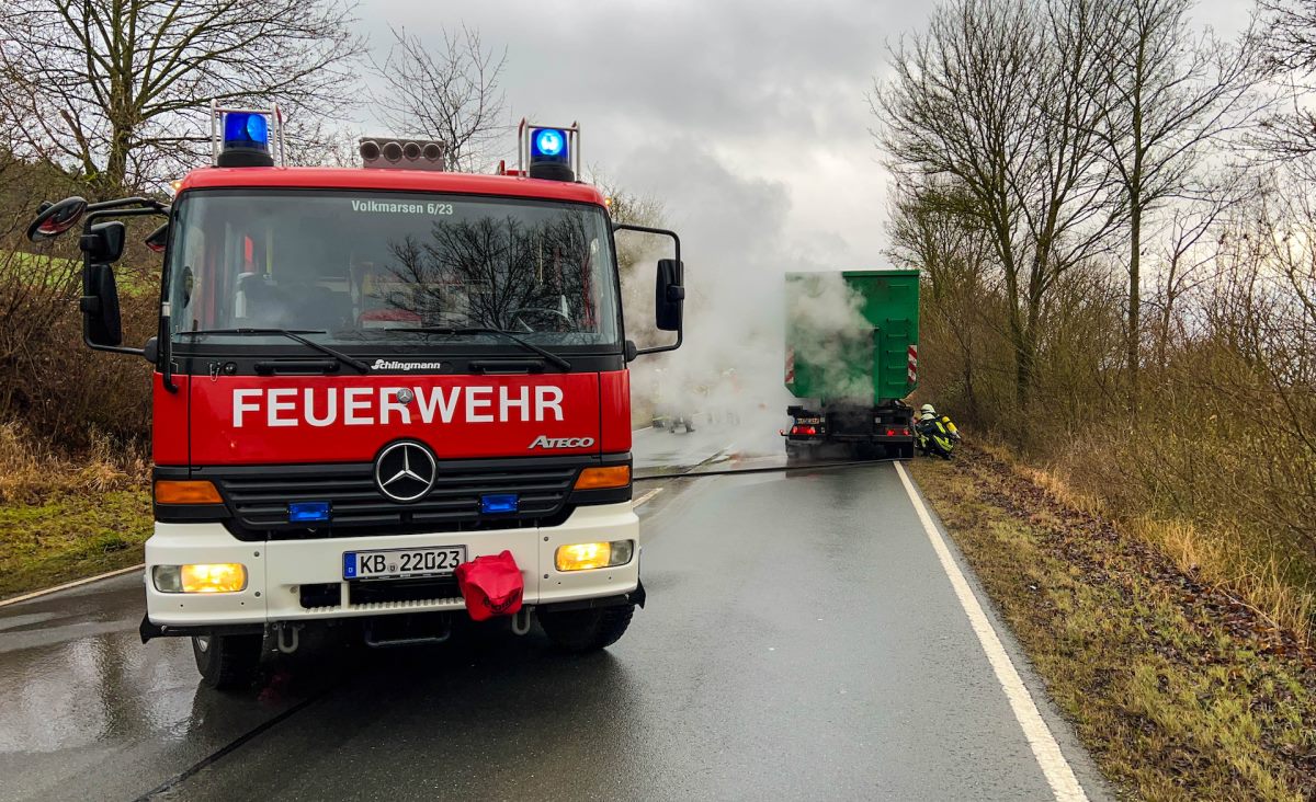 Volkmarsen – Am Mittwochvormittag gegen 10:30 Uhr wurde die Feuerwehr Volkmarsen zu einem LKW Brand auf die L3075 zwischen Volkmarsen und Welda alarmiert. Bereits auf der Anfahrt konnten die Einsatzkräfte eine Rauchentwicklung wahrnehmen. Beim Eintreffen an der Einsatzstelle schlugen Flammen aus dem Radkasten, umgehend nahm der Angriffstrupp die Schnellangriffseinrichtung unter Atemschutz vor. Durch den schnellen und effektiven Löschangriff konnte der Entstehungsbrand schnell gelöscht und die Bremsanlage am LKW-Anhänger gekühlt werden. Somit wurde ein größerer Sachschaden am LKW vermieden. Auch die Ladung, mehrere Tonnen Hackschnitzel blieb unbeschädigt. Während der Löscharbeiten war die Landstraße zwischen Volkmarsen und Welda vollgesperrt. Nach rund einer Stunde war der Einsatz für die 30 Einsatzkräften beendet und die Fahrbahn konnte wieder freigegeben werden.