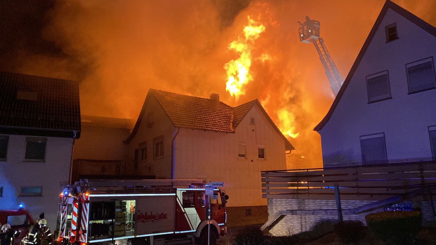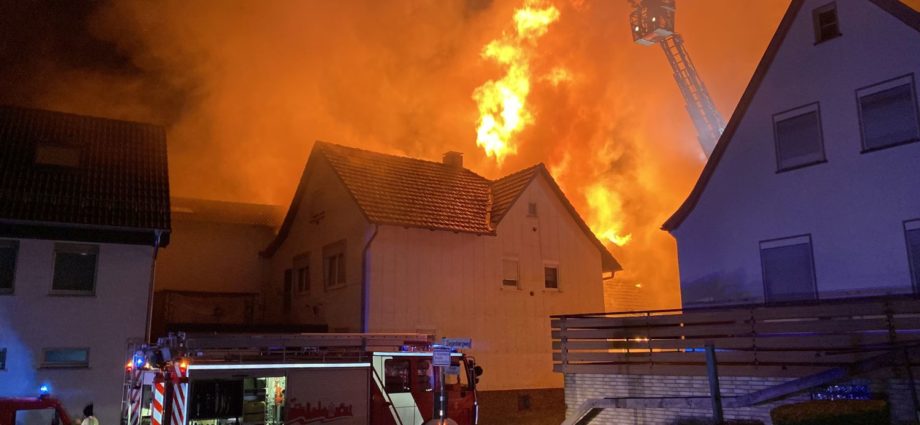 Bad Hersfeld – Böses Erwachen in der Neujahrsnacht gegen 2 Uhr für die Bewohner eines Wohnhauses mit Scheune in der Mühlestraße im Bad Hersfelder Ortsteil Asbach. Ihre an das Wohnhaus angrenzende Scheune war aus ungeklärter Ursache in Brand geraten. Als die ersten Kräfte der Feuerwehr an der Einsatzstelle eintrafen, stand die große Scheune bereits im Vollbrand. Die Bewohner des Hauses hatten ihr Haus verlassen und befanden sich auf der Straße in Sicherheit. Einsatzkräfte aus Bad Hersfeld und dem Fuldatal versuchten von mehreren Seiten und über eine Drehleiter das Feuer einzukreisen, konnten aber nicht verhindern, dass die Scheune nicht mehr zu retten war und noch während der Löscharbeiten einstürzte. Auch ein Übergreifen der Flammen auf das angrenzende Wohnhaus konnte nicht verhindert werden. Ein hinter den Gebäuden befindlicher Gastank wurde durch eine Riegelstellung gekühlt und konnte durch die Einsatzkräfte gesichert werden. Auch ein an das Wohnhaus grenzendes Gebäude musste durch eine Riegelstellung geschützt werden. Von Mehreren Seiten musste über Hydranten und aus Gewässern eine Wasserversorgung aufgebaut werden um ausreichend Löschwasser zur Verfügung zu haben. Die Örtliche Wasserversorgung war an der absoluten Belastungsgrenze. Eine weitere Drehleiter aus Rotenburg a.d.Fulda wurde angefordert um die rund 100 Feuerwehrleute vor Ort zu unterstützen. Während der Löscharbeiten verletzten sich zwei Feuerwehrleute und mussten