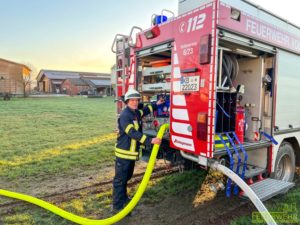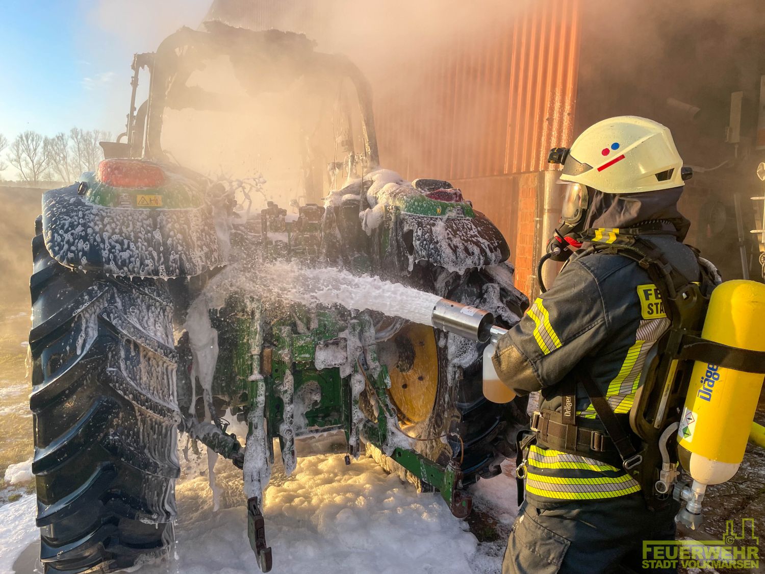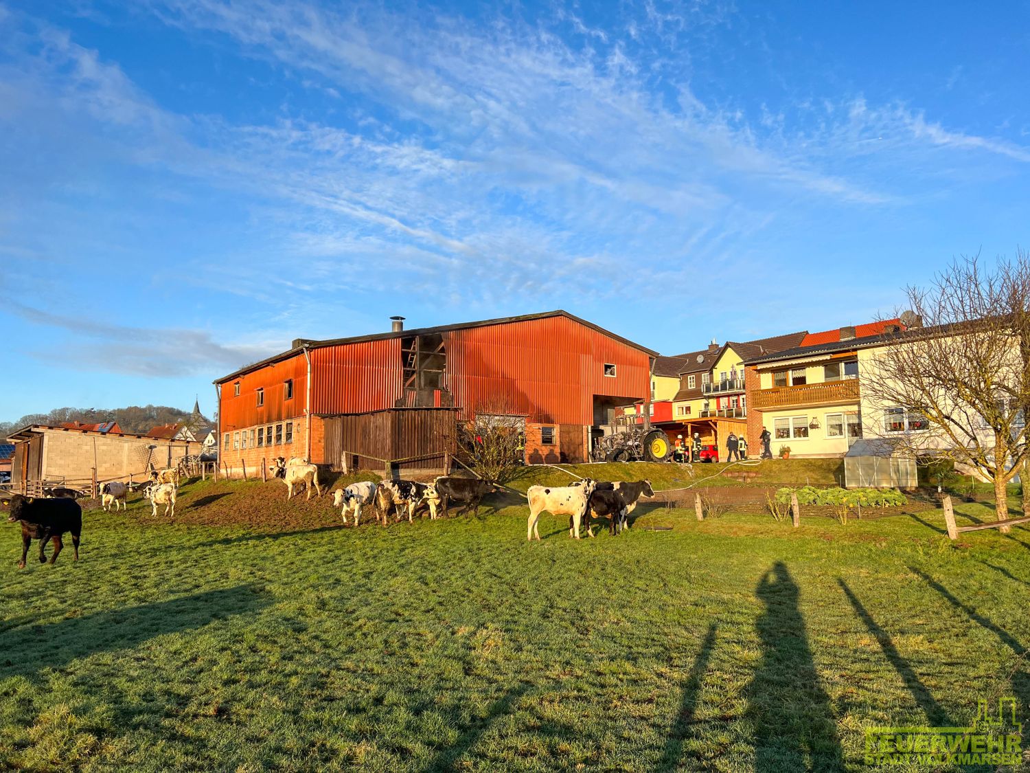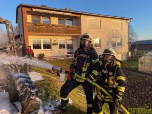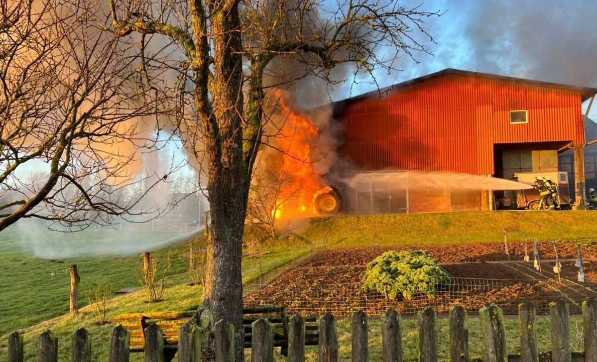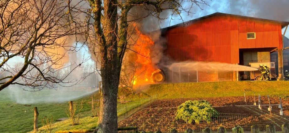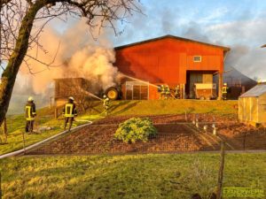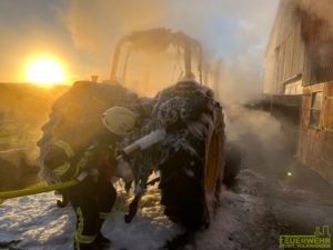 Volkmarsen – Am frühen Donnerstagmorgen wurde die Feuerwehr Volkmarsen gegen 08:40 uhr zu einem Traktor-Brand alarmiert. In Volkmarsen-Külte kam es aus bislang ungeklärter Ursache zu einem Traktorbrand, der sich bereits auf den angrenzenden Kuhstall ausbreitete. Umgehend wurde eine massive Riegelstellung unter Atemschutz aufgebaut, um den angrenzenden Kuhstall, sowie den nahegelegenen Dieseltank zu schützen. Gleichzeitig wurde der Traktorbrand direkt bekämpft. Parallel zum Löschangriff wurden die Kühe vorsichtshalber von der Stallung auf eine angrenzende Weide getrieben, um einen möglichen Kontakt mit Rauchgasen zu vermeiden. Auf Grund der hohen Temperaturen platzen die Reifen des Treckers und die Scheiben der Stallung, so dass sich die ersten Flammen bereits ins innere fraßen. Die gefährdeten Bereiche in der Stallung wurden ebenfalls von einem Atemschutztrupp mit Hilfe der Wärmebildkamera kontrolliert und abgelöscht. Die Wasserversorgung wurde über das nahgelegene Hydrantennetz sichergestellt. Zur Problematik an der Einsatzstelle wurden die Minusgrade, da das Löschwasser sehr schnell auf dem Boden eingefroren ist. Zeitnah war aber auch der Volkmarser Bau- und Instandhaltungsbetrieb mit einem Streufahrzeug zur Stelle. Während den Löscharbeiten wurde eine Feuerwehrkameradin leicht verletzt. Durch das schnelle Eingreifen der rund 60 ehrenamtlichen Kräfte konnte ein größerer Brand mit hohem Sachschaden verhindert werden.