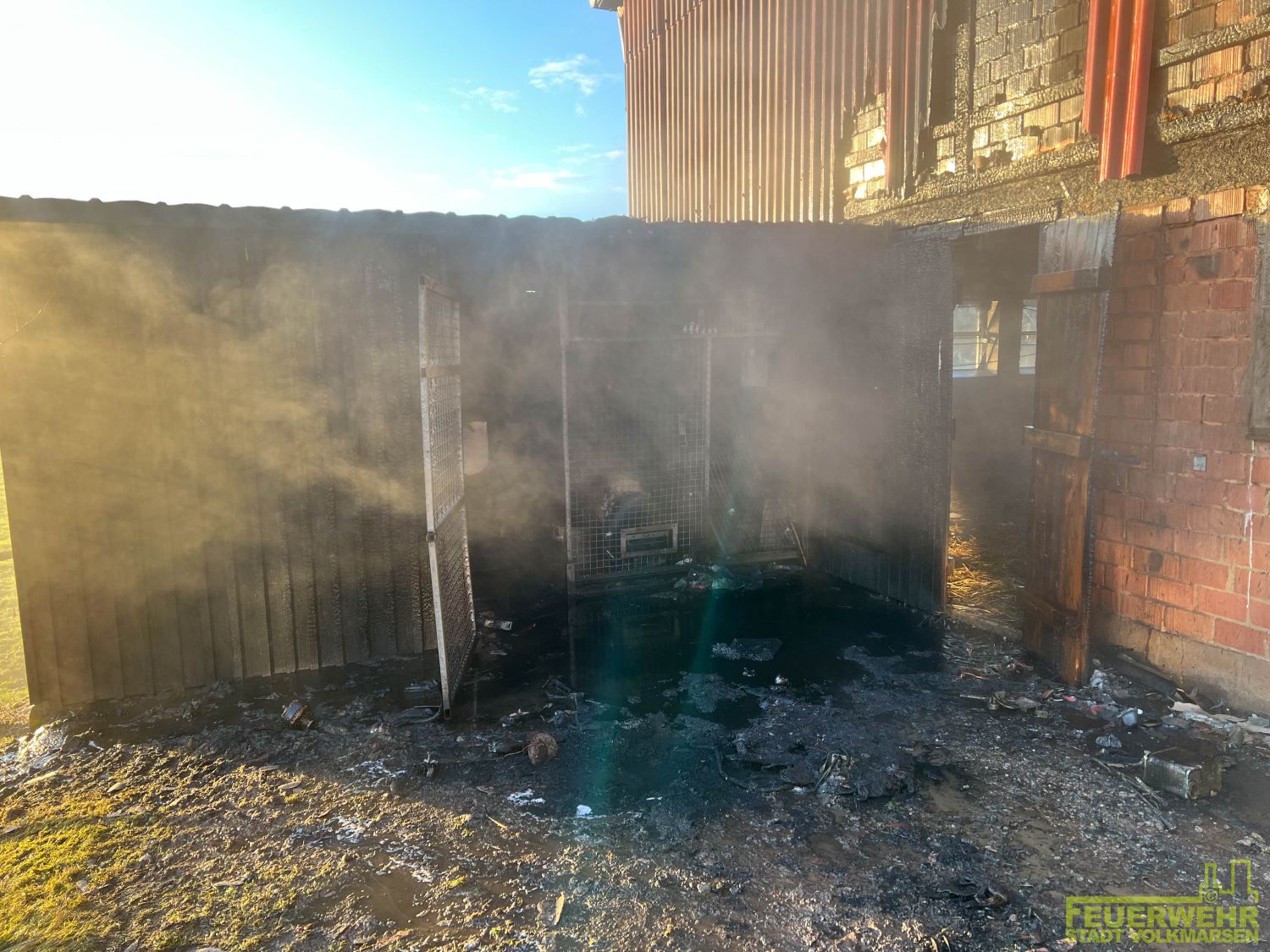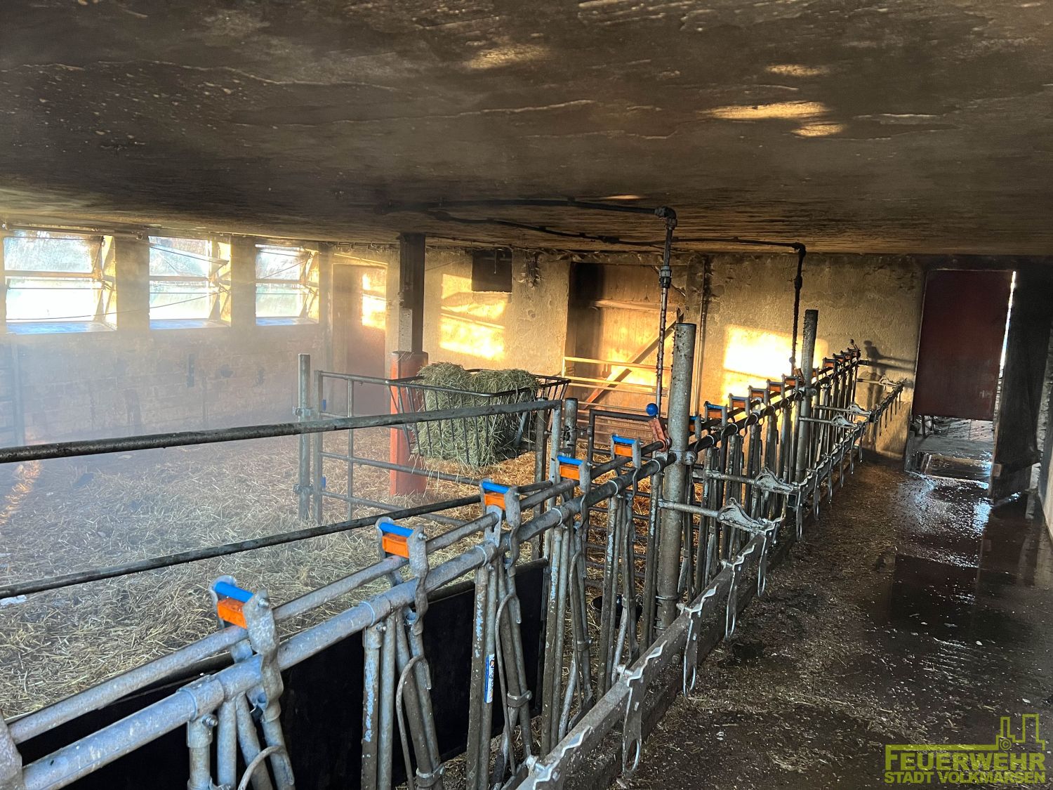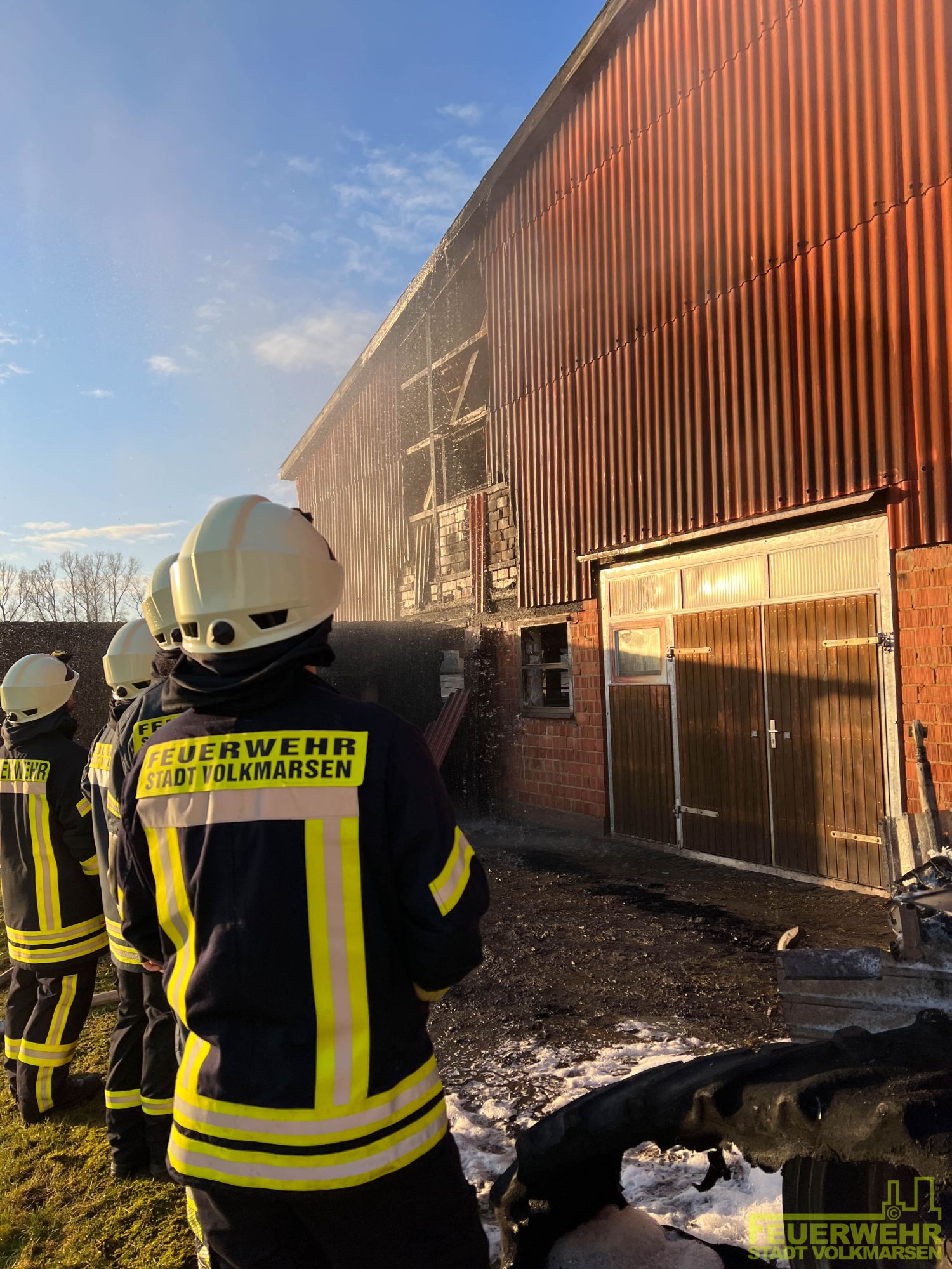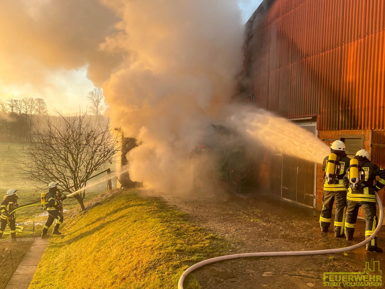 Volkmarsen – Am frühen Donnerstagmorgen wurde die Feuerwehr Volkmarsen gegen 08:40 uhr zu einem Traktor-Brand alarmiert. In Volkmarsen-Külte kam es aus bislang ungeklärter Ursache zu einem Traktorbrand, der sich bereits auf den angrenzenden Kuhstall ausbreitete. Umgehend wurde eine massive Riegelstellung unter Atemschutz aufgebaut, um den angrenzenden Kuhstall, sowie den nahegelegenen Dieseltank zu schützen. Gleichzeitig wurde der Traktorbrand direkt bekämpft. Parallel zum Löschangriff wurden die Kühe vorsichtshalber von der Stallung auf eine angrenzende Weide getrieben, um einen möglichen Kontakt mit Rauchgasen zu vermeiden. Auf Grund der hohen Temperaturen platzen die Reifen des Treckers und die Scheiben der Stallung, so dass sich die ersten Flammen bereits ins innere fraßen. Die gefährdeten Bereiche in der Stallung wurden ebenfalls von einem Atemschutztrupp mit Hilfe der Wärmebildkamera kontrolliert und abgelöscht. Die Wasserversorgung wurde über das nahgelegene Hydrantennetz sichergestellt. Zur Problematik an der Einsatzstelle wurden die Minusgrade, da das Löschwasser sehr schnell auf dem Boden eingefroren ist. Zeitnah war aber auch der Volkmarser Bau- und Instandhaltungsbetrieb mit einem Streufahrzeug zur Stelle. Während den Löscharbeiten wurde eine Feuerwehrkameradin leicht verletzt. Durch das schnelle Eingreifen der rund 60 ehrenamtlichen Kräfte konnte ein größerer Brand mit hohem Sachschaden verhindert werden.