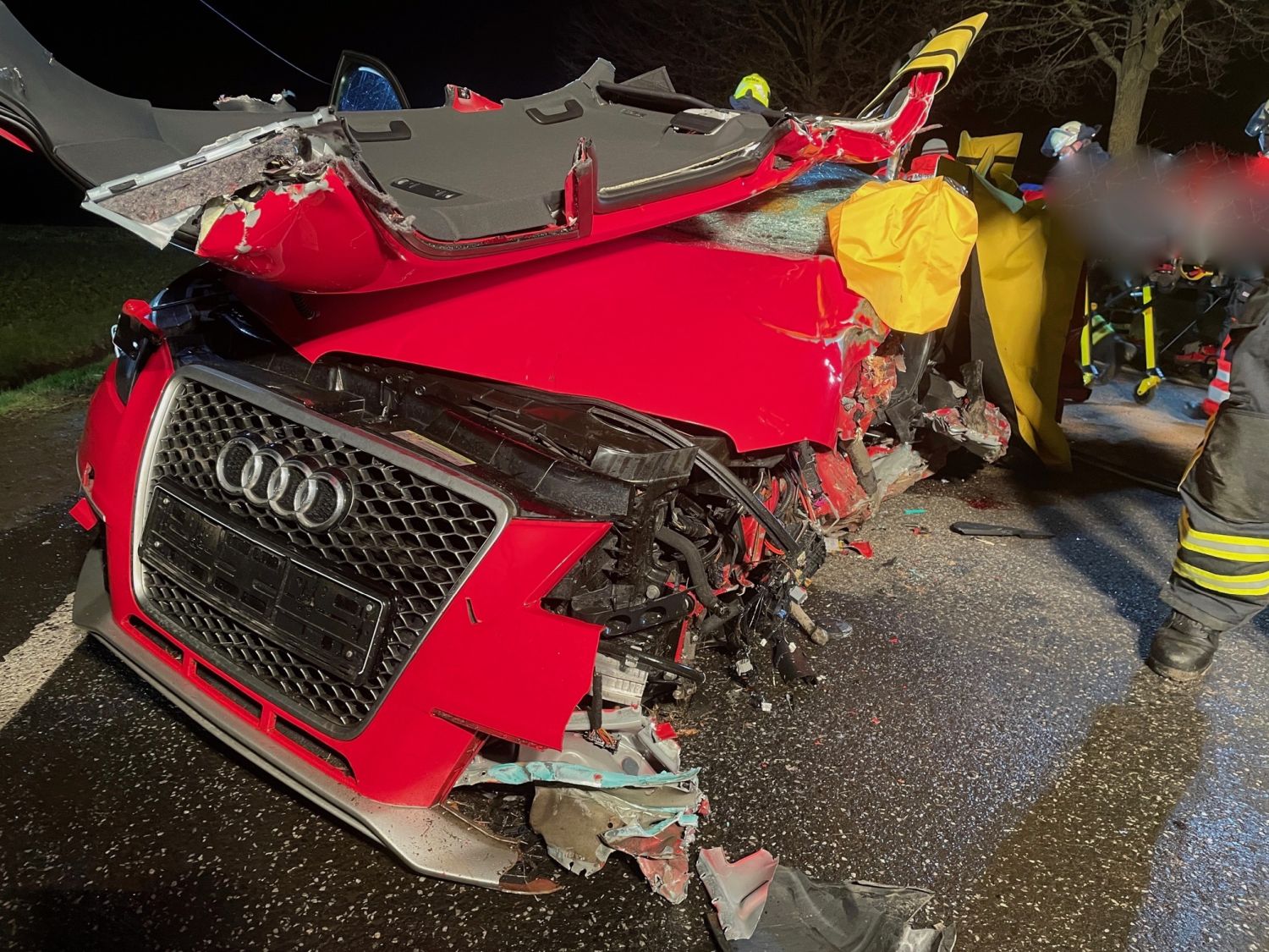 Der Audi wurde auf der Fahrerseite völlig deformiert, der junge Mann im Fußbereich schwer eingeklemmt. Zwei Rettungssätze waren nötig um den Verunfallten aus seiner misslichen Lage zu befreien. Dies gelang den Einsatzkräften der Feuerwehr nach rund einer Stunde. Zusammen mit dem Rettungsdienst wurde der Mann schonend aus seinem Fahrzeug gerettet und im Anschluss in ein Kasseler Krankenhaus gebracht. Am Fahrzeug entstand ein Totalschaden, den die Polizei Melsungen auf rund 25.000 Euro beziffert. Die Bundesstraße war in beide Richtungen für mehrere Stunden voll gesperrt. Der Verkehr wurde weiträumig umgeleitet. Insgesamt waren 40 Einsatzkräfte der Feuerwehren Felsberg, ein Rettungswagen, ein Notarzt sowie die Polizei Melsungen vor Ort im Einsatz.