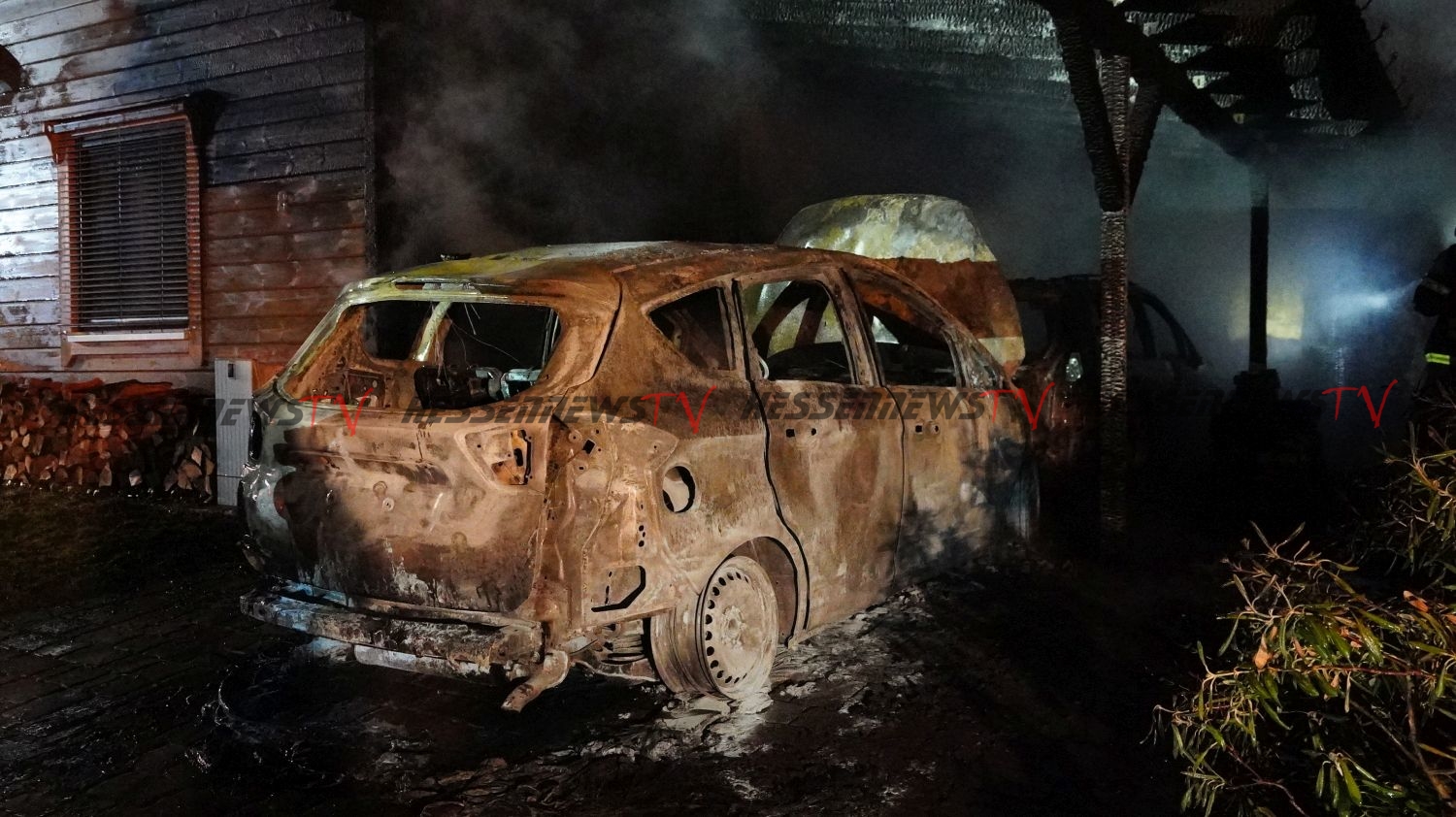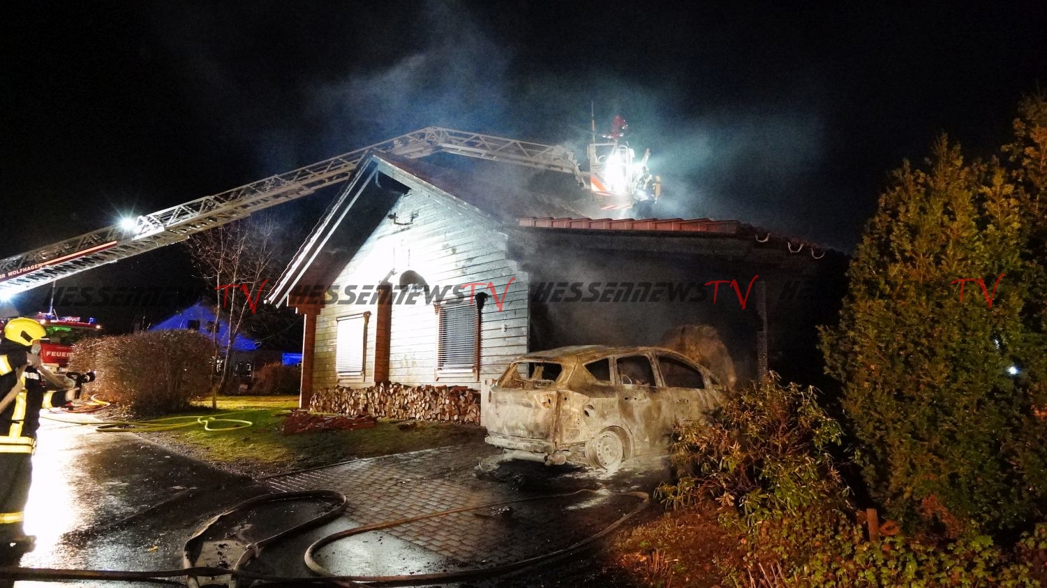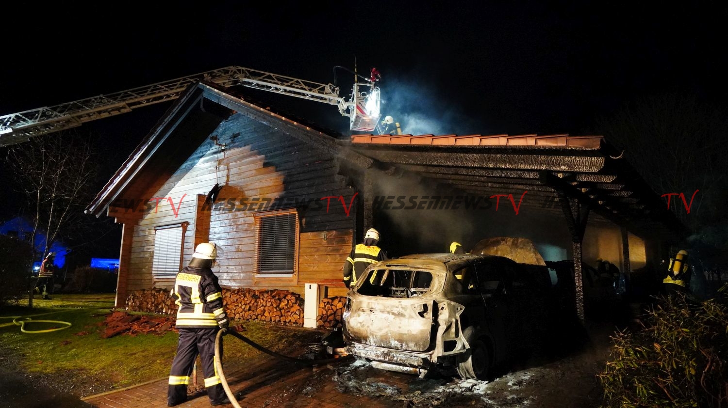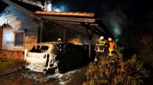 Naumburg – Am Dienstagabend kam es in Naumburg zu einem Gebäudebrand. Als die ersten Einsatzkräfte um kurz nach 20 Uhr in der Staße „Oberer Kronbergweg“ eintrafen, standen bereits zwei Autos unter einem Holzcarport im Vollbrand. Die Flammen griffen bereits auf das Wohnhaus über. Die Alarmierten Einsatzkräfte aus Naumburg mit Unterstützung der Drehleiter aus Wolfhagen konnten ein Vollbrand des Wohnhauses verhindern. Die Bewohner konnten rechtzeitig das Haus verlass und blieben unverletzt. Das Haus ist derzeit unbewohnbar.Nach ersten Ermittlungen, soll das Feuer an einem Vorderreifen ausgebrochen sein. Wie es zu dem Brand kommen konnte, ist bislang noch unklar. Die Polizei hat ihre Ermittlungen vor Ort aufgenommen.