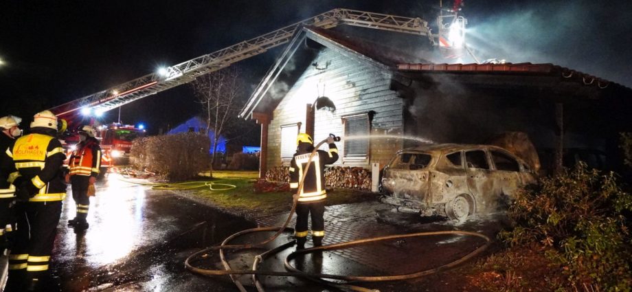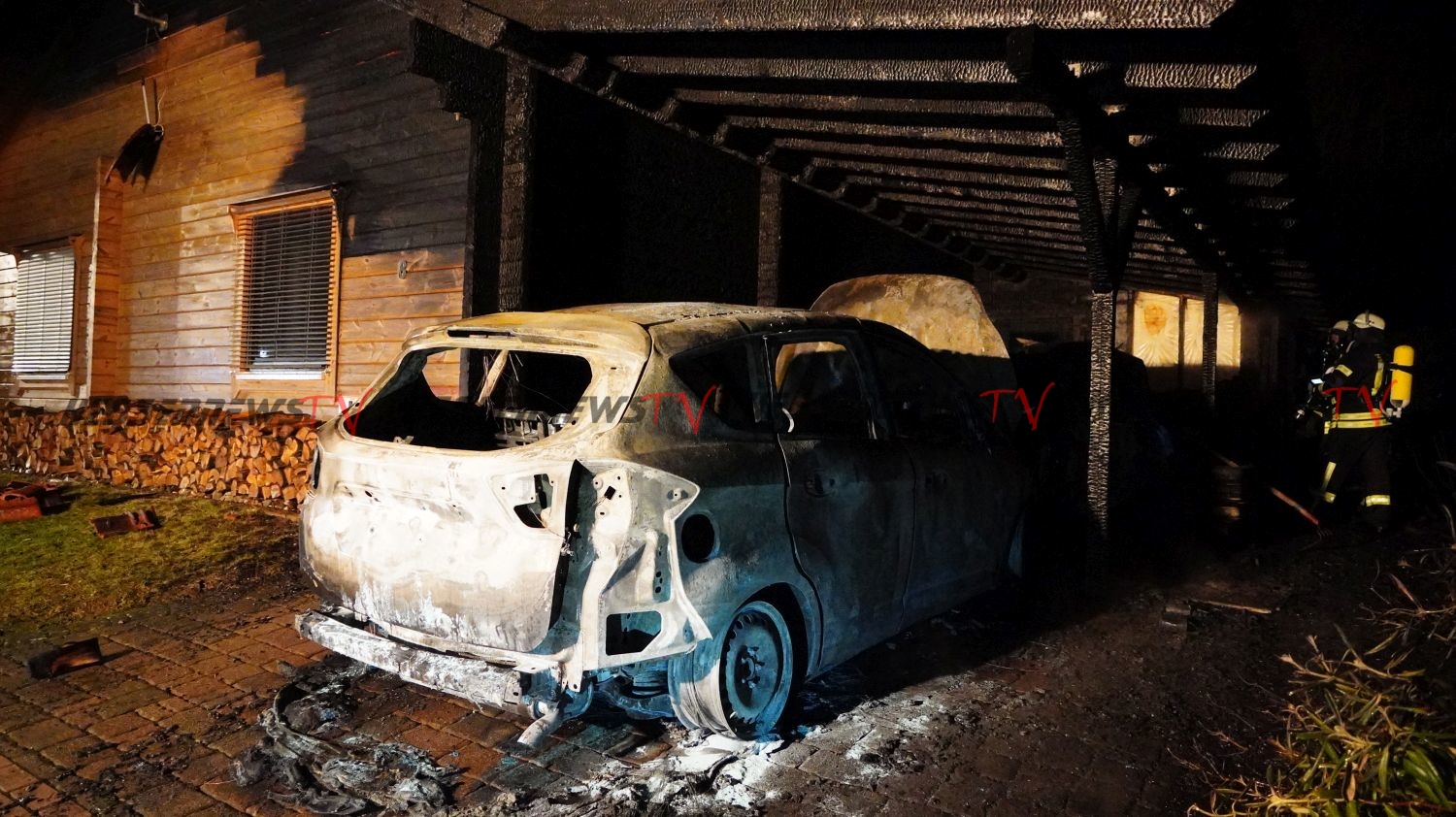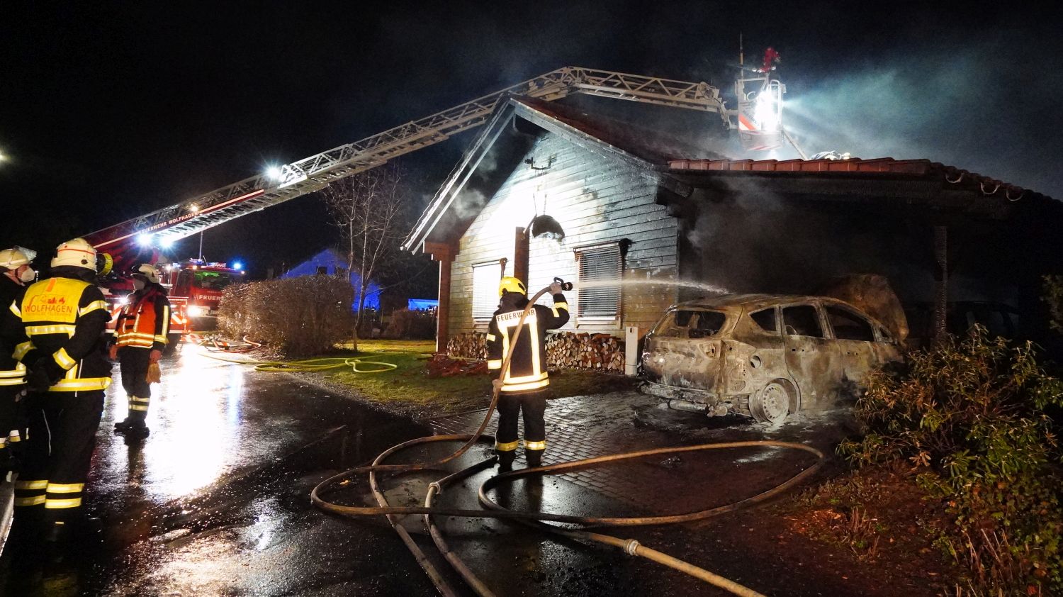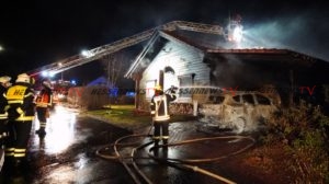 Naumburg – Am Dienstagabend kam es in Naumburg zu einem Gebäudebrand. Als die ersten Einsatzkräfte um kurz nach 20 Uhr in der Staße „Oberer Kronbergweg“ eintrafen, standen bereits zwei Autos unter einem Holzcarport im Vollbrand. Die Flammen griffen bereits auf das Wohnhaus über. Die Alarmierten Einsatzkräfte aus Naumburg mit Unterstützung der Drehleiter aus Wolfhagen konnten ein Vollbrand des Wohnhauses verhindern. Die Bewohner konnten rechtzeitig das Haus verlass und blieben unverletzt. Das Haus ist derzeit unbewohnbar.Nach ersten Ermittlungen, soll das Feuer an einem Vorderreifen ausgebrochen sein. Wie es zu dem Brand kommen konnte, ist bislang noch unklar. Die Polizei hat ihre Ermittlungen vor Ort aufgenommen.