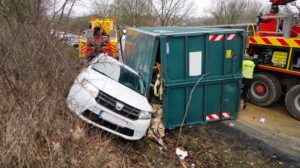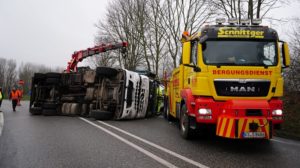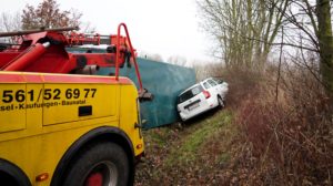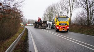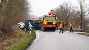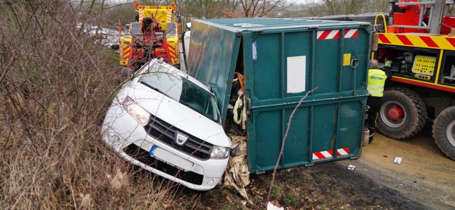 Kassel – Auf der A49 in Fahrtrichtung Marburg kam es am Donnerstagmorgen gegen 08:20 Uhr zu einem Verkehrsunfall mit einem Container-LKW und einem PKW. Der 25-jährige LKW-Fahrer war auf der A49 unterwegs und fuhr die Abfahrt Kassel-Industriepark ab. Aus bislang noch unbekannten Gründen kippte der LKW in einer langgezogenen Rechtskurve um. Der 27-jährige Fahrer eines PKW, der gerade auf die A49 auffahren wollte, bemerkte wohl noch im letzten Moment den kippenden LKW und weichte geistesgegenwärtig nach rechts in den Grünstreifen aus. Der Container krachte zwar in die linke Fahrzeugseite des Dacia, der Fahrer aus Kassel kam aber mit einem Schrecken davon und blieb unverletzt. Auch der LKW-Fahrer hatte sich augenscheinlich nicht verletzt, wurde aber vorsorglich von einem Rettungswagen zur Untersuchung in ein Krankenhaus gebracht. Nach Einschätzung der Autobahnpolizisten wäre der Container ohne Ausweichen des Autofahrers vermutlich auf dem Dach des Dacia gelandet und der Unfall somit deutlich schwerer ausgegangen. Die Ermittlungen, ob der Container auf dem LKW möglicherweise nicht richtig gesichert war, dauern an. Für die aufwendige Bergung war die Auf- und Abfahrt für mehrere Stunden voll gesperrt. Der Sachschaden wird auf rund 60.000 Euro am LKW und an dem Container geschätzt. Mit ca. 10.000 Euro schlägt der Schaden an dem Dacia zu Buche.