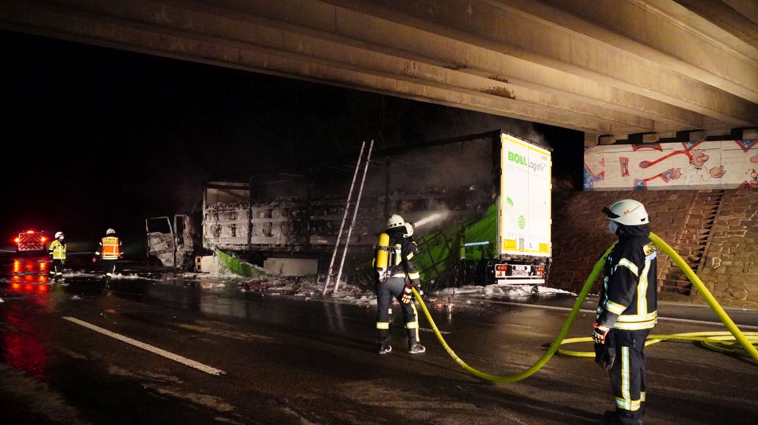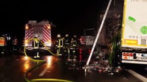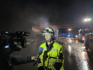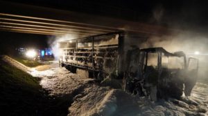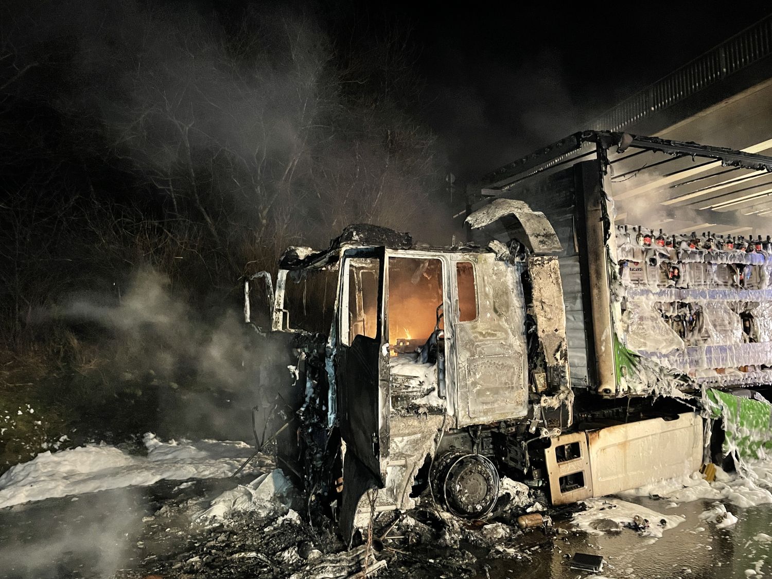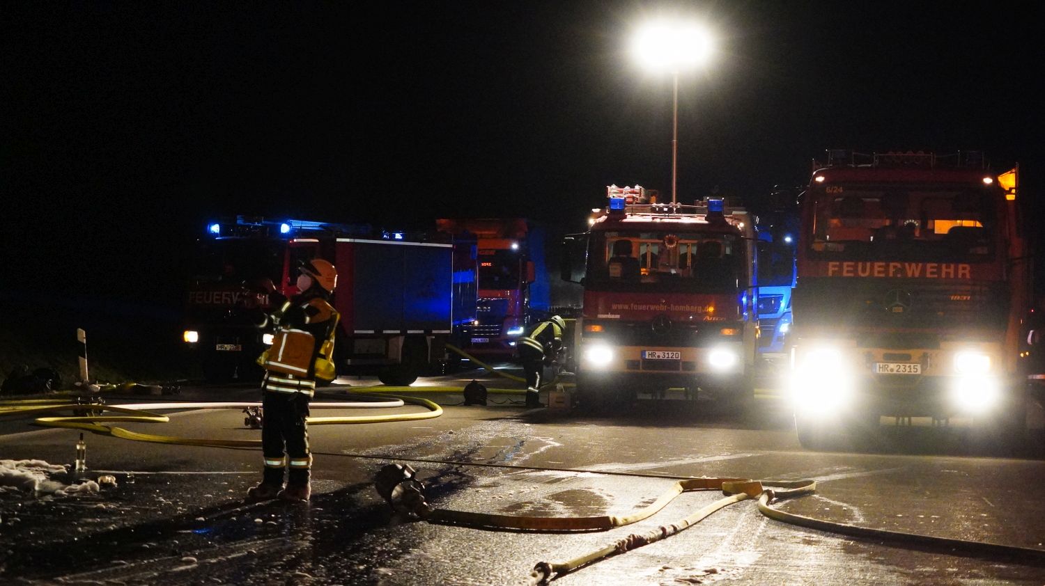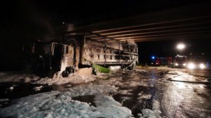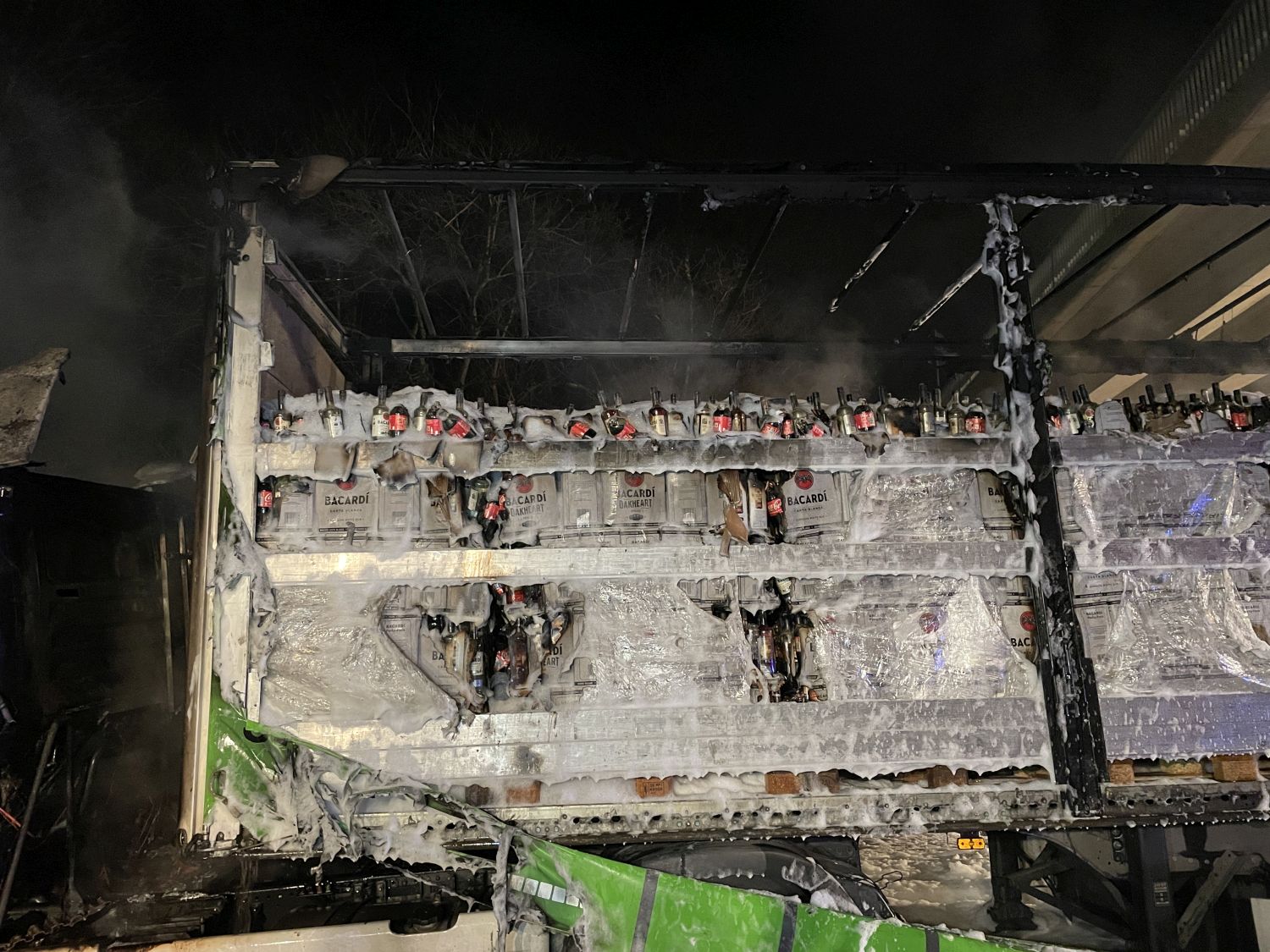 Homberg (Efze) – Auf der A7 kam es in der Nacht zum Freitag zu einem LKW-Brand zwischen der Rastanlage Hasselberg und Malsfeld. Als die alarmierte Feuerwehr aus Homberg (Efze) um kuez nach 2 Uhr am Einsatzort eintraf, stand die Sattelzugmaschine, beladen mit Bacardi und Cola bereits im Vollbrand. Allerdings war diesmal nicht der LKW mit seiner Ladung ein Problem, sondern der LKW stand direkt unter einer Autobahnbrücke. Diese musste vor den Flammen geschützt werden. Um ausreichend Wasser an der Einsatzstelle zu haben, wurde mit zwei Tanklöschfahrzeugen ein Pendelverkehr eingerichtet. Die Nachlöscharbeiten zogen sich über stunden, da der LKW komplett entladen werden musste. Wie hoch der Sachschaden ist, ist noch unklar. Auch ob die Autobahnbrücke Schaden genommen hat, hier muss jetzt die Statik überprüft werden. Dafür wurde auch die L3428 zwischen Oberbeisheim und Sipperhausen, die über die Autobahn geht, voll geperrt.