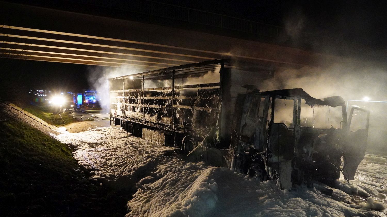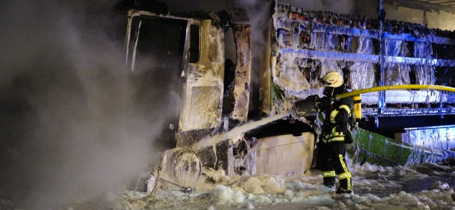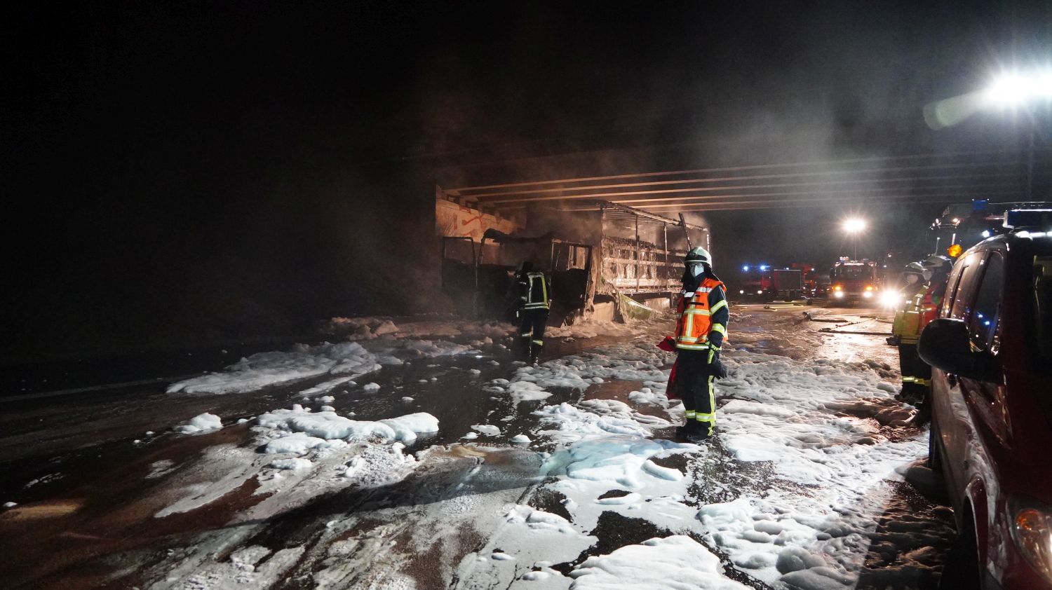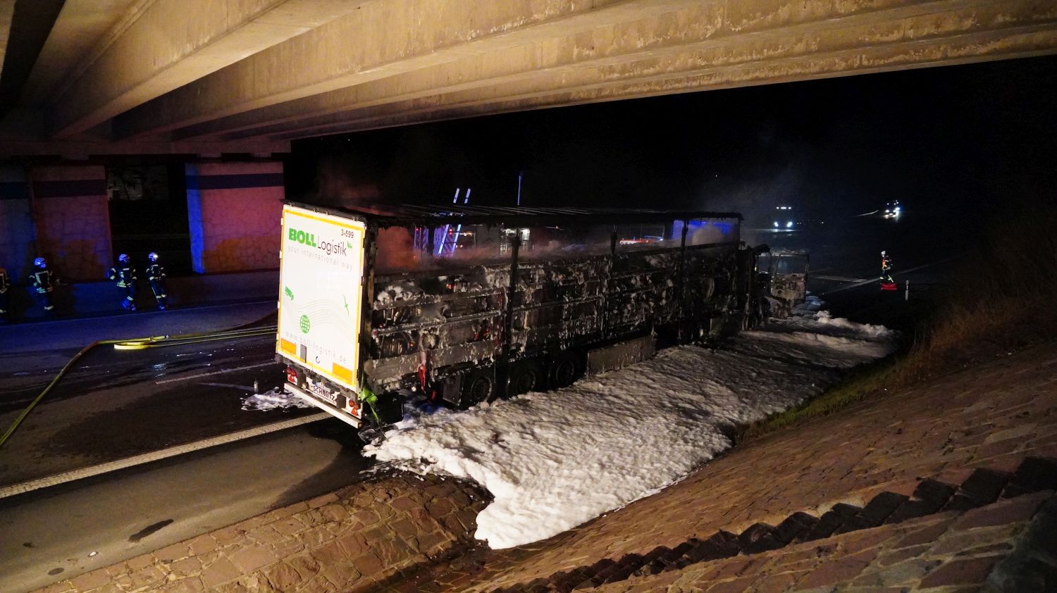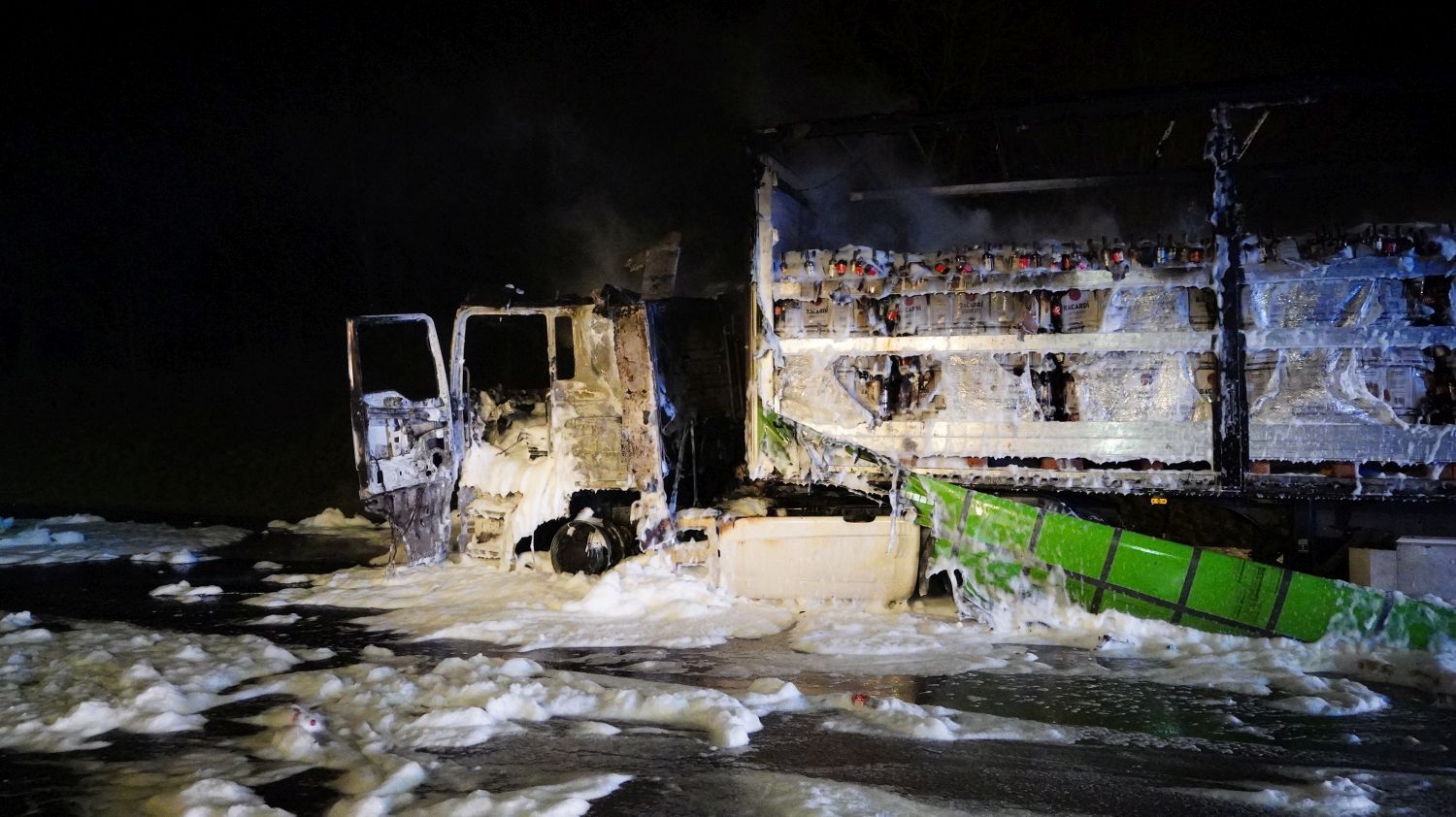 Homberg (Efze) – Auf der A7 kam es in der Nacht zum Freitag zu einem LKW-Brand zwischen der Rastanlage Hasselberg und Malsfeld. Als die alarmierte Feuerwehr aus Homberg (Efze) um kuez nach 2 Uhr am Einsatzort eintraf, stand die Sattelzugmaschine, beladen mit Bacardi und Cola bereits im Vollbrand. Allerdings war diesmal nicht der LKW mit seiner Ladung ein Problem, sondern der LKW stand direkt unter einer Autobahnbrücke. Diese musste vor den Flammen geschützt werden. Um ausreichend Wasser an der Einsatzstelle zu haben, wurde mit zwei Tanklöschfahrzeugen ein Pendelverkehr eingerichtet. Die Nachlöscharbeiten zogen sich über stunden, da der LKW komplett entladen werden musste. Wie hoch der Sachschaden ist, ist noch unklar. Auch ob die Autobahnbrücke Schaden genommen hat, hier muss jetzt die Statik überprüft werden. Dafür wurde auch die L3428 zwischen Oberbeisheim und Sipperhausen, die über die Autobahn geht, voll geperrt.