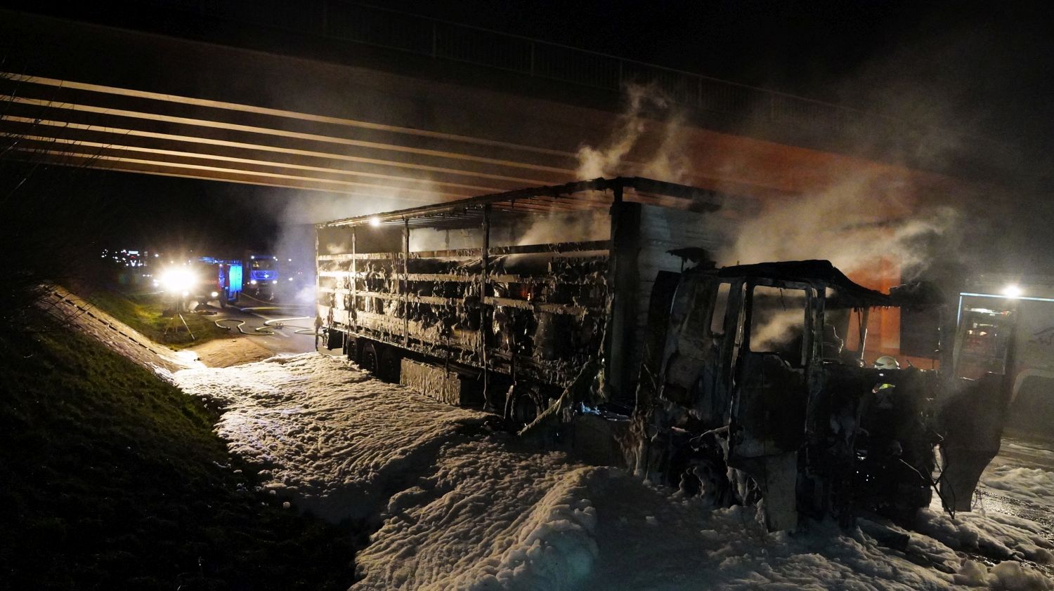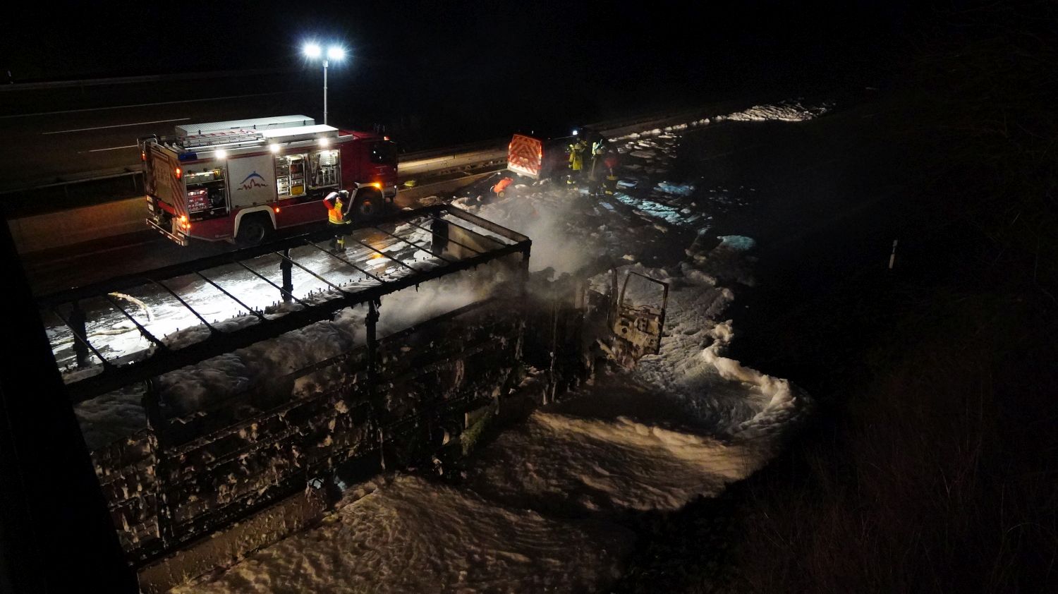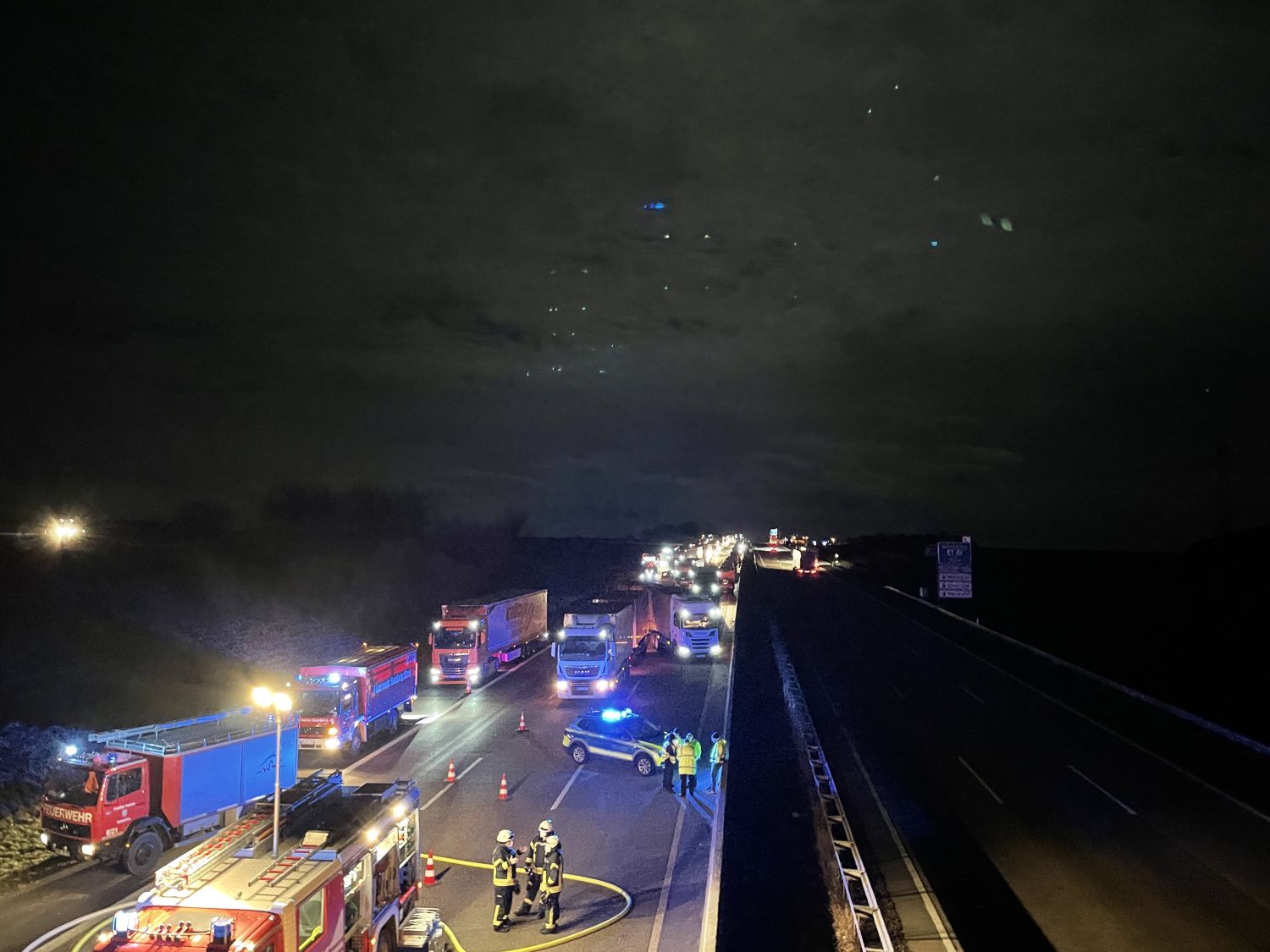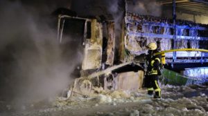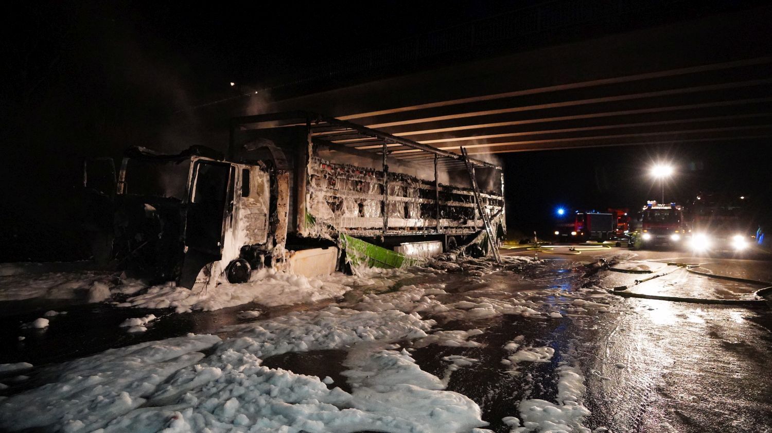 Homberg (Efze) – Auf der A7 kam es in der Nacht zum Freitag zu einem LKW-Brand zwischen der Rastanlage Hasselberg und Malsfeld. Als die alarmierte Feuerwehr aus Homberg (Efze) um kuez nach 2 Uhr am Einsatzort eintraf, stand die Sattelzugmaschine, beladen mit Bacardi und Cola bereits im Vollbrand. Allerdings war diesmal nicht der LKW mit seiner Ladung ein Problem, sondern der LKW stand direkt unter einer Autobahnbrücke. Diese musste vor den Flammen geschützt werden. Um ausreichend Wasser an der Einsatzstelle zu haben, wurde mit zwei Tanklöschfahrzeugen ein Pendelverkehr eingerichtet. Die Nachlöscharbeiten zogen sich über stunden, da der LKW komplett entladen werden musste. Wie hoch der Sachschaden ist, ist noch unklar. Auch ob die Autobahnbrücke Schaden genommen hat, hier muss jetzt die Statik überprüft werden. Dafür wurde auch die L3428 zwischen Oberbeisheim und Sipperhausen, die über die Autobahn geht, voll geperrt.