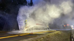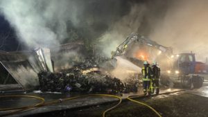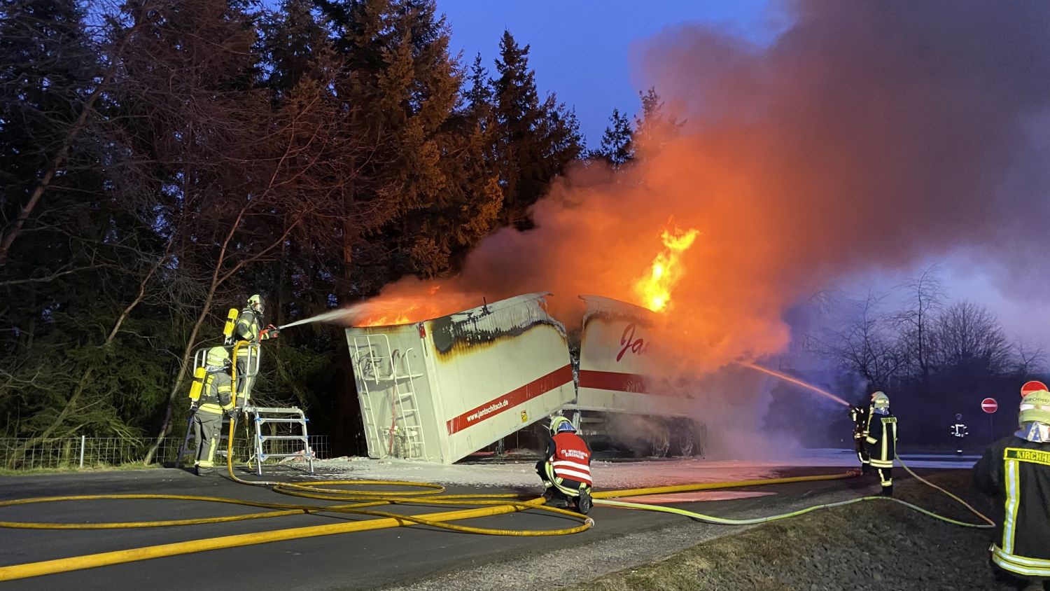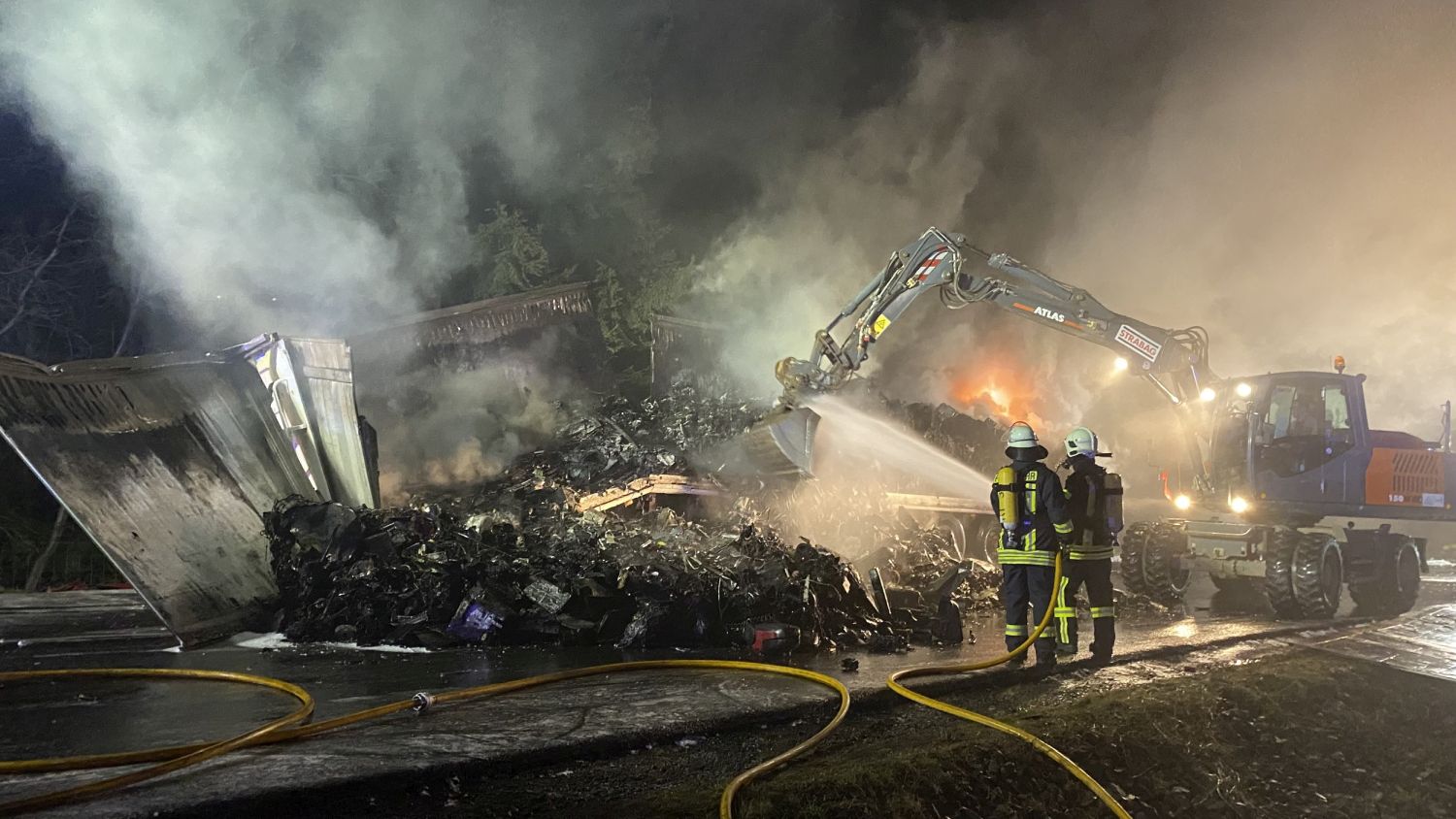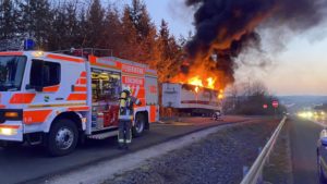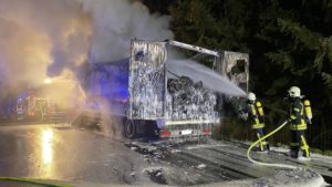 Bad Hersfeld – Am Donnerstagabend 18.20 Uhr brannte auf einem Parkplatz der A7 zwischen dem Kirchheimer Dreieck und Bad Hersfeld-West in Fahrtrichtung Norden ein mit Elektroschrott und Batterien beladener Sattelauflieger. Der Fahrer wurde nach ersten Informationen von Verkehrsteilnehmern darauf aufmerksam gemacht, dass Flammen aus seinem Auflieger schlagen. Daraufhin lenkte der Fahrer seinen Sattelzug auf einen Parkplatz neben der Autobahn. Er schaffte es gerade noch, die Zugmaschine abzukoppeln, als der Muldenauflieger auch schon im Vollbrand stand. Schon bei der Anfahrt in Kirchheim konnten die Einsatzkräfte der Feuerwehr Kirchheim eine dicke, einhundert Meter hohe und schwarze Rauchsäule sehen und alarmierten sofort weitere Kräfte nach. Trotz massiven Löscheinsatzes über mehrere Rohre brennt die Ladung nunmehr bereits seit mehreren Stunden. Ein Radschaufellader ist zwischenzeitlich zur Einsatzstelle gebracht worden, der die Muldenwände auseinandergerissen hat und die weiterhin brennende Ladung von der Ladefläche zieht.
