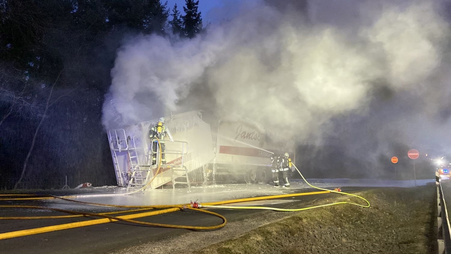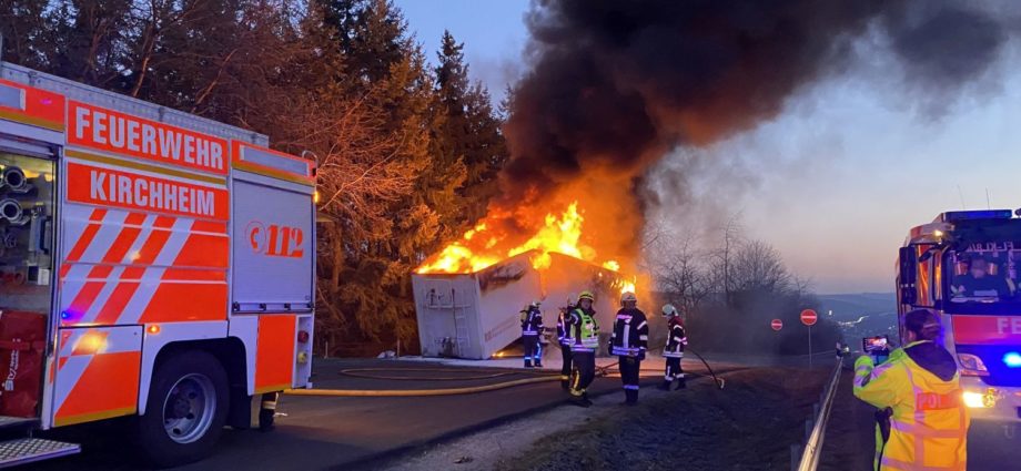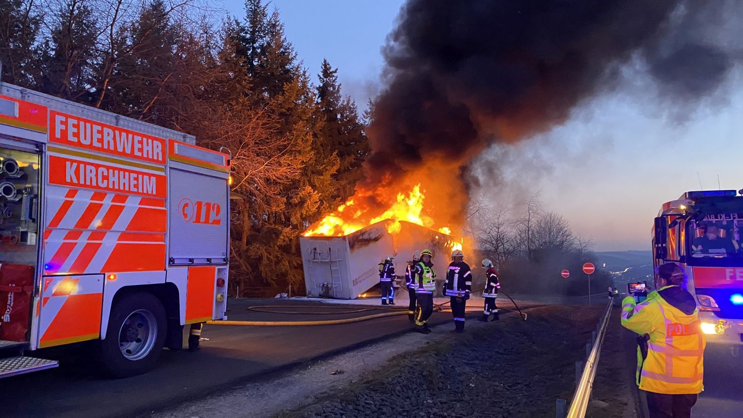 Als Ursache für den Brand wird von einer Selbstentzündung alter Batterien ausgegangen. Durch die hohen Anteile an Aluminium rechnen die Einsatzkräfte noch mit einer längeren Einsatzzeit. Dramatisch wurde es während der Löscharbeiten, als der brennende Auflieger plötzlich in der Mitte mit einer hohen Stichflamme durchbrach. Zum Glück konnten sich alle Feuerwehrleute, die zu dem Zeitpunkt am Auflieger waren, in Sicherheit bringen. Nach ersten Informationen rechnet die Feuerwehr nicht vor Mitternacht mit einem Ende der Löscharbeiten, zumal die Ladung auch noch auseinandergezogen werden muss um auch die letzten Glutnester abzulöschen. Wie der Einsatzleiter mitteilte, wurden bereits in den ersten zwei Stunden über 20.000 Liter Wasser verbraucht. Hierbei kam auch ein Wechselladerfahrzeug mit einem 10.000 Liter Tank zum Einsatz. Zur besseren Löschwirkung wurde ein Spezialschaum verwendet, der durch seine kühlende Filmbildung einen besonders hohen Löscheffekt hat. Während der Löscharbeiten musste in Fahrtrichtung Norden ein von drei Fahrstreifen gesperrt werden. Die Anwohner von Kirchheim wurden über den giftigen Rauch informiert und gebeten Fenster und Türen geschlossen zu halten. Über die Höhe des Sachschadens wird von der Polizei mit rund 45.000 Euro angegeben. Für die Bergung wurde eine Spezialfirma beauftragt.