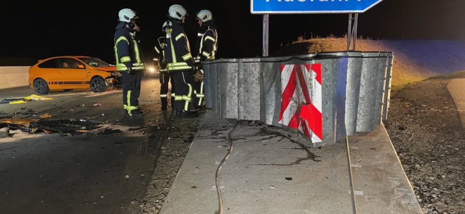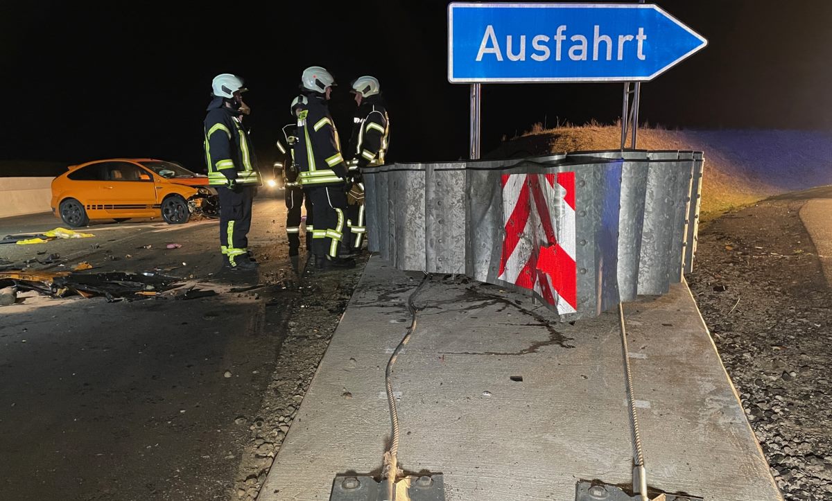 Neuental – Zwei verletzte Personen und ein Sachschaden in Höhe von rund 30.000 Euro ist die Bilanz eines Verkehrsunfalls am frühen Sonntagmorgen auf der A 49 im Bereich der Anschlussstelle Neuental. Ein PKW kollidierte zunächst mit einer Fahrbahnbegrenzung und prallte an der Autobahnabfahrt in den dortigen Aufprallschutz. Ein 40-jähriger Mann aus Stadtallendorf befuhr am frühen Sonntagmorgen die A49 von Kassel kommend in Richtung Neuental. Aus bislang ungeklärten Gründen kollidierte der Mann am derzeitigen Autobahnende erst mit einer Fahrbahnbegrenzung und krachte dann im Bereich der Autobahnabfahrt Neuental mit seinem PKW frontal in einen Aufprallschutz. Durch die hohe Wucht des Aufpralls wurde der PKW von den Tonnen abgewiesen und der Motor herausgerissen. Beides landete auf dem bislang noch nicht freigegebene Autobahnteilstück in Richtung Schwalmstadt. Die beiden Insassen, der 40-jährige Fahrer aus Stadtallendorf sowie sein 45-jähriger Beifahrer aus Neustadt, wurden durch den Unfall verletzt und kamen in Krankenhäuser nach Fritzlar und Schwalmstadt. Im Einsatz waren zwei Rettungswagen, eine Notärztin, die Feuerwehren aus Jesberg und Neuental, die Polizei Homberg sowie die Autobahnpolizei Baunatal. Die Einsatzleitung hatte der stellvertretende Gemeindebrandisnspektor von Neuental, Alexander Schrammel. (mpu)