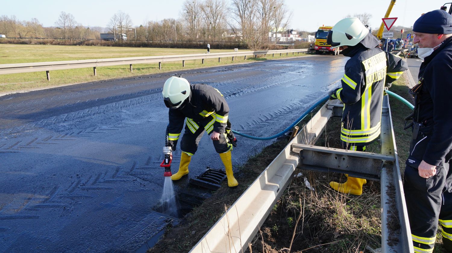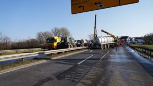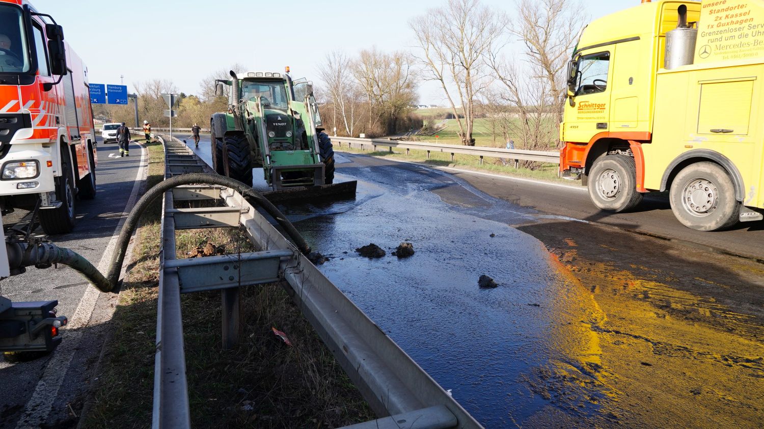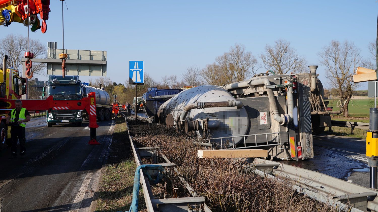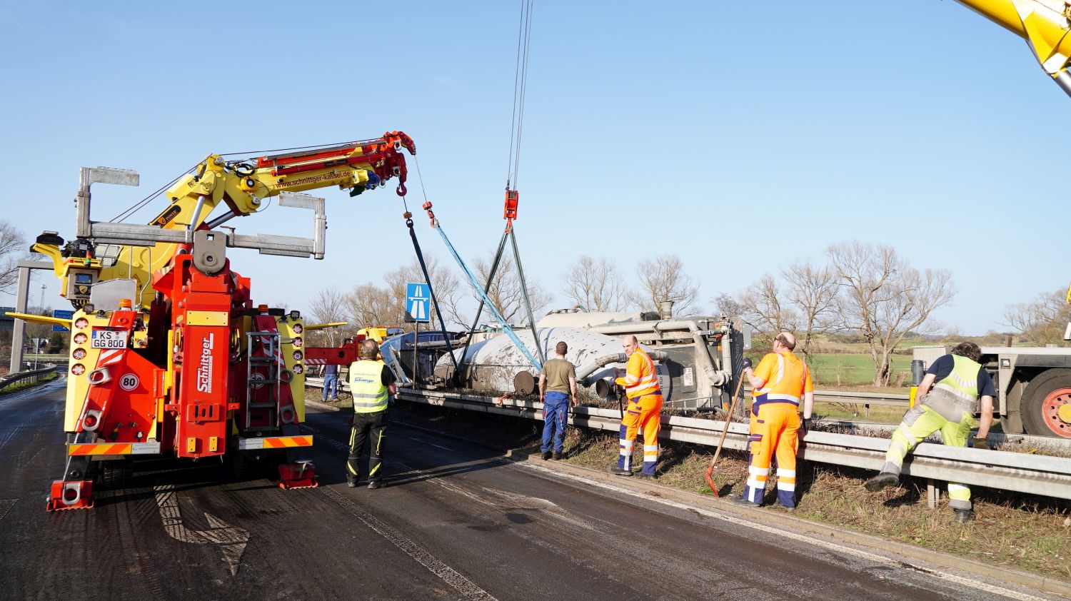 Kaufungen-Papierfabrik – An der Kreuzung der B 7 und der Autobahnauffahrt Kassel-Ost ist gegen 14:10 Uhr ein Lkw umgekippt. Das Fahrzeug war offenbar aus Richtung Kaufungen gekommen, wollte an der Kreuzung nach rechts auf die Autobahn abbiegen und ist aus noch unbekannten Gründen umgekippt. Der Fahrer wurde glücklicherweise nicht schwerer verletzt und wurde vorsorglich von den Rettungskräften versorgt. Der Silo-Lkw hat nach derzeitigen Erkenntnissen Gärreste aus einer Biogasanlage geladen, wobei die Gülle ausgelaufen ist und großflächig die Fahrbahn verunreinigt hat. Aus diesem Grund musste die Autobahnauf und Abfahrt für mehrere Stunden voll gesperrt werden. Die restliche Ladung musste aus dem Anhänger abgesaugt werden. Es wird nachberichtet.