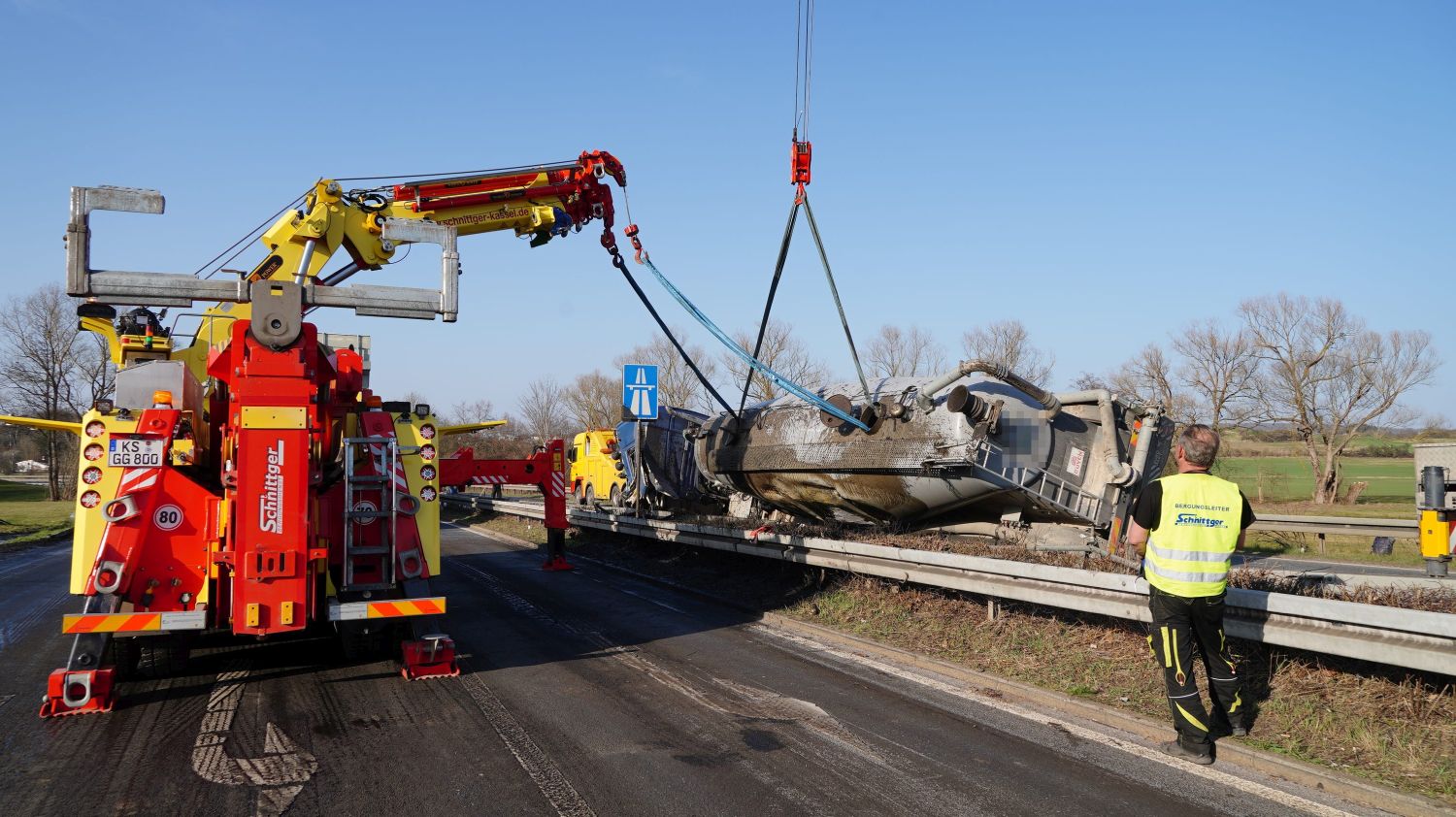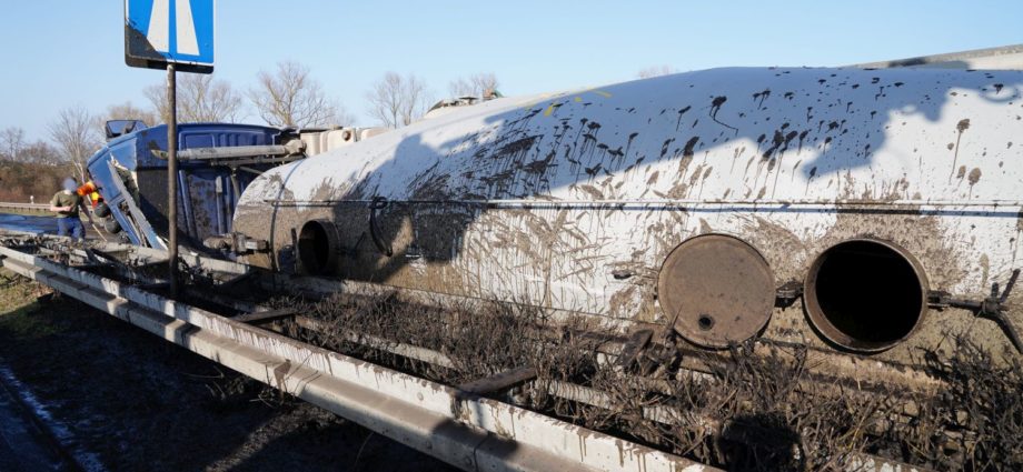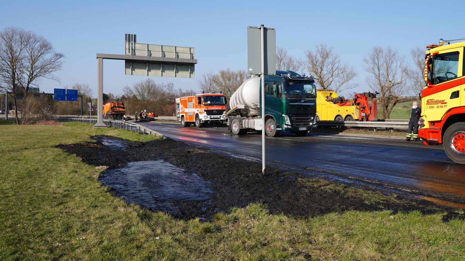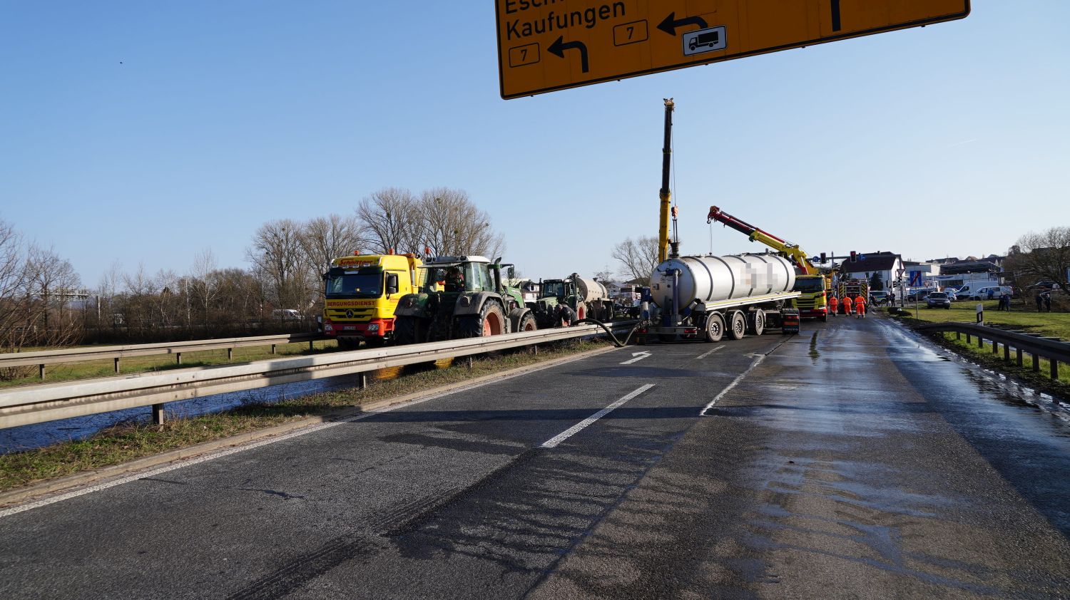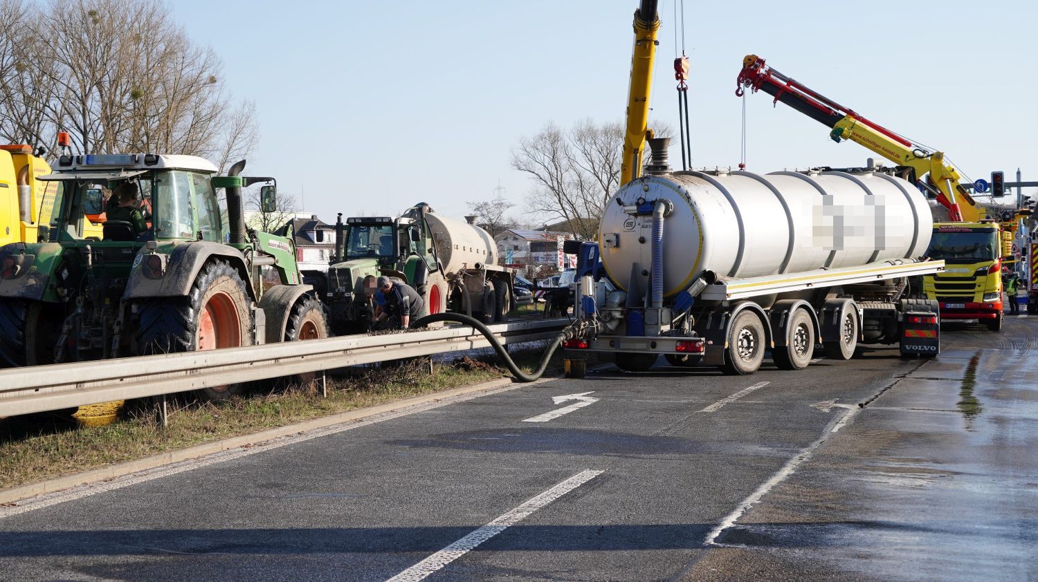 Kaufungen-Papierfabrik – An der Kreuzung der B 7 und der Autobahnauffahrt Kassel-Ost ist gegen 14:10 Uhr ein Lkw umgekippt. Das Fahrzeug war offenbar aus Richtung Kaufungen gekommen, wollte an der Kreuzung nach rechts auf die Autobahn abbiegen und ist aus noch unbekannten Gründen umgekippt. Der Fahrer wurde glücklicherweise nicht schwerer verletzt und wurde vorsorglich von den Rettungskräften versorgt. Der Silo-Lkw hat nach derzeitigen Erkenntnissen Gärreste aus einer Biogasanlage geladen, wobei die Gülle ausgelaufen ist und großflächig die Fahrbahn verunreinigt hat. Aus diesem Grund musste die Autobahnauf und Abfahrt für mehrere Stunden voll gesperrt werden. Die restliche Ladung musste aus dem Anhänger abgesaugt werden. Es wird nachberichtet.