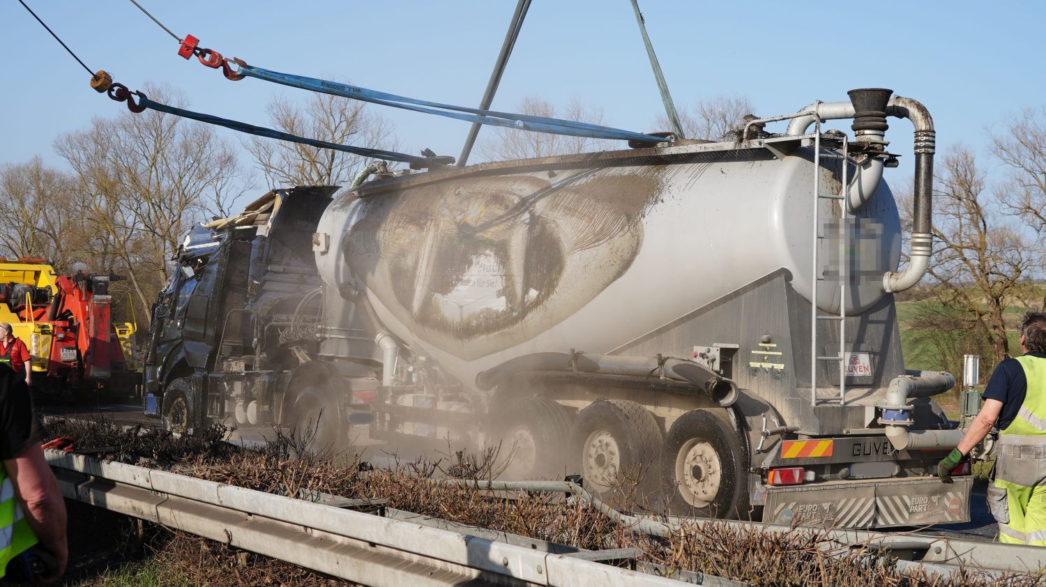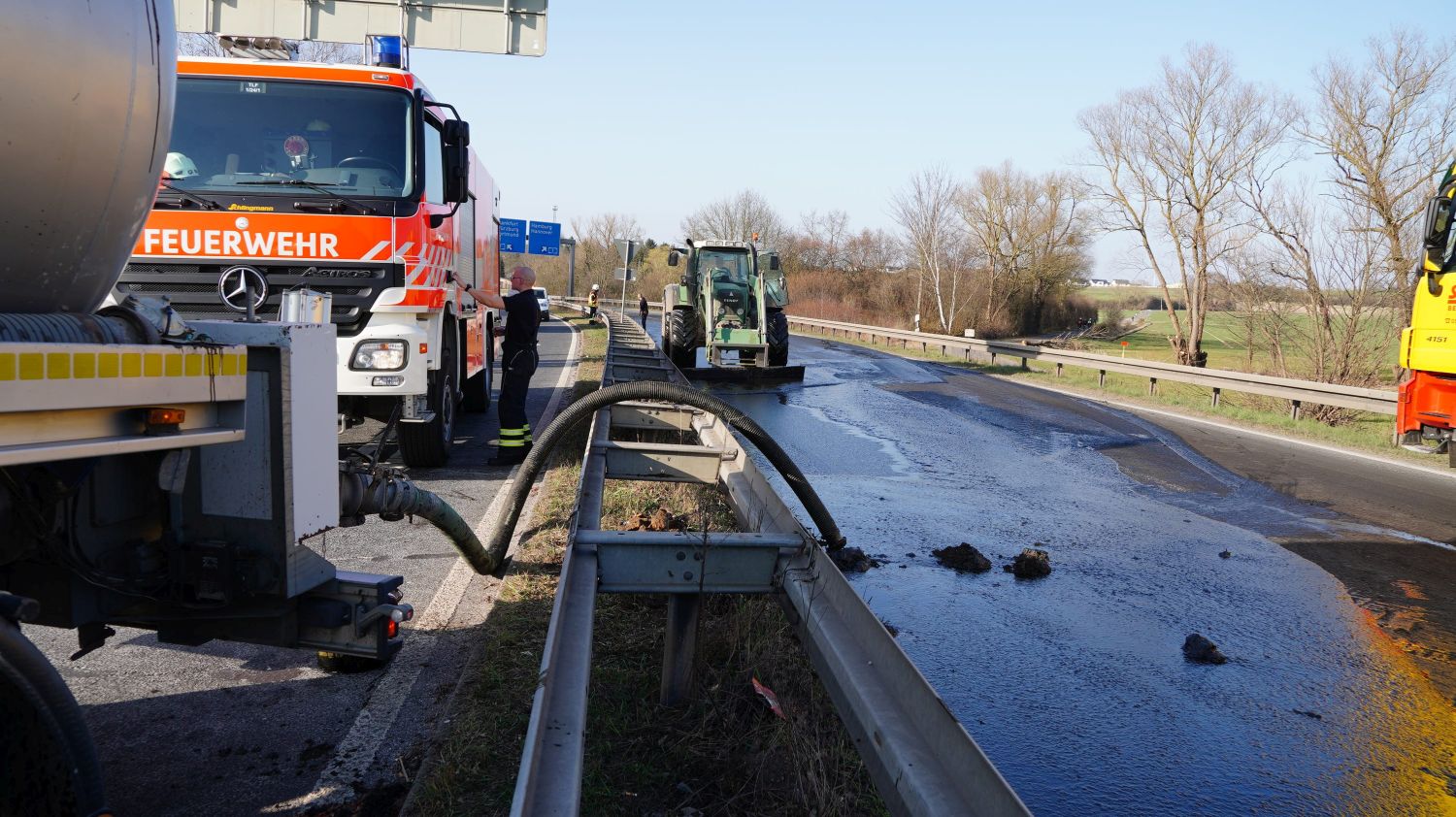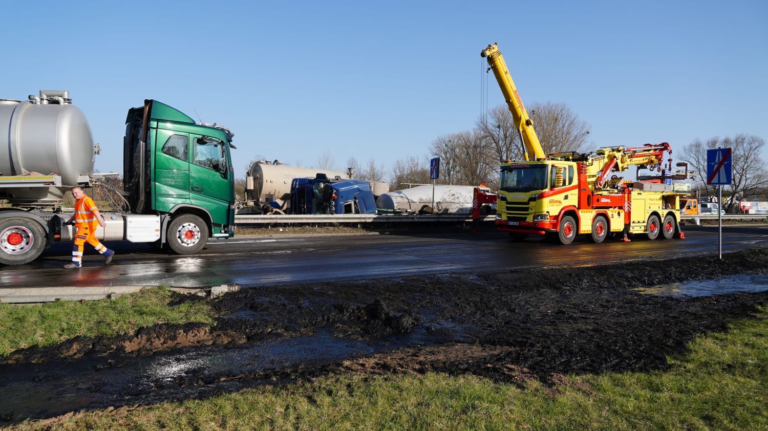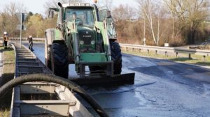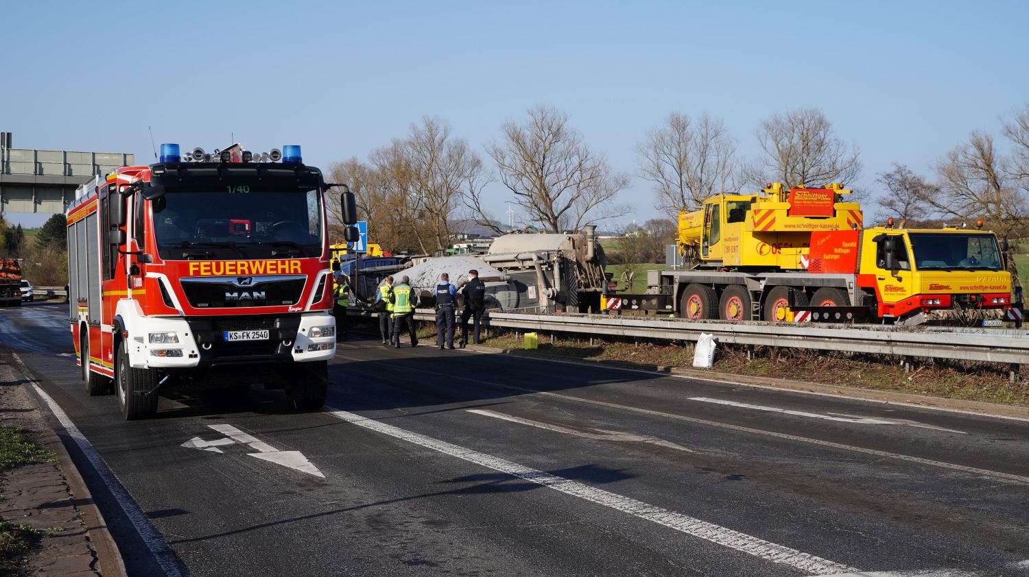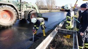 Kaufungen-Papierfabrik – An der Kreuzung der B 7 und der Autobahnauffahrt Kassel-Ost ist gegen 14:10 Uhr ein Lkw umgekippt. Das Fahrzeug war offenbar aus Richtung Kaufungen gekommen, wollte an der Kreuzung nach rechts auf die Autobahn abbiegen und ist aus noch unbekannten Gründen umgekippt. Der Fahrer wurde glücklicherweise nicht schwerer verletzt und wurde vorsorglich von den Rettungskräften versorgt. Der Silo-Lkw hat nach derzeitigen Erkenntnissen Gärreste aus einer Biogasanlage geladen, wobei die Gülle ausgelaufen ist und großflächig die Fahrbahn verunreinigt hat. Aus diesem Grund musste die Autobahnauf und Abfahrt für mehrere Stunden voll gesperrt werden. Die restliche Ladung musste aus dem Anhänger abgesaugt werden. Es wird nachberichtet.